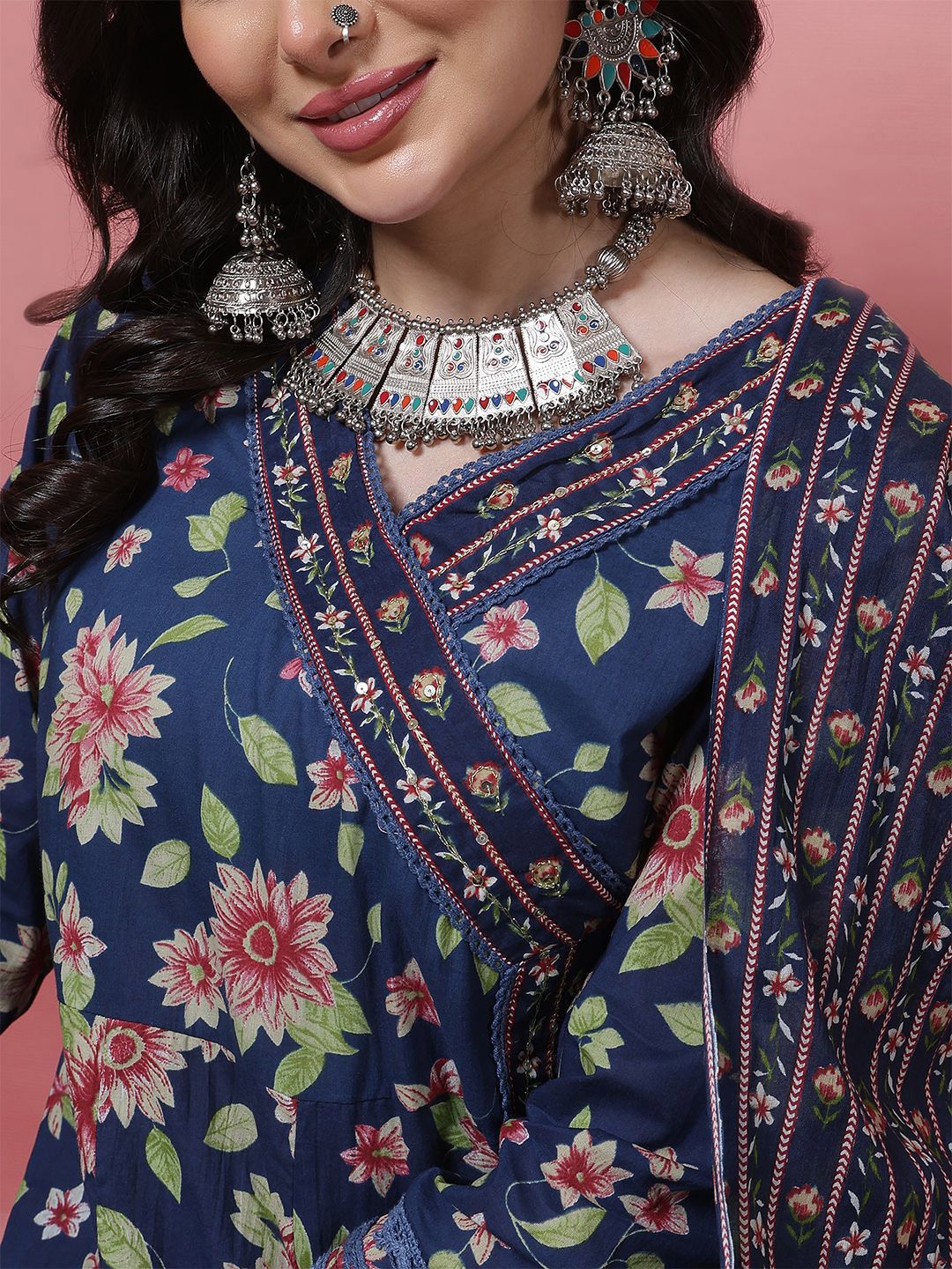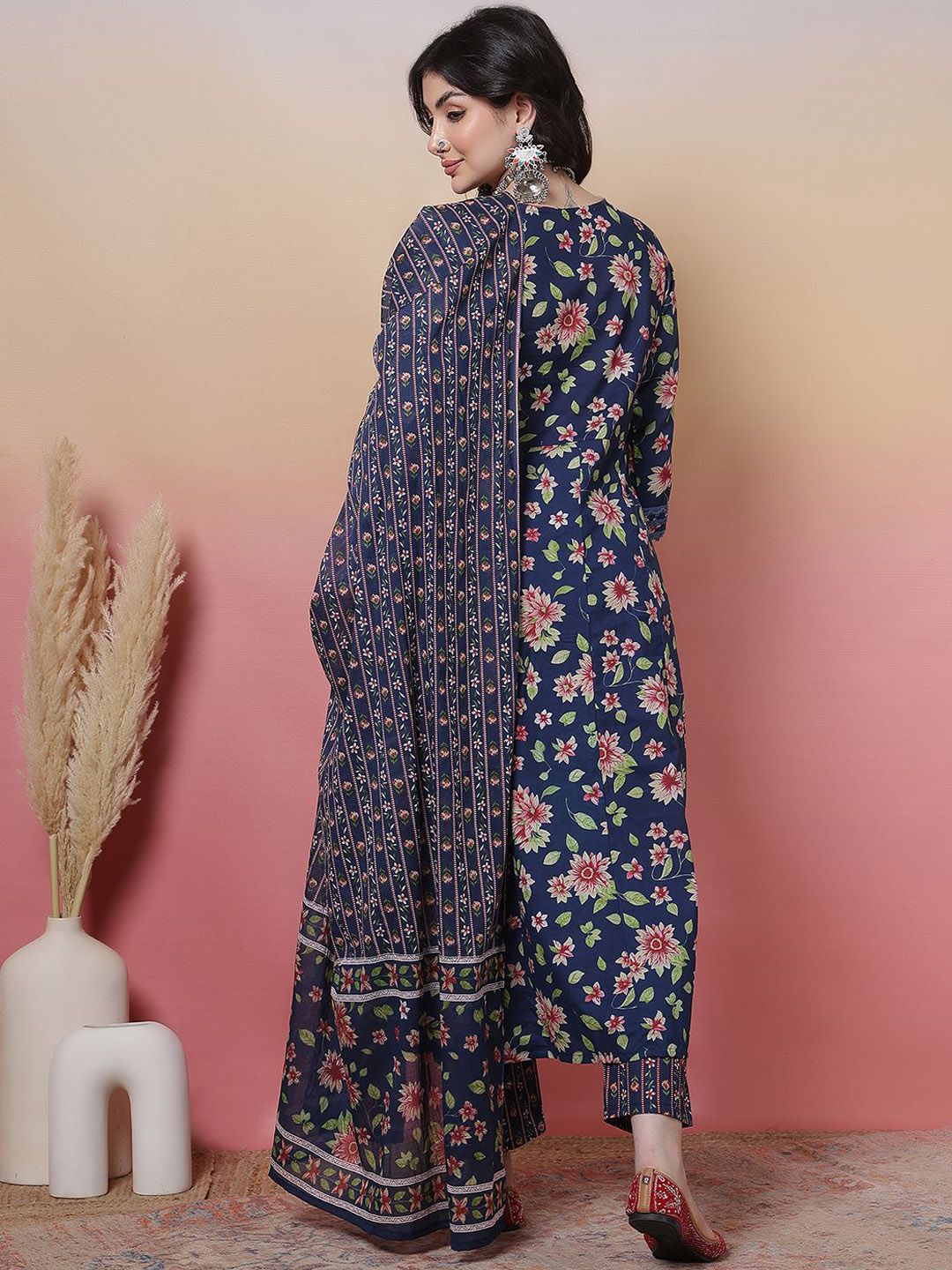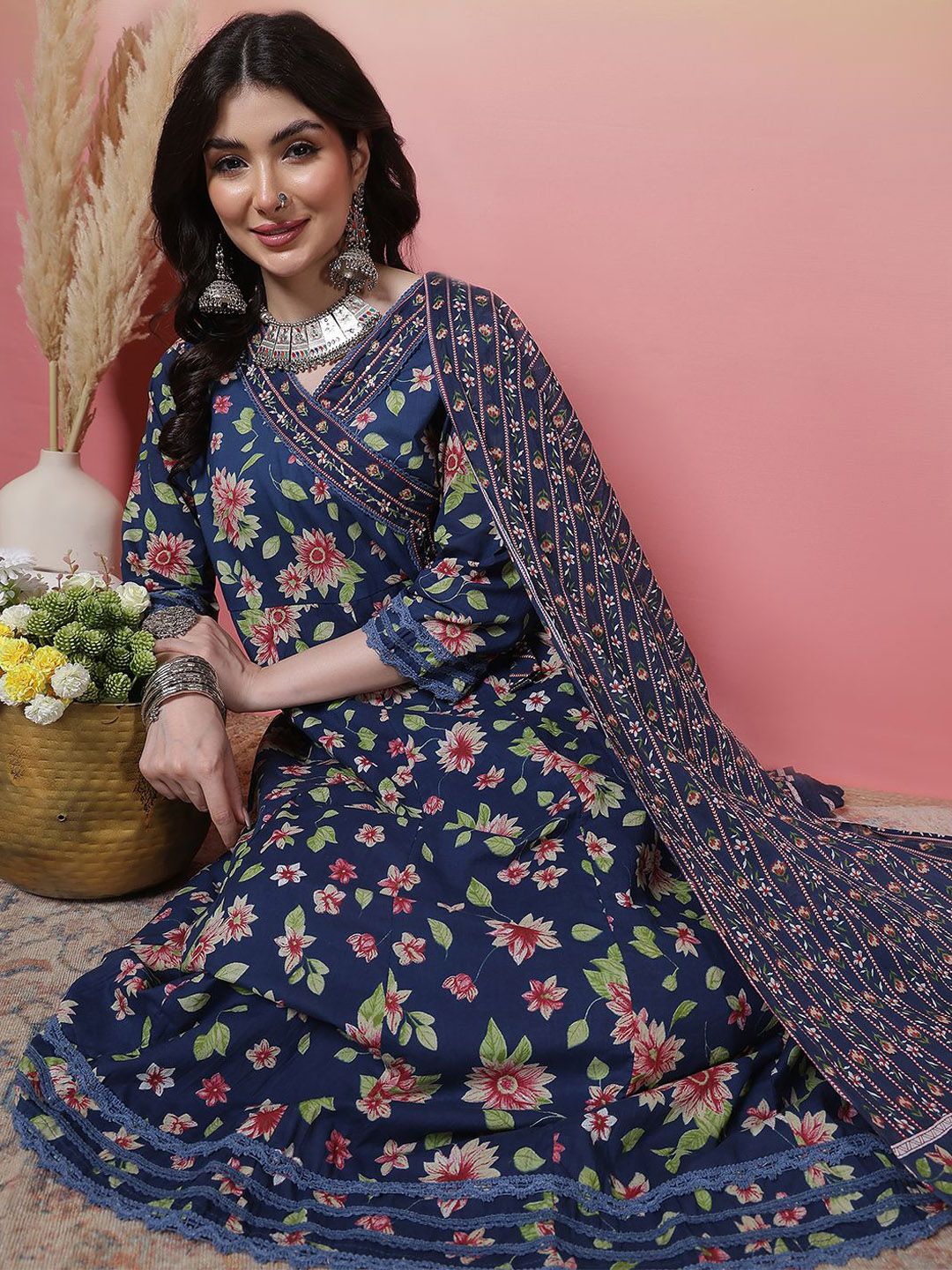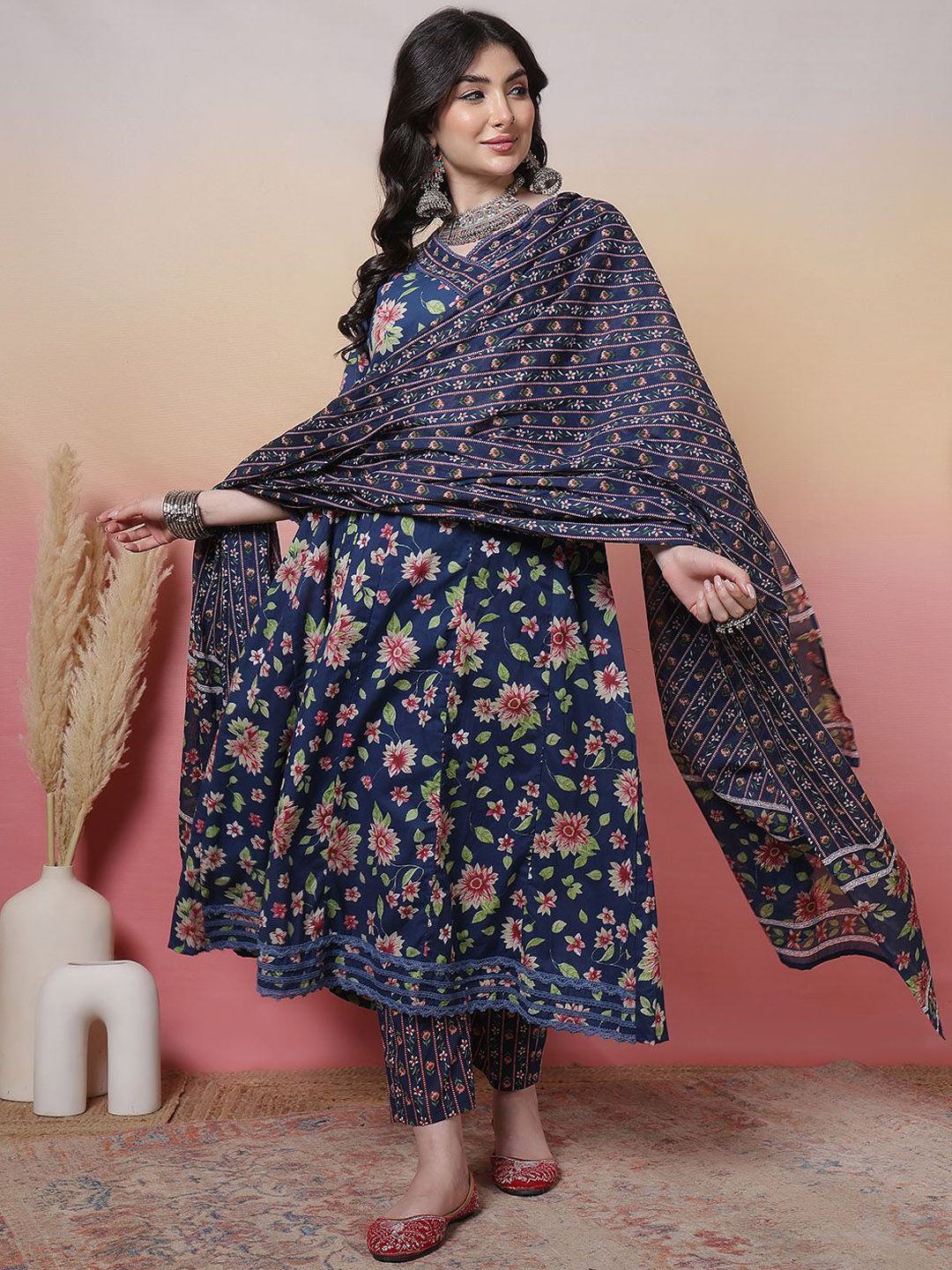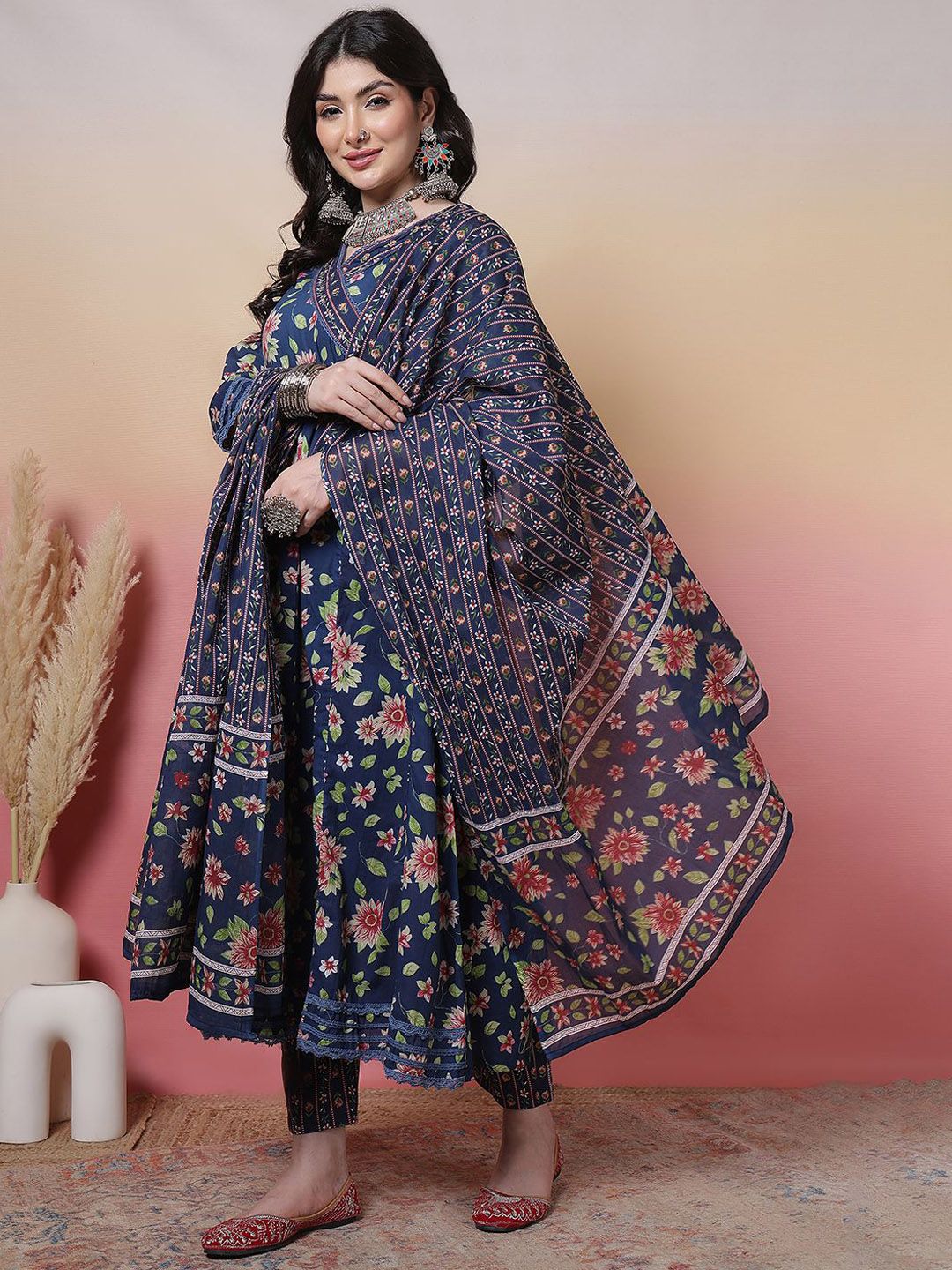 Sangria Women Floral Printed Cotton Anarkali Kurta with Trousers & Dupatta