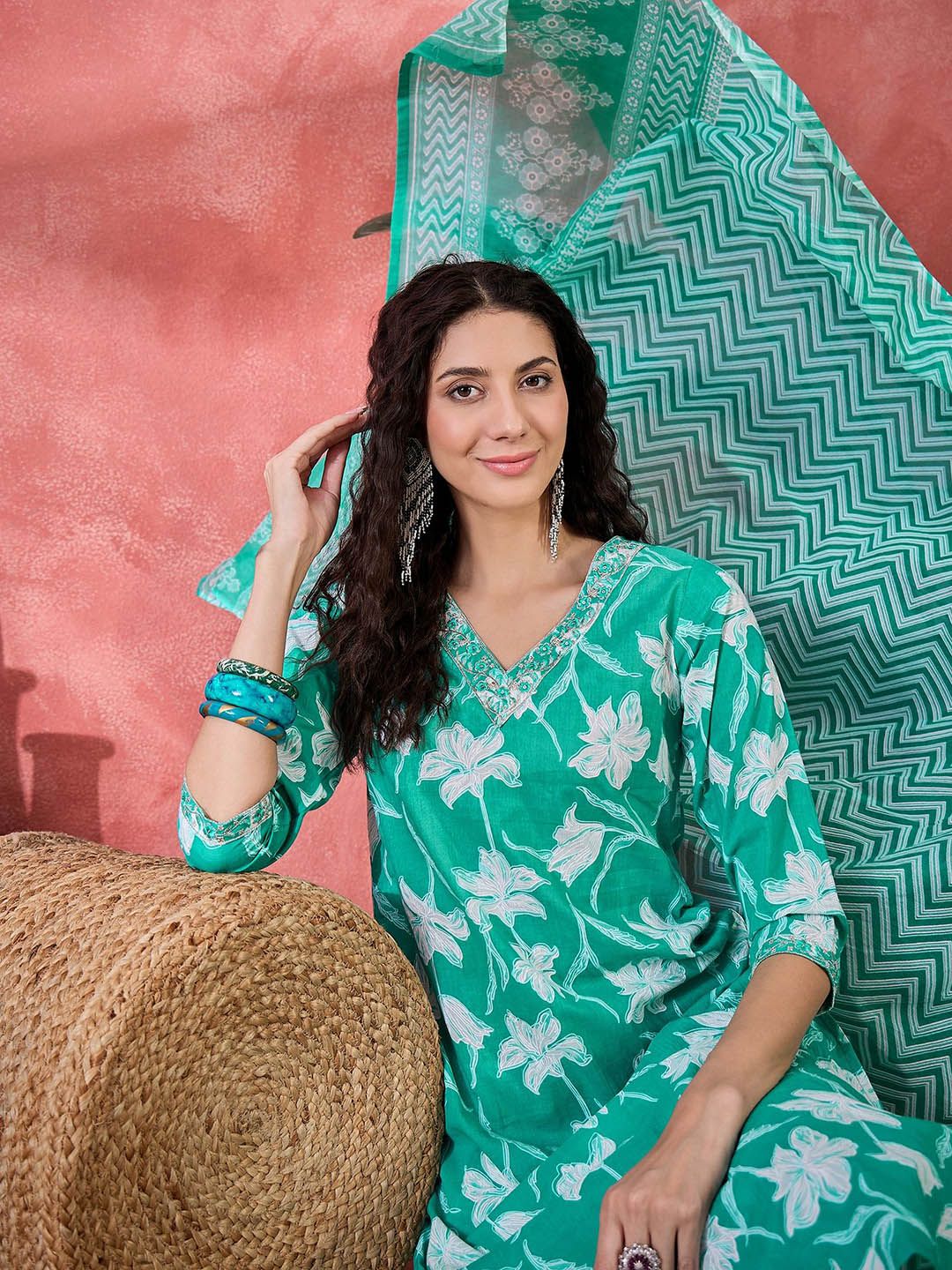 Sangria Women Floral Printed Cotton Kurta with Trousers & Dupatta