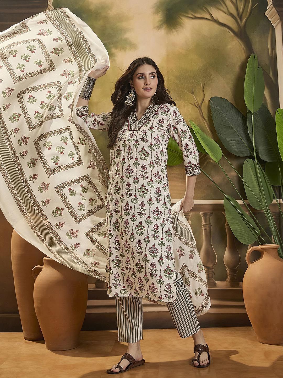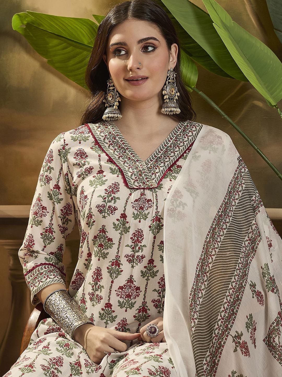Sangria Women Floral Printed Lace Work Kurta With Trousers & Dupatta Kurta Sets