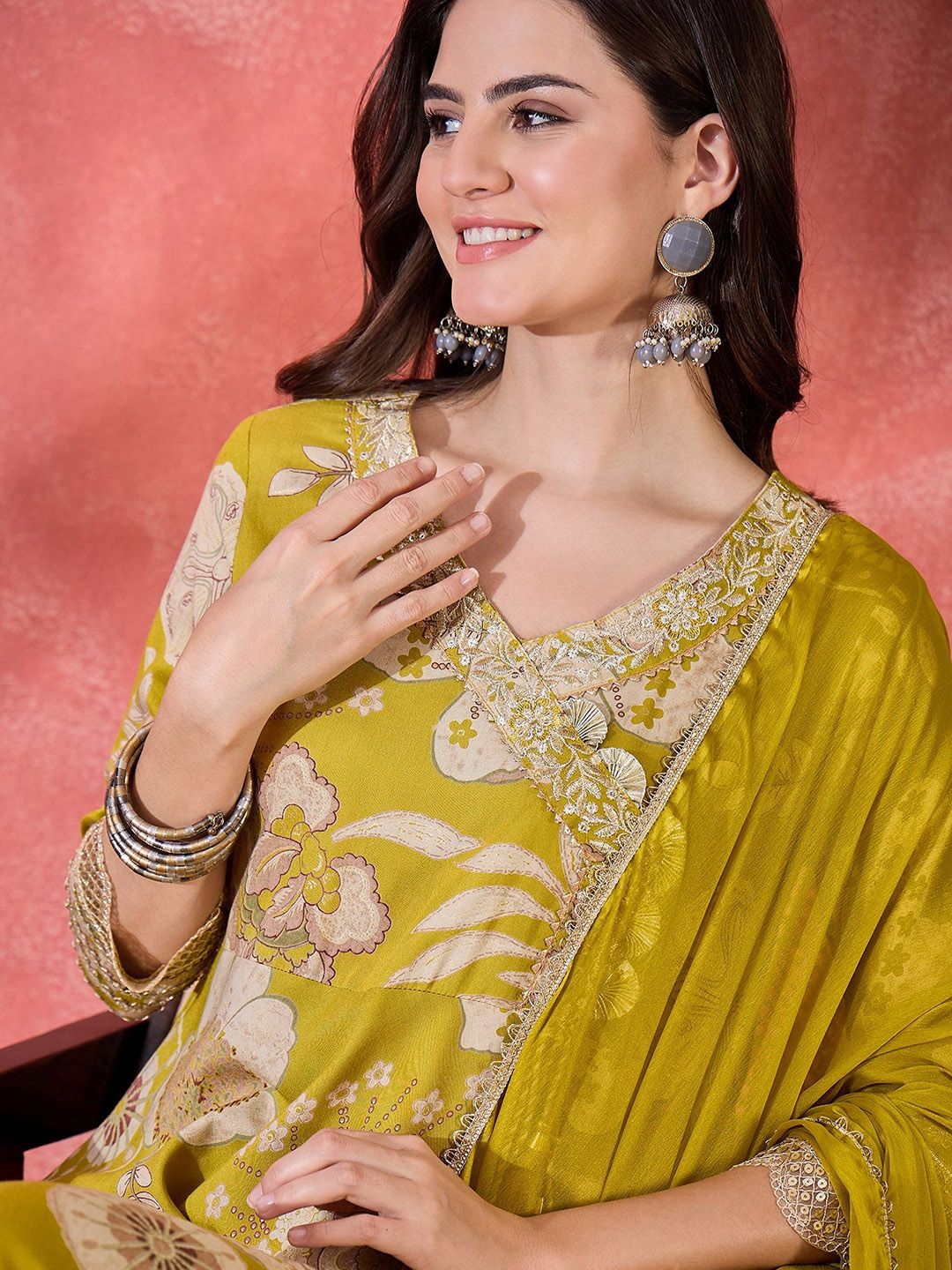 Sangria Women Floral Printed With Embroidered Angrakha Kurta With Trousers & Dupatta