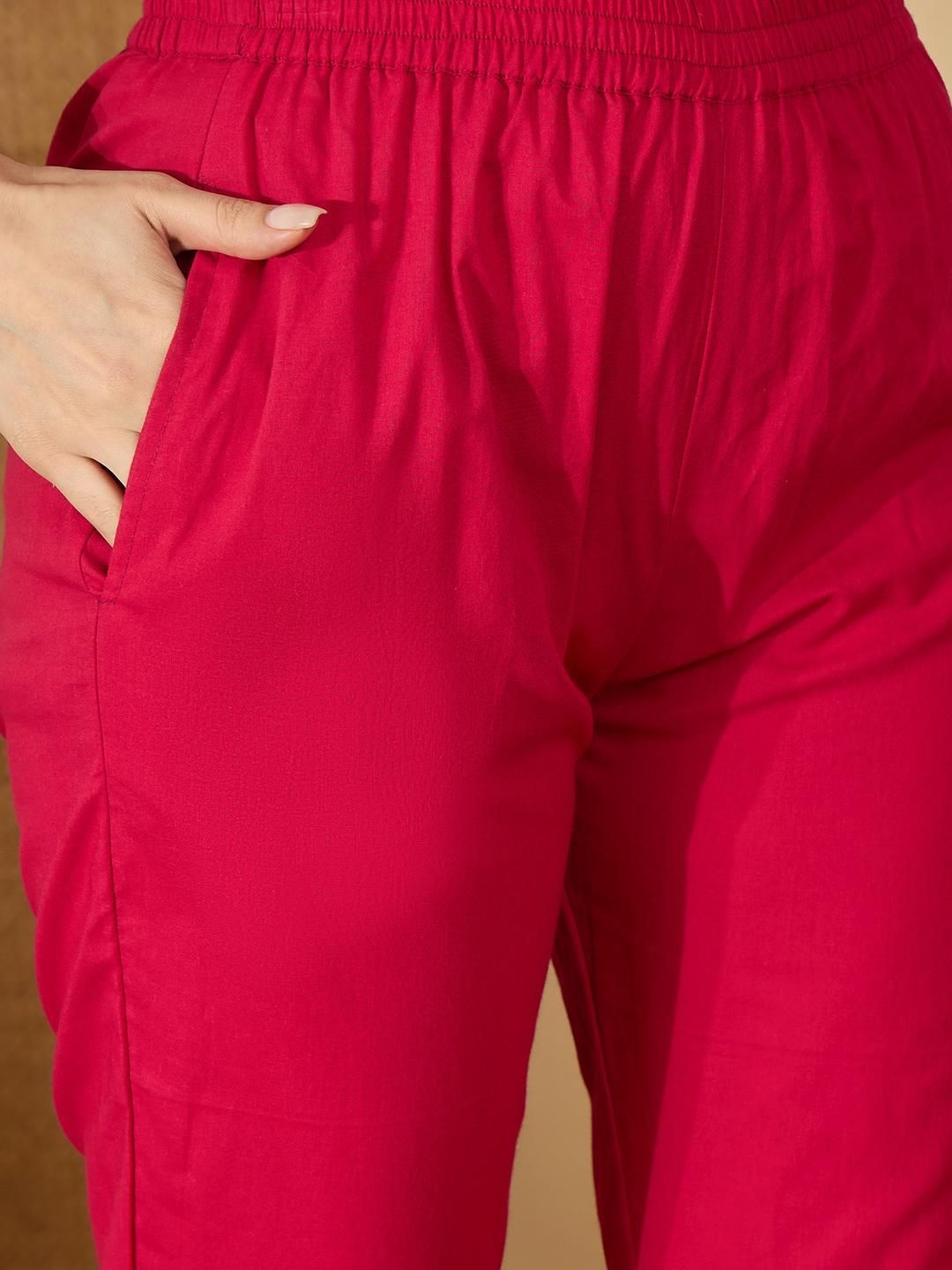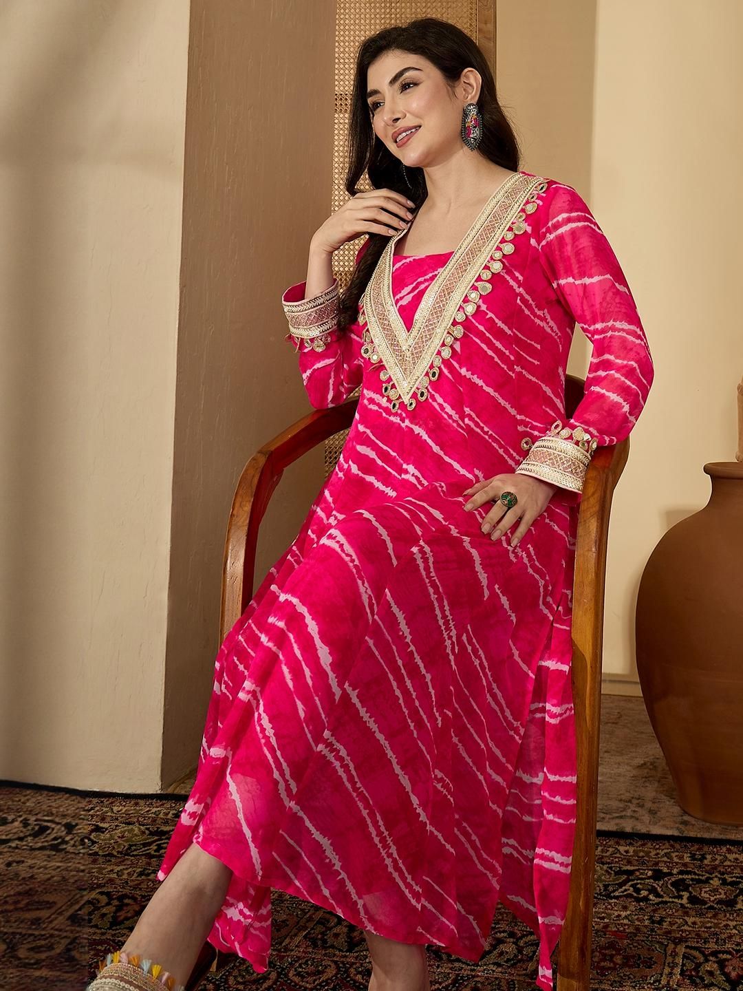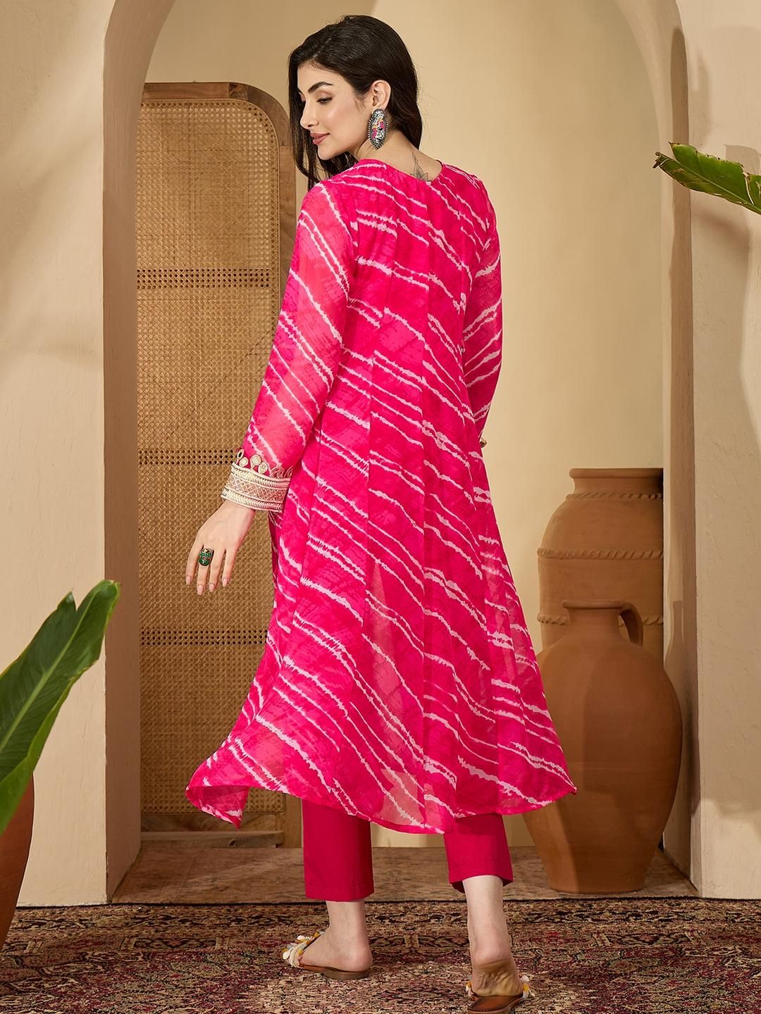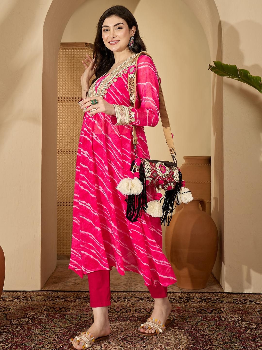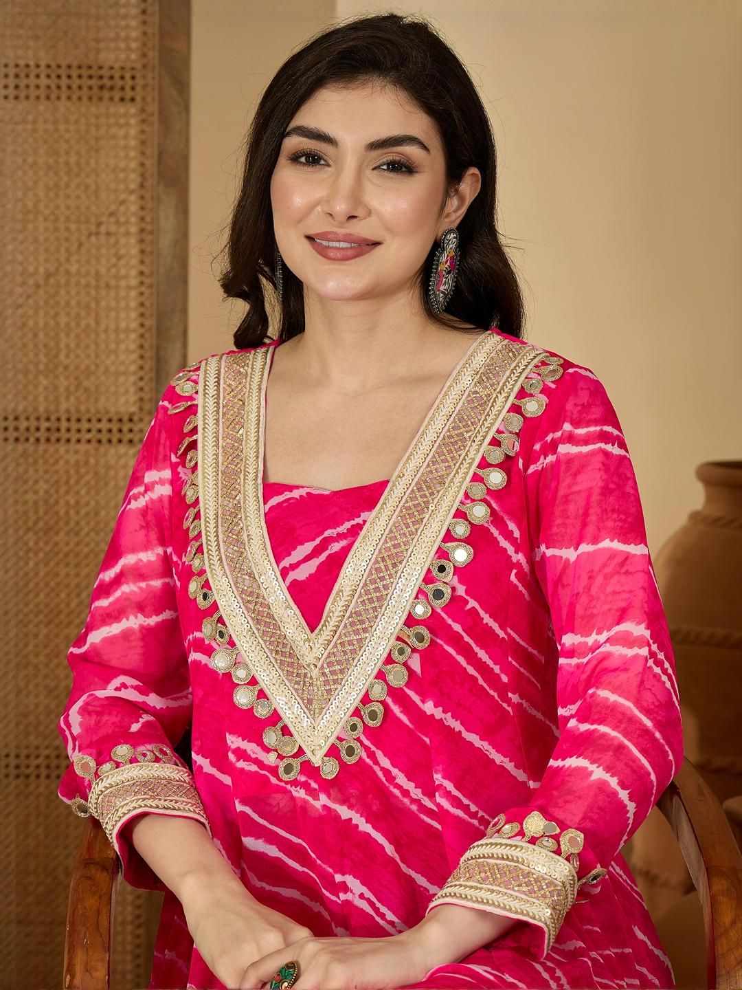Sangria Women Leheriya Printed Regular Mirror Work Kurta with Trousers