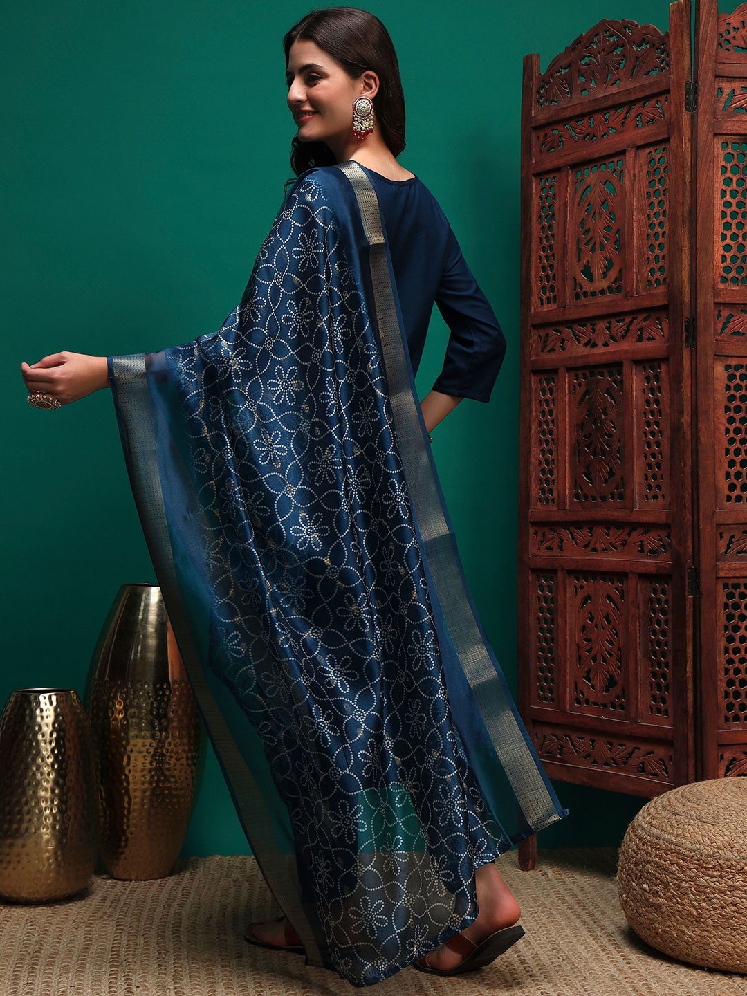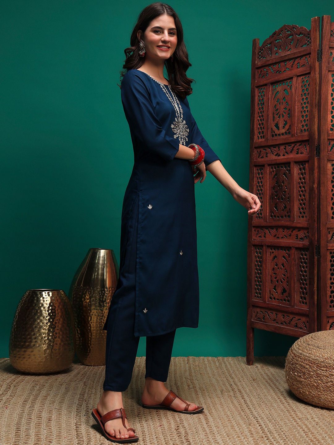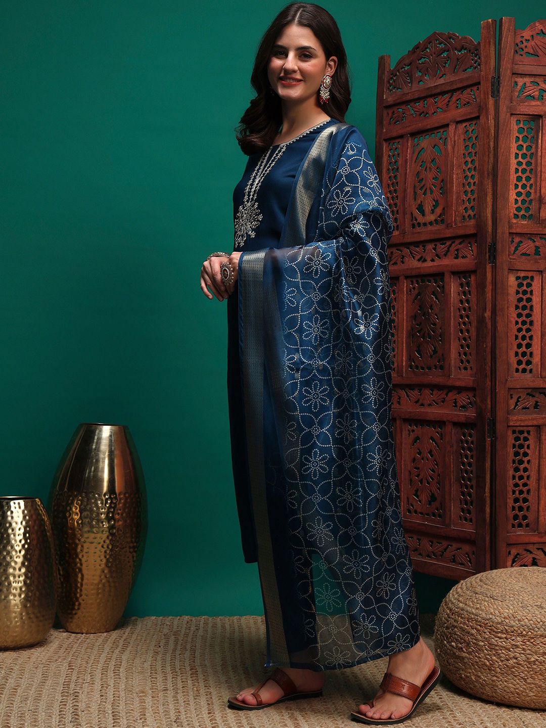 Sangria Women Sequin Embroidered Straight Kurta & Trousers With Dupatta