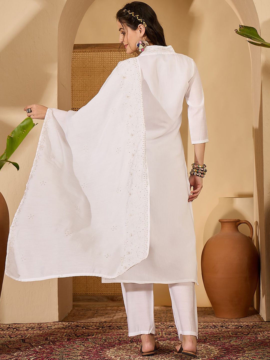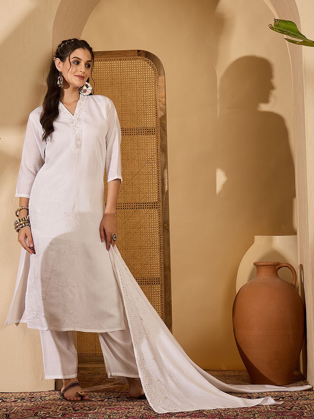 Sangria Women Sequin Silk Embroidered Straight Kurta & Trousers With Dupatta Kurta Set