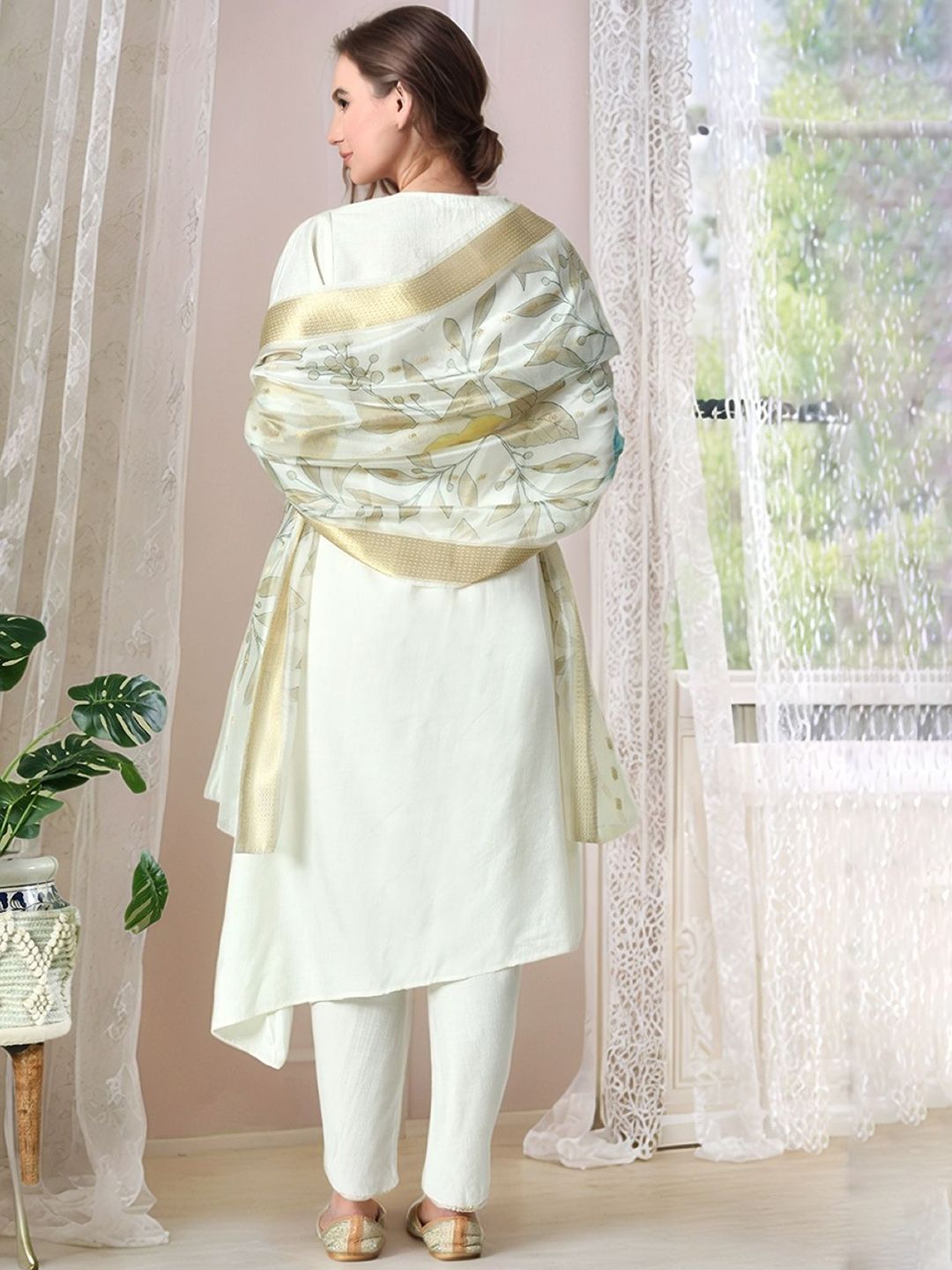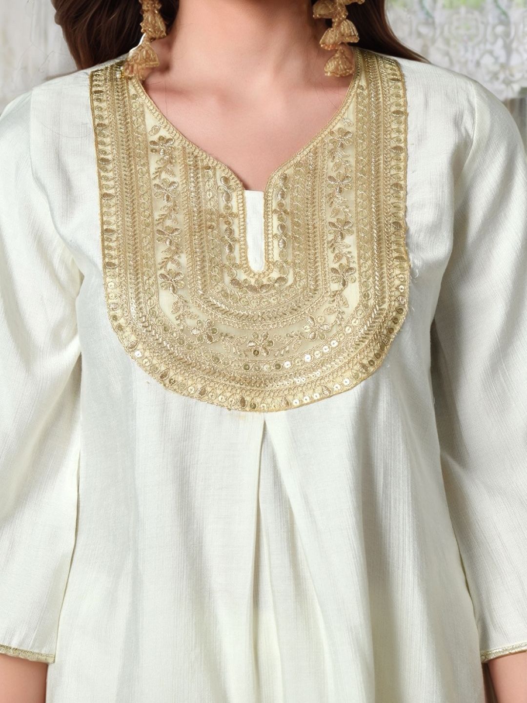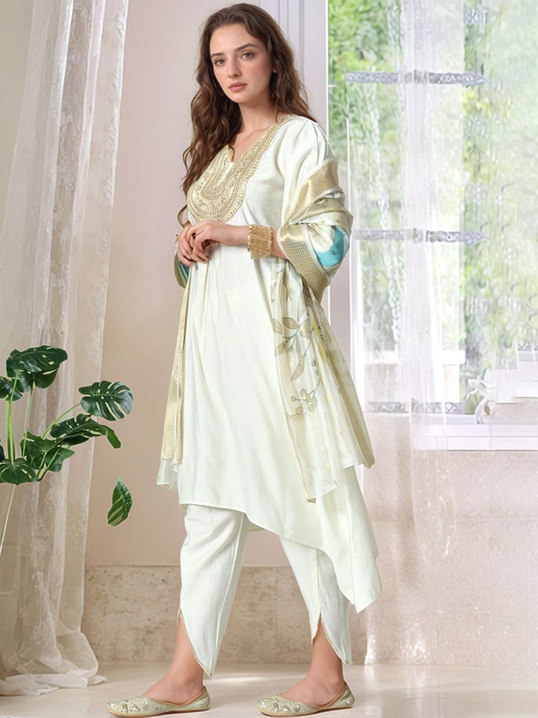 Sangria Yoke Design Sequinned V-Neck A-Line Kurta with Dhoti & Dupatta Set