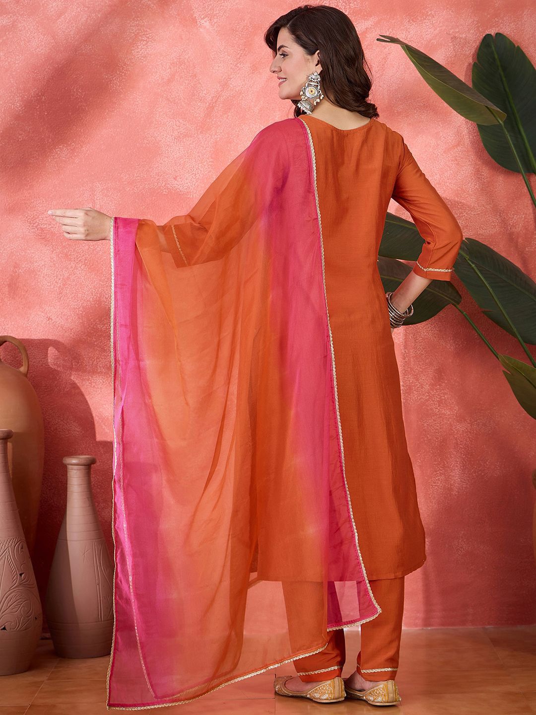 Sangria Zari Ethnic Motifs Embroidered Straight Kurta With Trouser & Dupatta