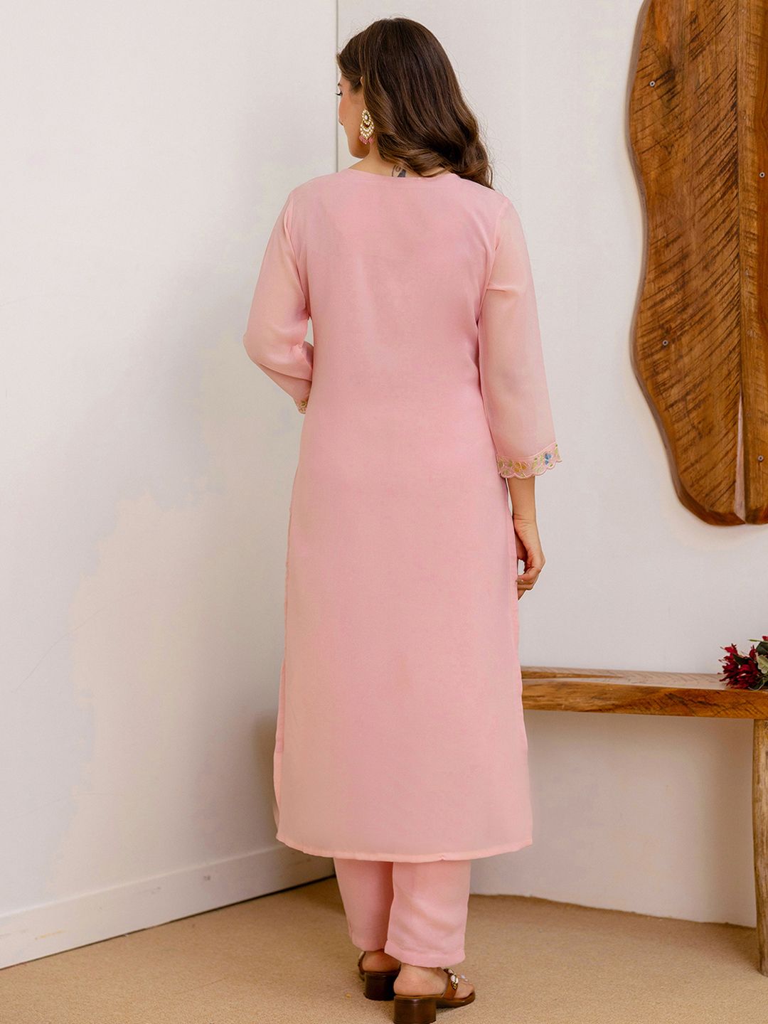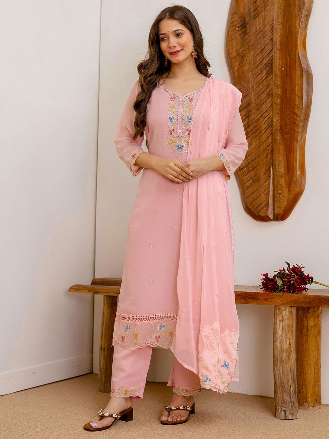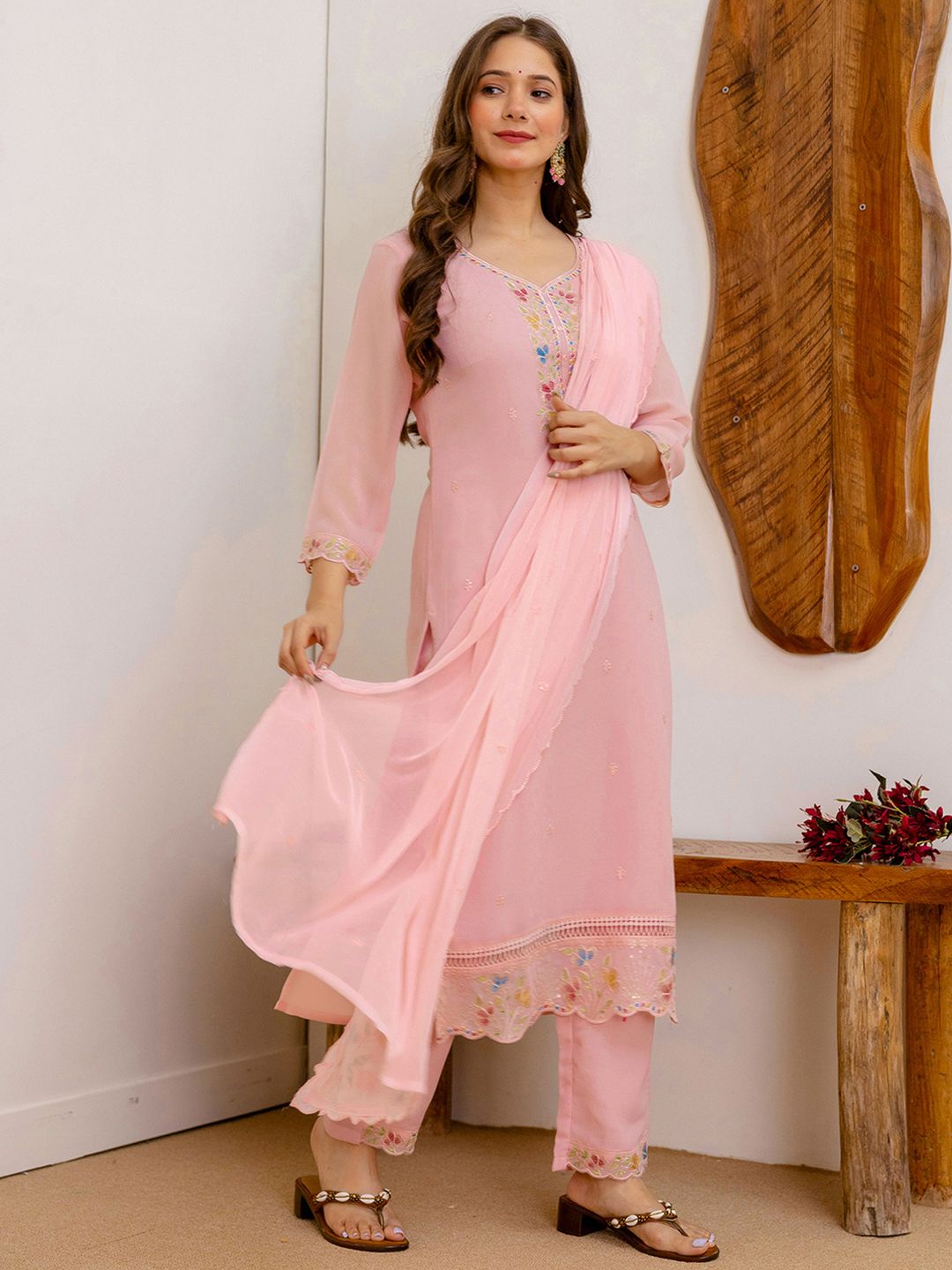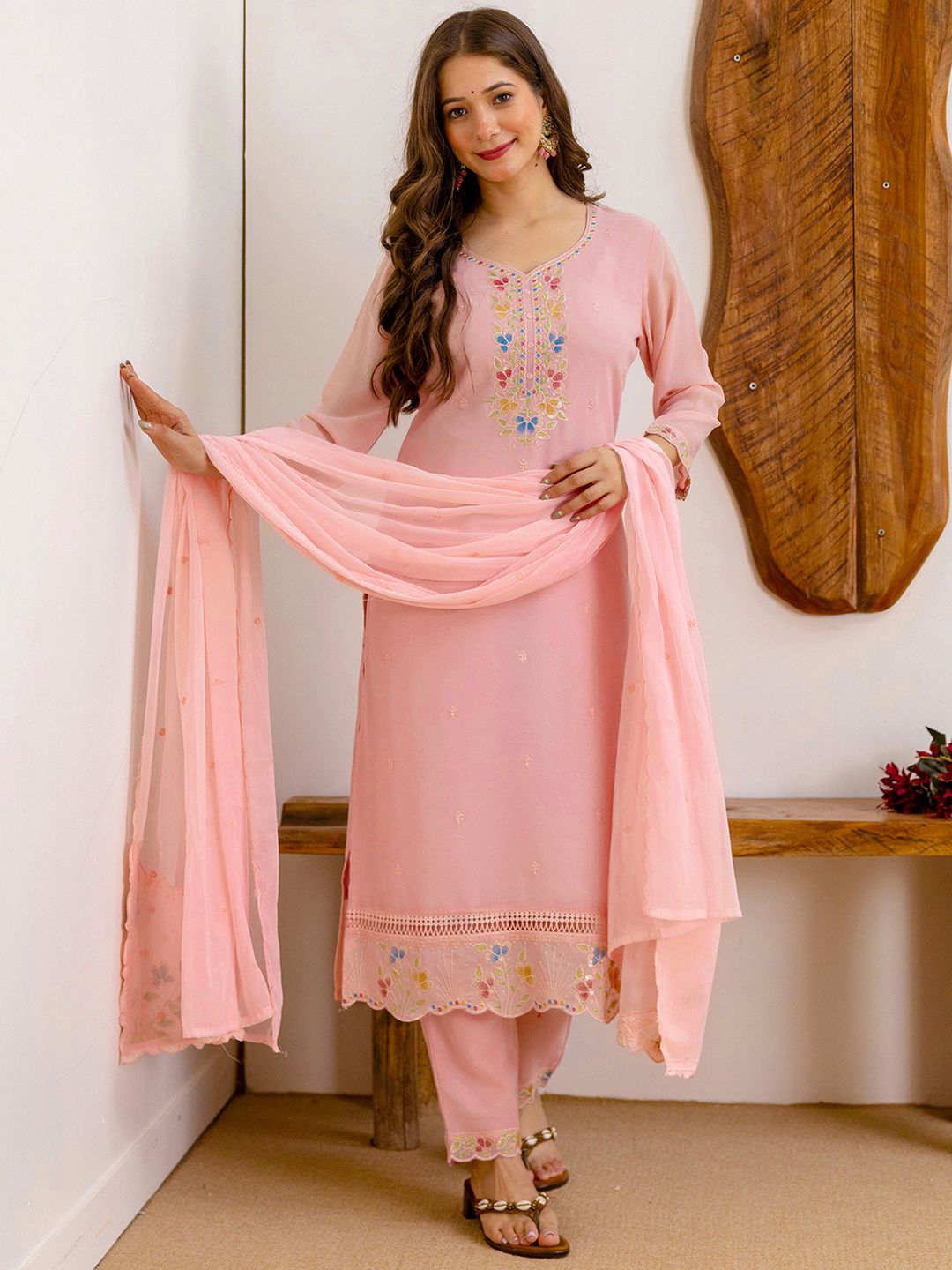 SANISA Embroidered V-Neck Thread Work Georgette Straight Kurta With Trousers & Dupatta