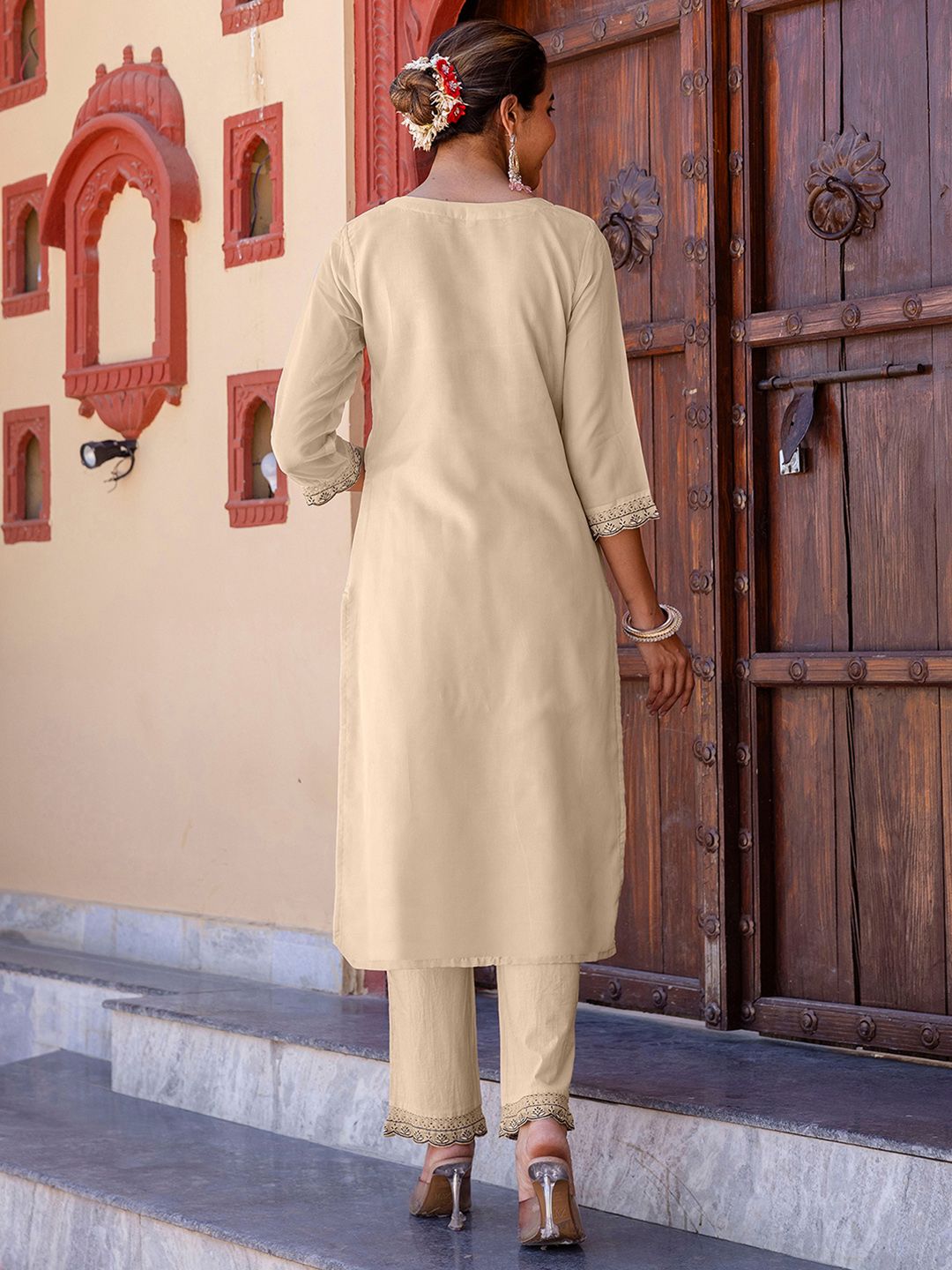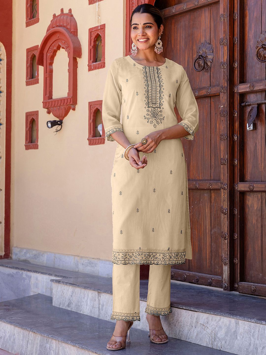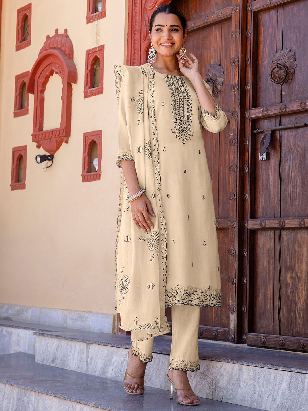 SANISA Floral Embroidered Round Neck Thread Work Straight Kurta With Trouser & Dupatta