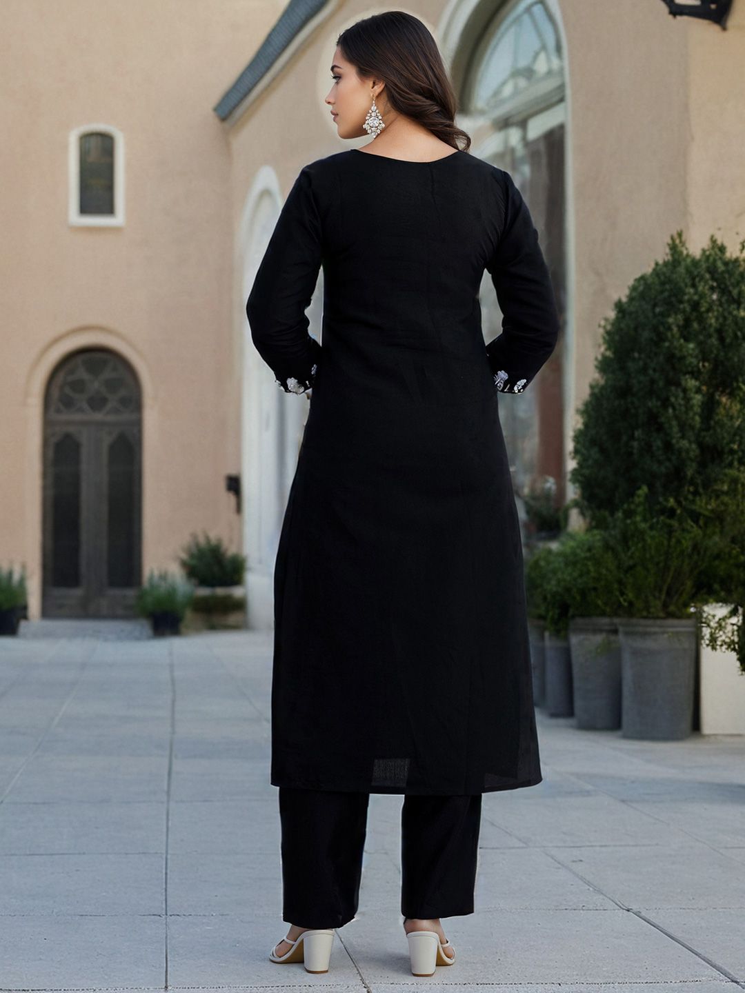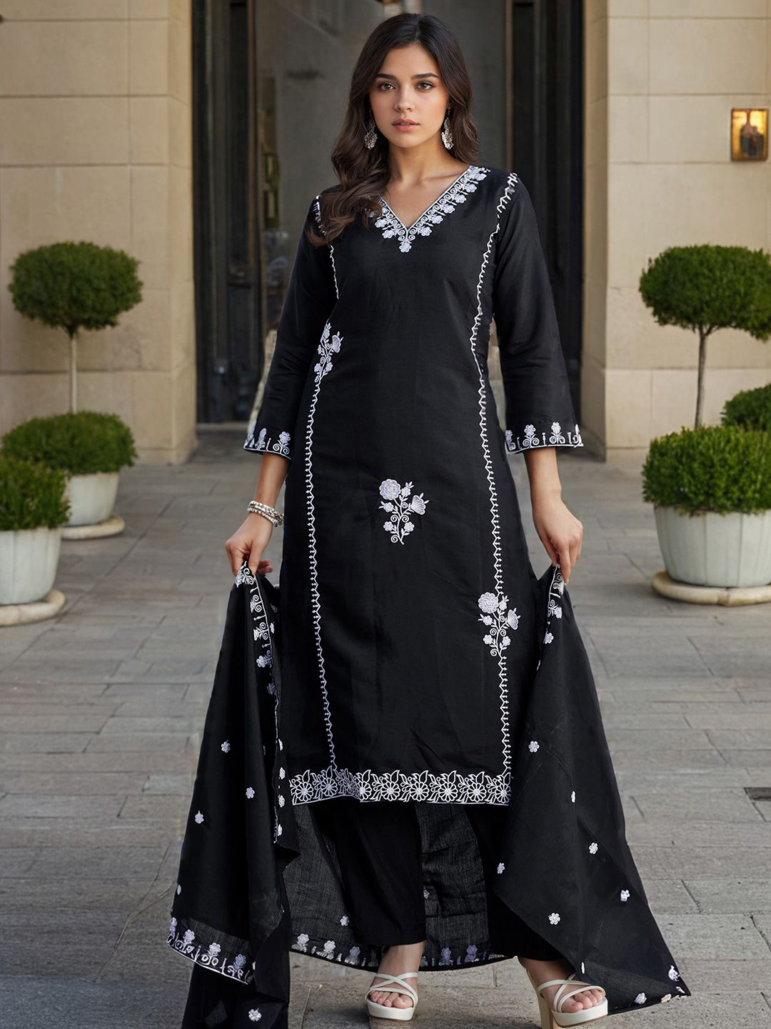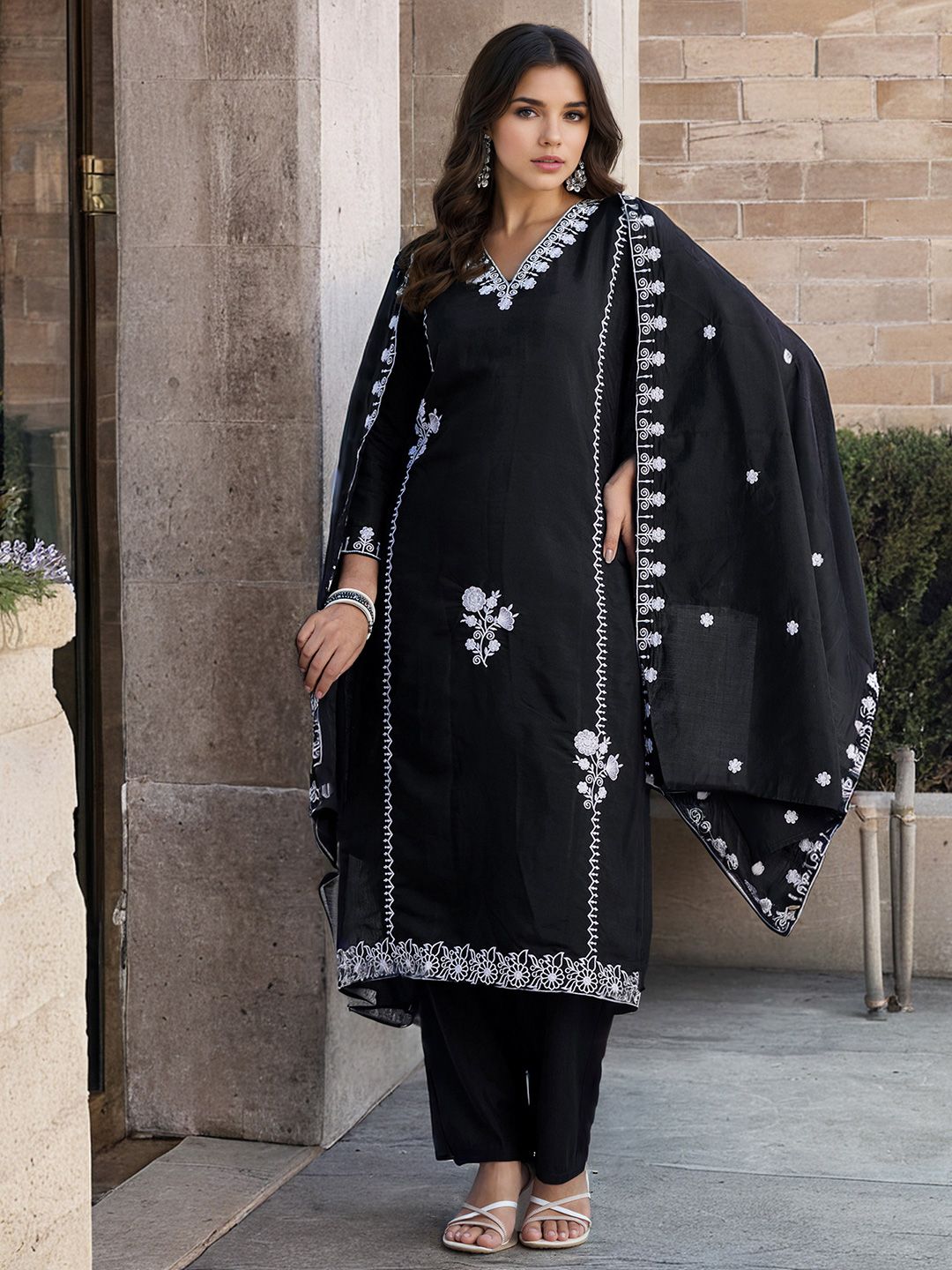 SANISA Floral Embroidered V-Neck Thread Work Straight Kurta With Trousers & Dupatta