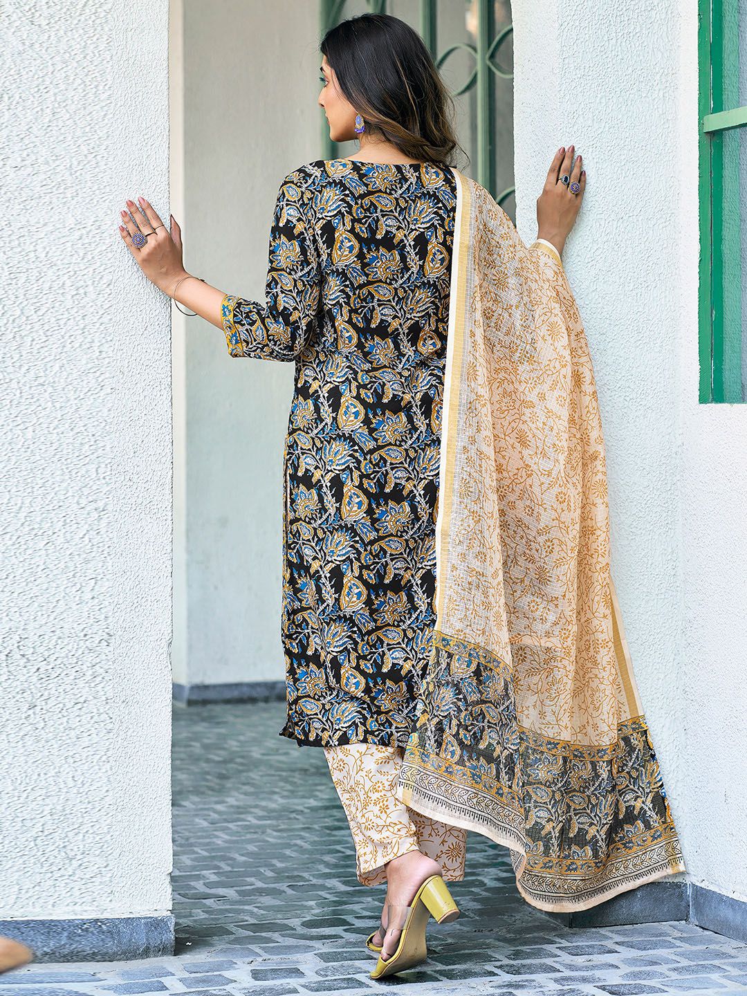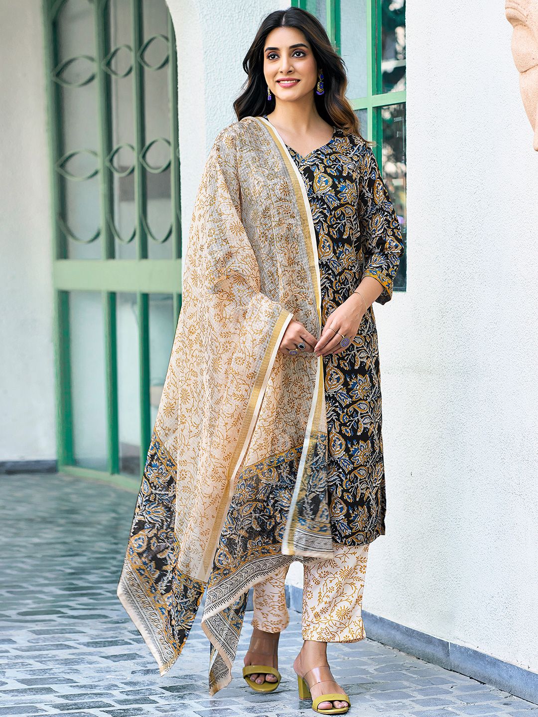 SANISA Floral Printed V-Neck Straight Kurta With Trousers & Dupatta