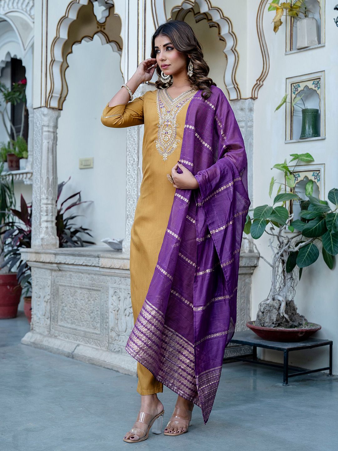 SANISA Floral Yoke Design V-Neck Thread Work Straight Kurta With Trouser And Dupatta