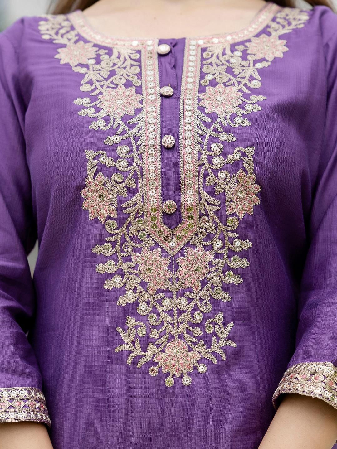 SANISA Women Lavender Ethnic Motifs Embroidered Round Neck Regular Sequinned Kurta Sets