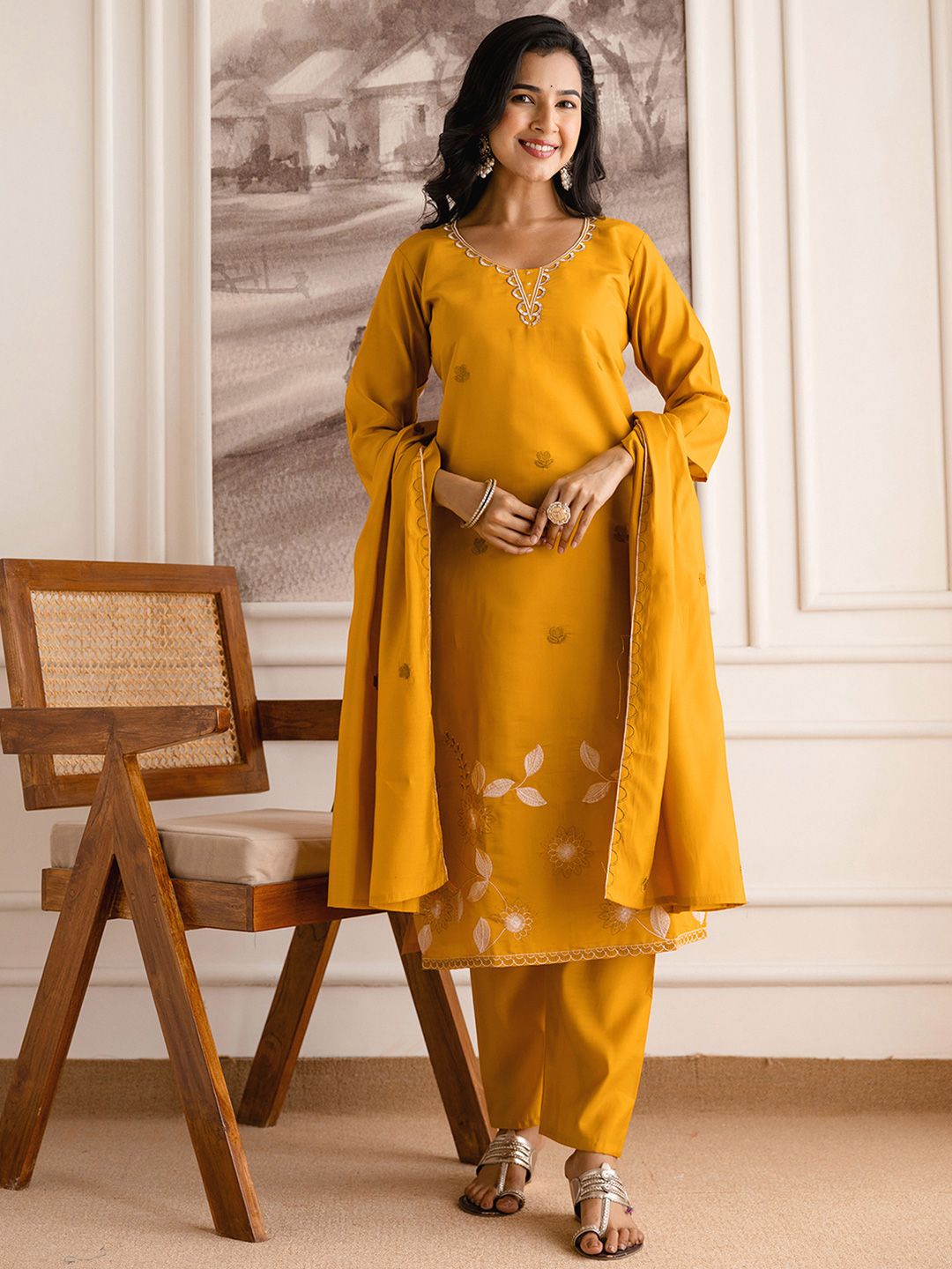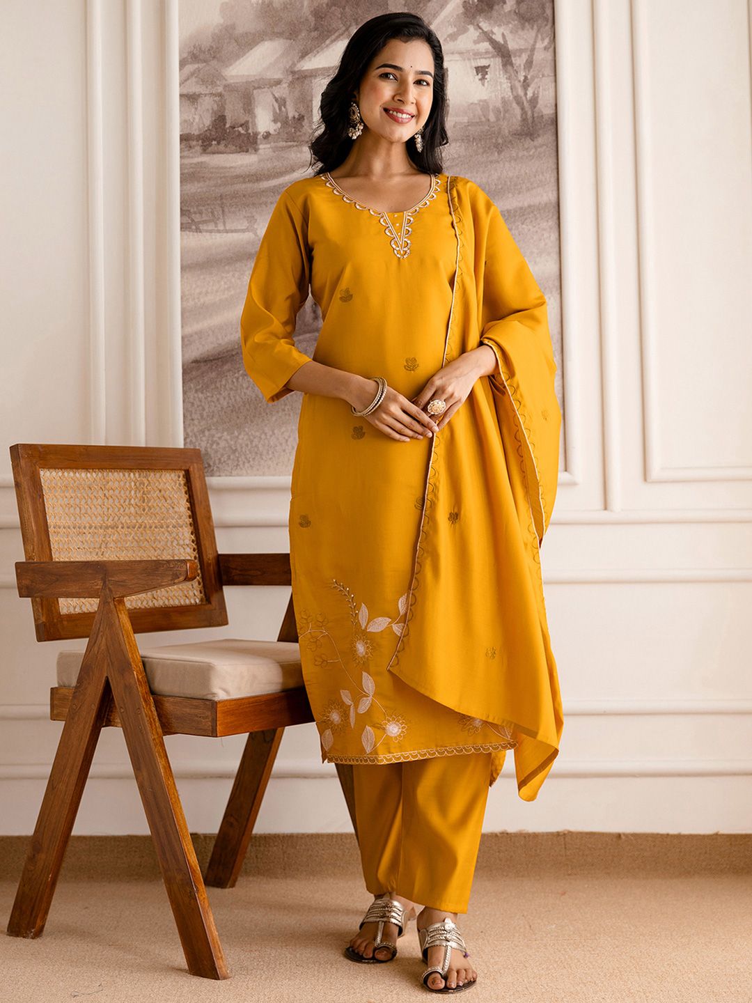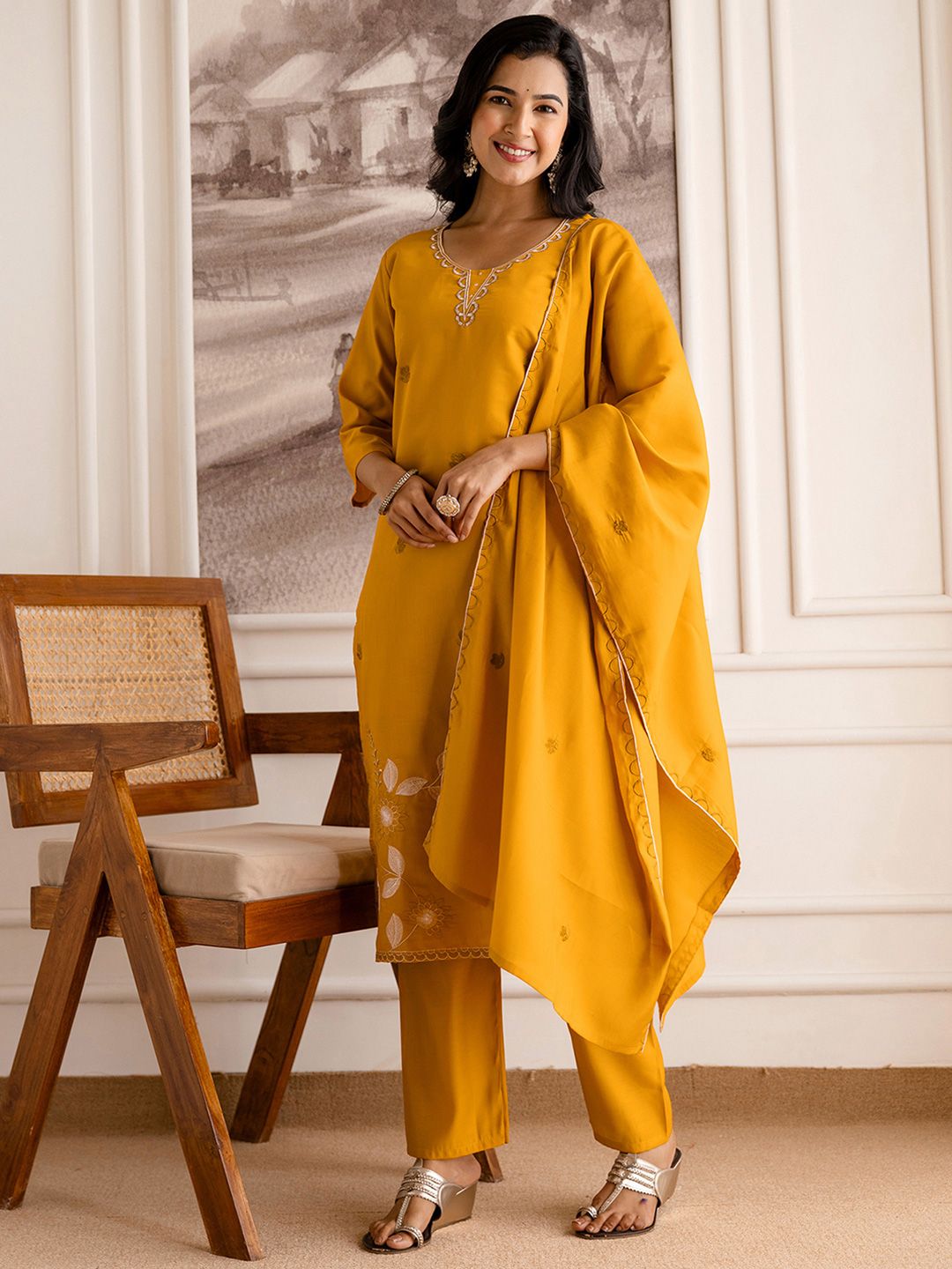 SANISA Women Mustard Embroidered Silk Blend Kurta & Trousers With Dupatta