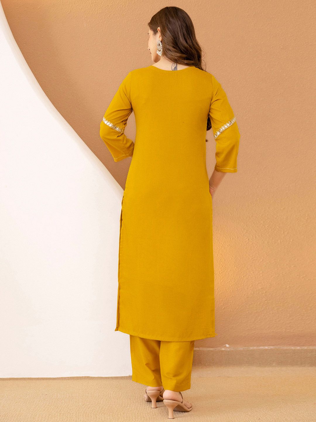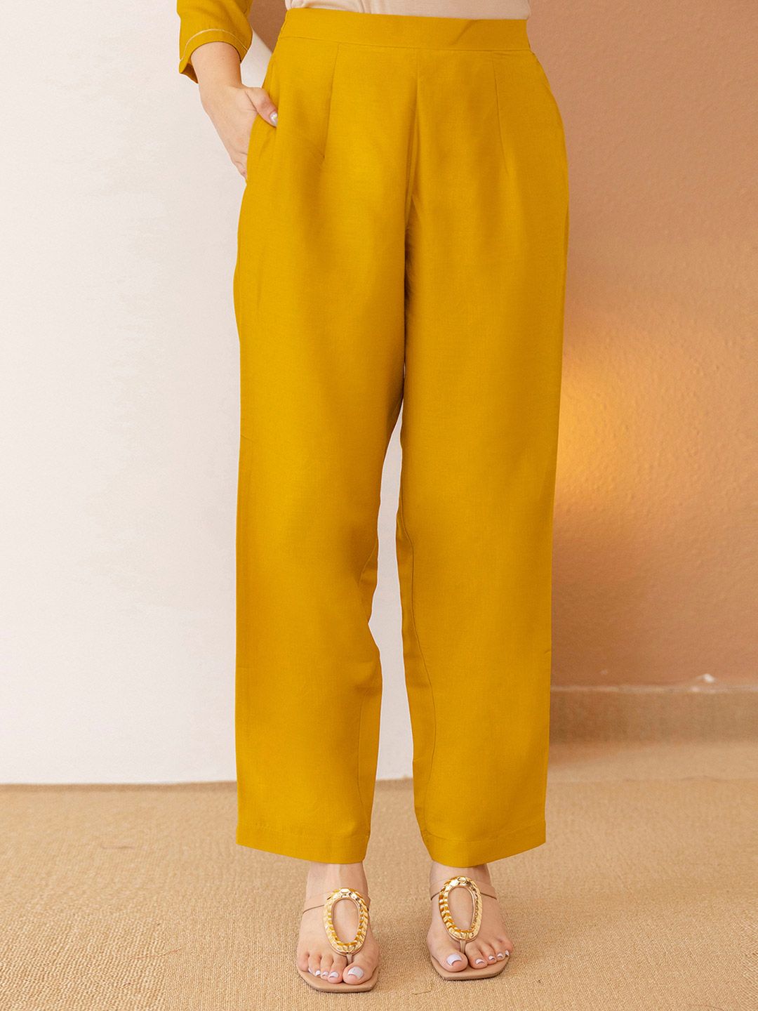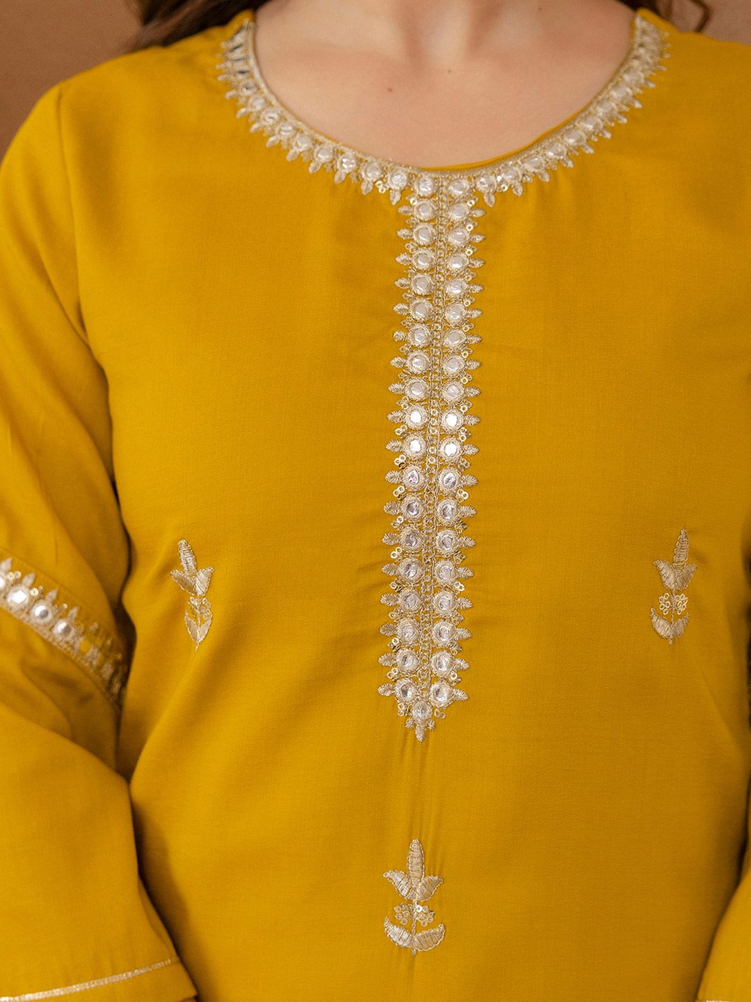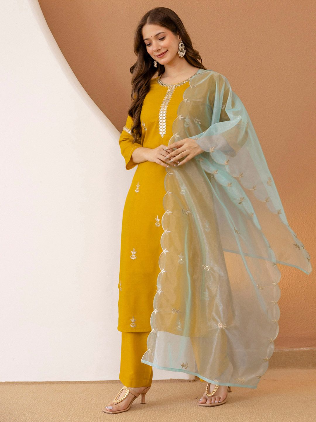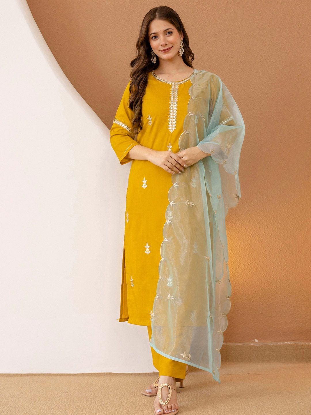 SANISA Women Yellow Chinon Embroidered Kurta & Trousers With Dupatta