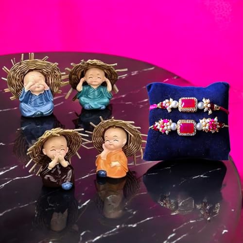 SAUDEEP INDIA Set of 4 Baby Hat Monk Buddha Idol Statue Showpiece for Home Decor with Lumba/Couple Rakhi Set Brother Bhabhi(Couple Rakhi with Gift Hamper)
