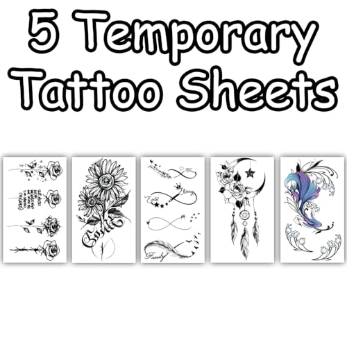 S.A.V.I 5 Sheets Temporary Tattoo Stickers - Waterproof & Long-Lasting - Floral, Feather, Dreamcatcher & Script Designs - Easy to Apply & Remove - 10.5x6cm - Body Art