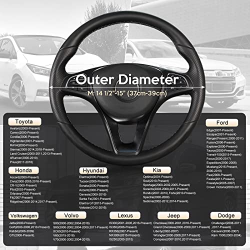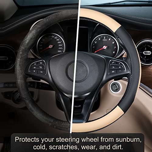?Armor Up Your Car Interior?The durable and easy-to-install steering wheel cover is the premier option for covering an old or worn original factory steering wheel. The delicate splicing design adds texture to the interior of your car. ?Hand-Saver?The fine and supple microfiber leather is much softer than factory-installed steering wheel. It provides a comfortable touch when driving, helps reduce driving fatigue, and brings you a pleasant driving experience. ?Non-Slip?Constructed from less slippery microfiber leather exterior and rubber lining, this car wheel cover adds secured safety performance when driving. It also protects your steering wheel from sunburn, scratches, fading, wear, and dirt. ?No More Sticky?The auto steering wheel cover is comfy to hold, it absorbs the hand-sweat that the summer heat causes, and allows you to grip the steering wheel firmly. ?Ready to Install?Simply warm up the steering cover for munites, and slip it on your steering wheel. Installation is fairly easy, any adult can install this steering wheel cover.Suitable for standard size steering wheels with outer diameter of 14 1/2"-15".