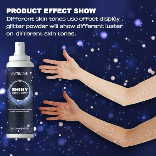 The highlight powder made of light and thin refreshing texture, can effectly enhance the stereoscopic facial contour, make the face sparkle and leave your makeup more shine and charming. Versatile: Our body glitter spray can be used not only on the Body, but also in Rave Hair Body Face Clothes Nail Art Craft Design. Applicable to all scenarios: Festival Carnival Concert Party Beauty Rave, dance parties, holiday events, weddings, shows, stages, bars, clubs, etc. With just a casual spray, you can be sparkling in a crowd. Package including 1 x silver body glitter for body,face and hair,the small size design is very convenient for everyday carry, so you can give it to your friend, girlfriend or wife for dazzling glitter and creative makeup ideas. Using Tips: For a better glitter effect, we suggest you prep your body/skin with a lotion/moisturizer beforehand so the glitter can attach skin in place well, it will minimize fall out and maximize sparkle