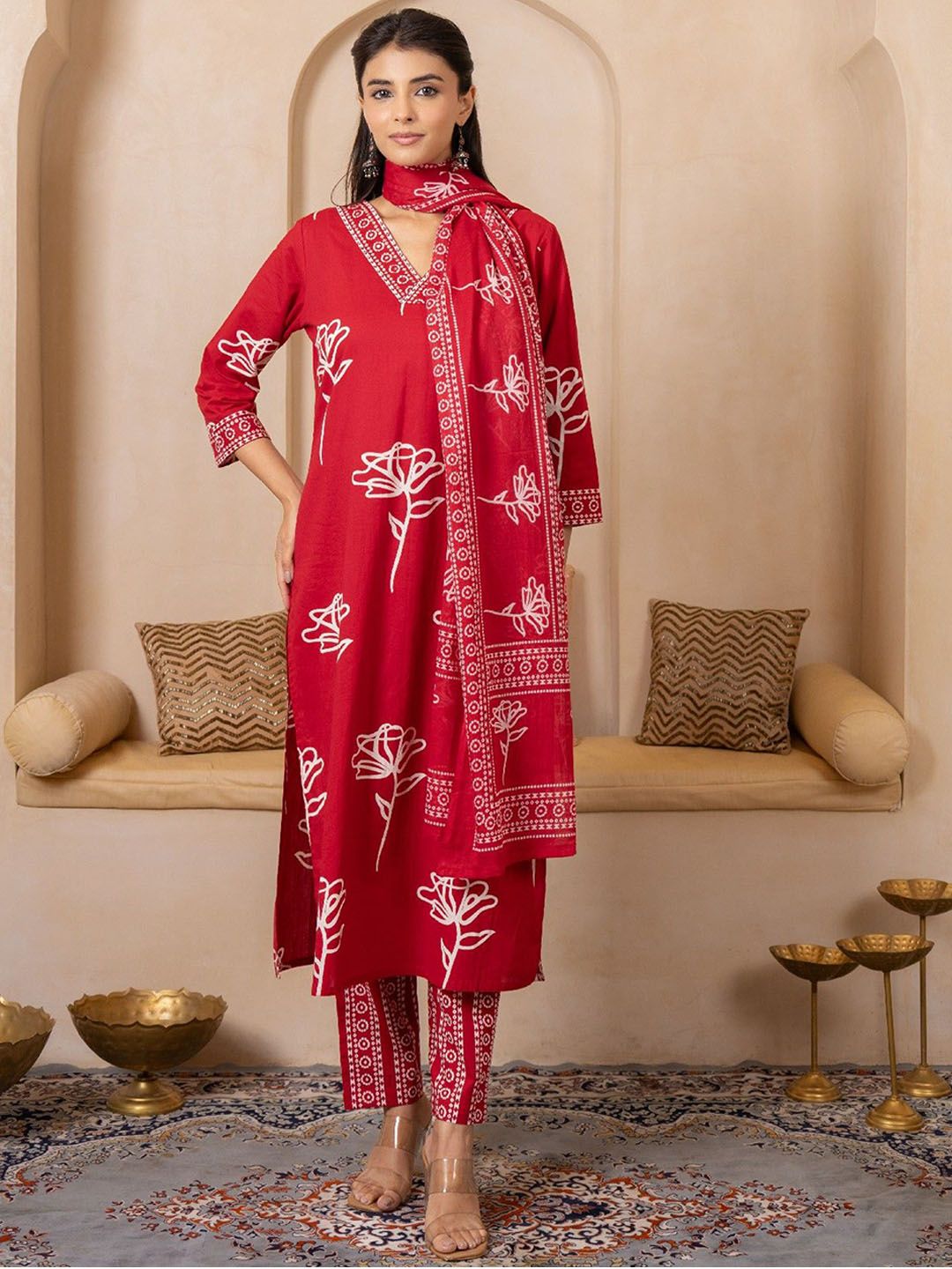 SHIVARA Floral Printed V-Neck Sequinned Pure Cotton Straight Kurta With Trousers & Dupatta