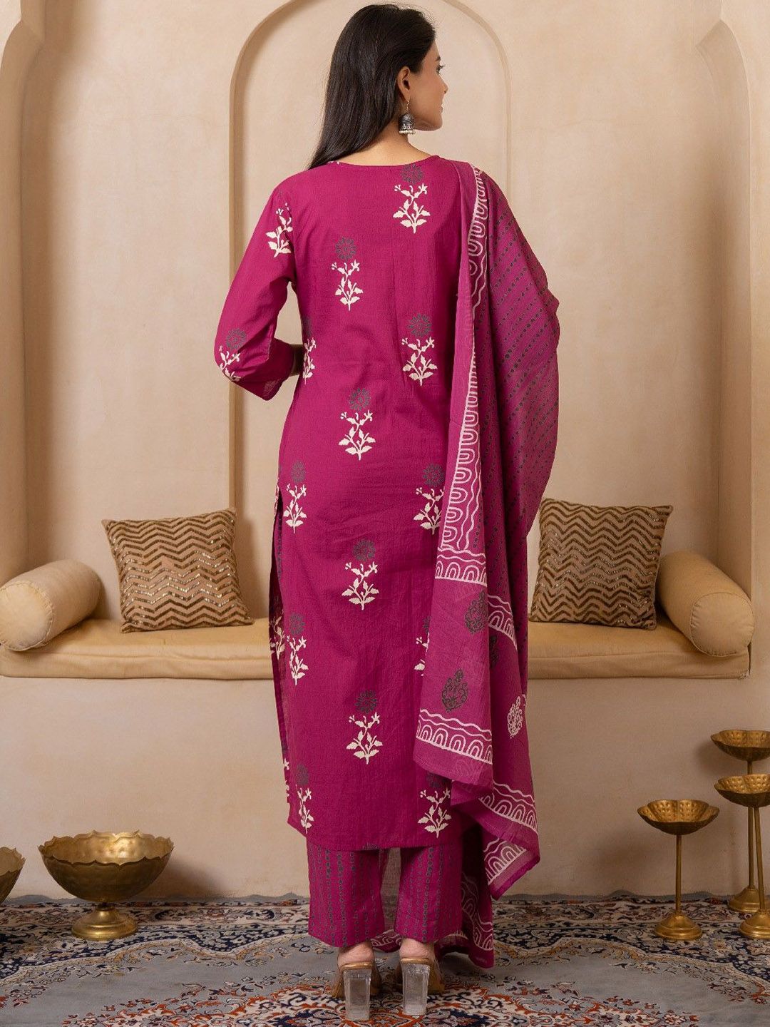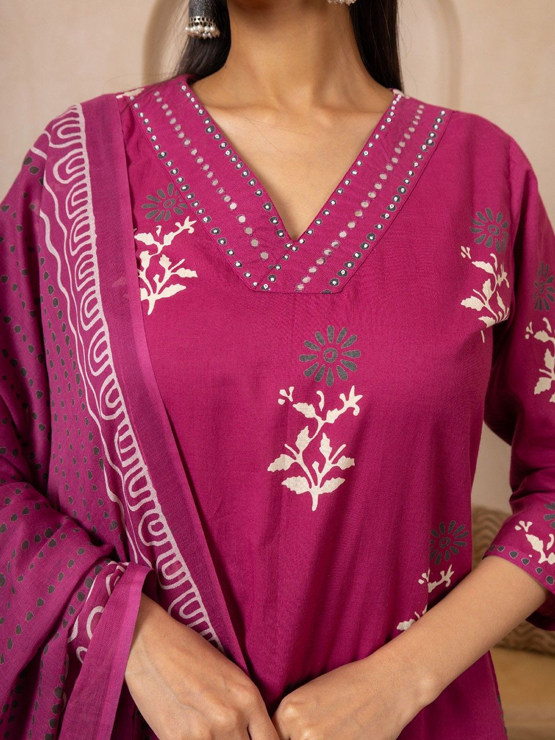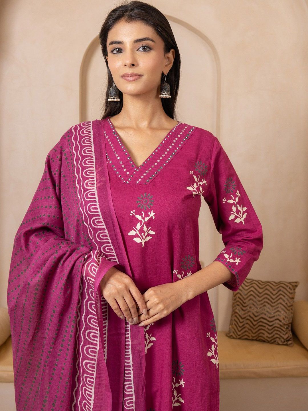 SHIVARA Women Ethnic Motifs Printed Mirror Work Pure Cotton Kurta with Trousers & Dupatta