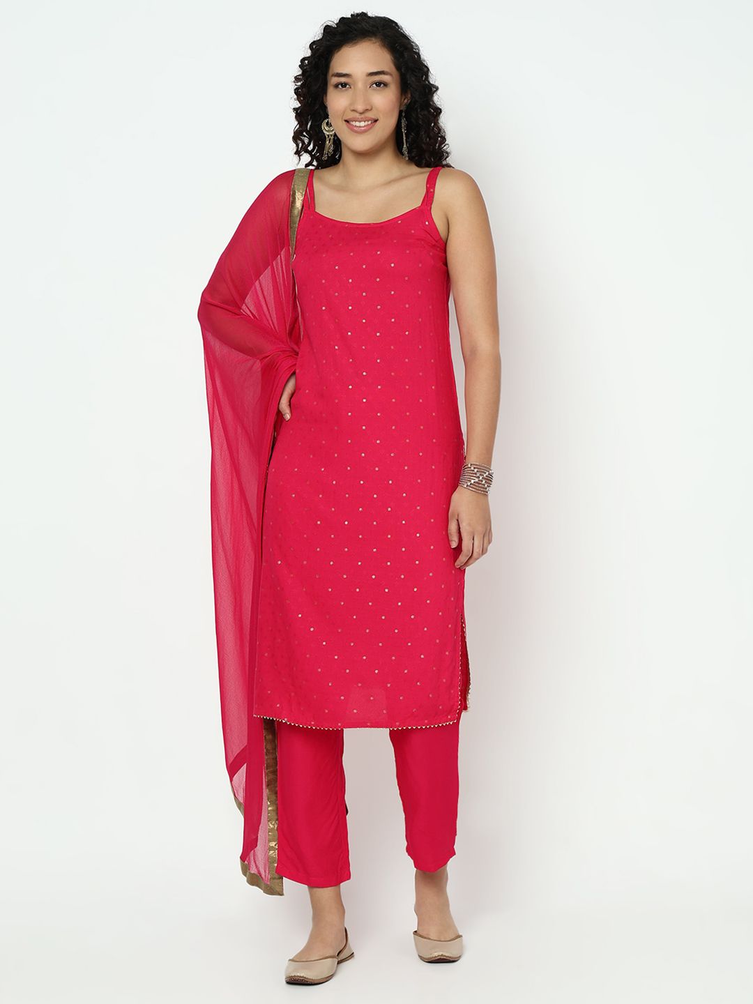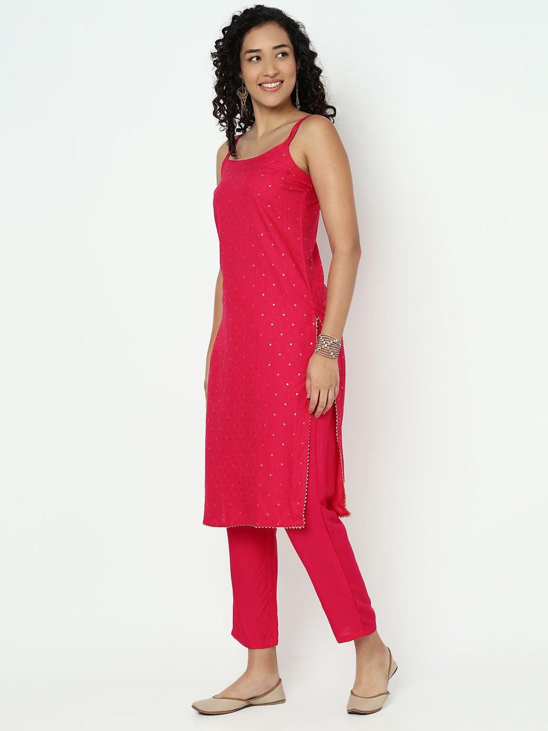 SHOWOFF Floral Woven Design Shoulder Straps Straight Kurta With Trousers & Dupatta