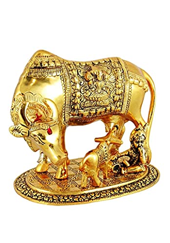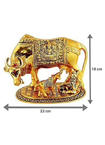SHRI KRISHNA Sheela Handicraft Kamdhenu Cow with Calf and Krishna Idol Showpiece in Brass Like Metal for Home Decor and Decorative (Gold, Big 17cm, 500 Grams, 17x12x12 cm)