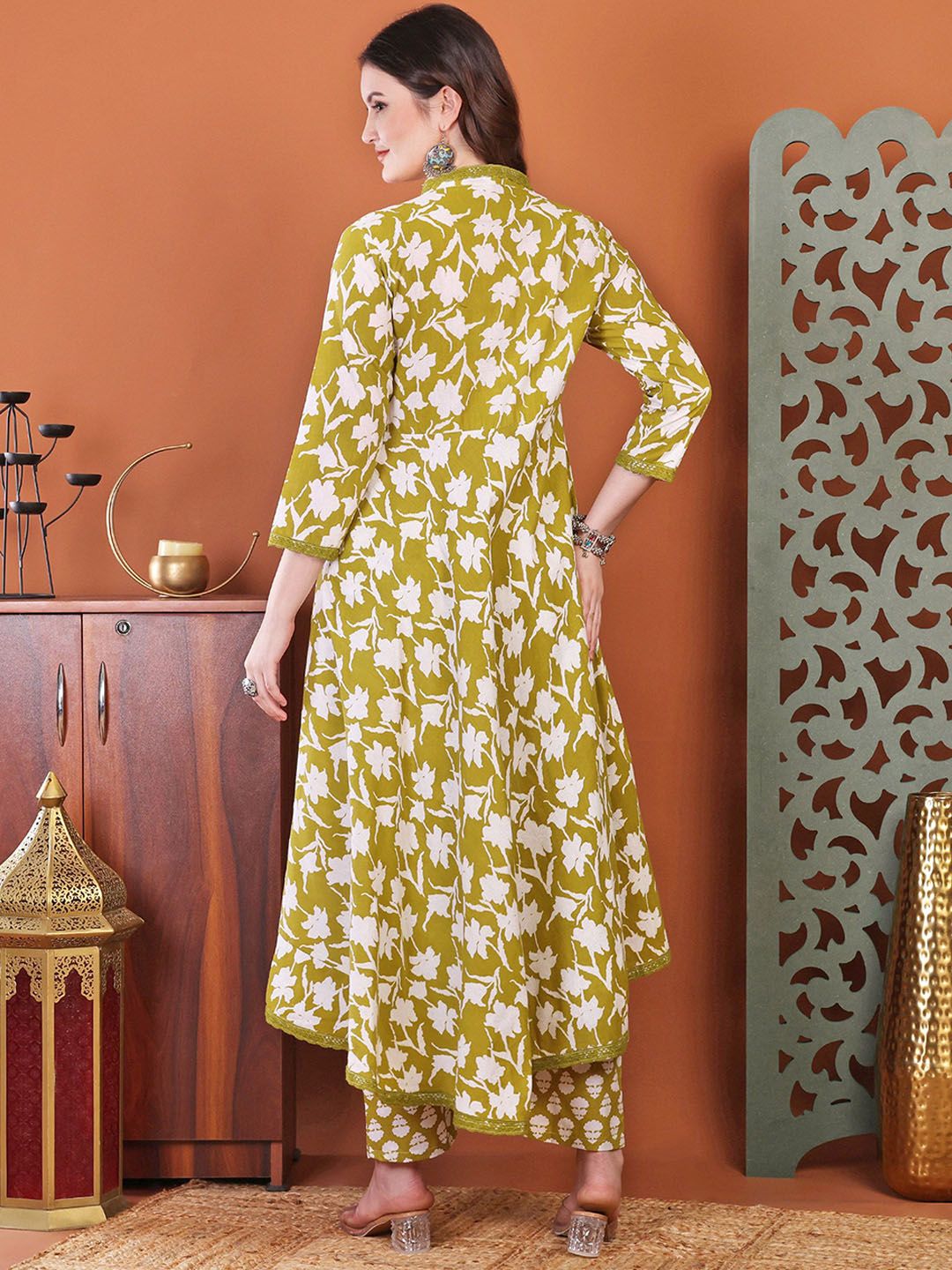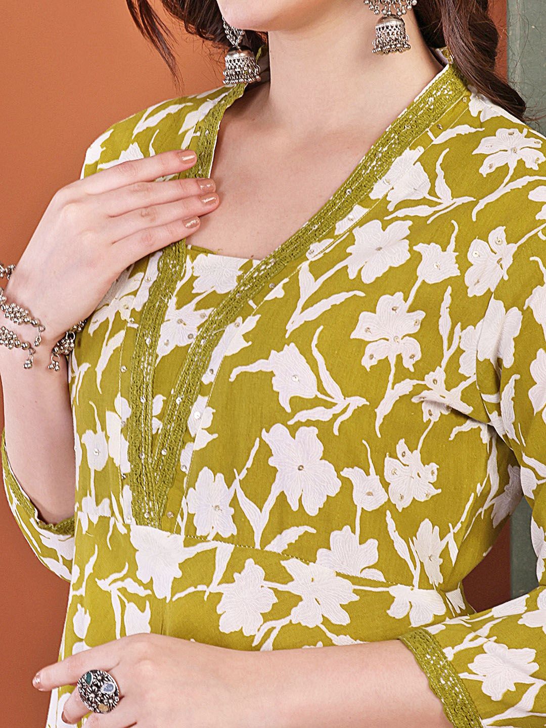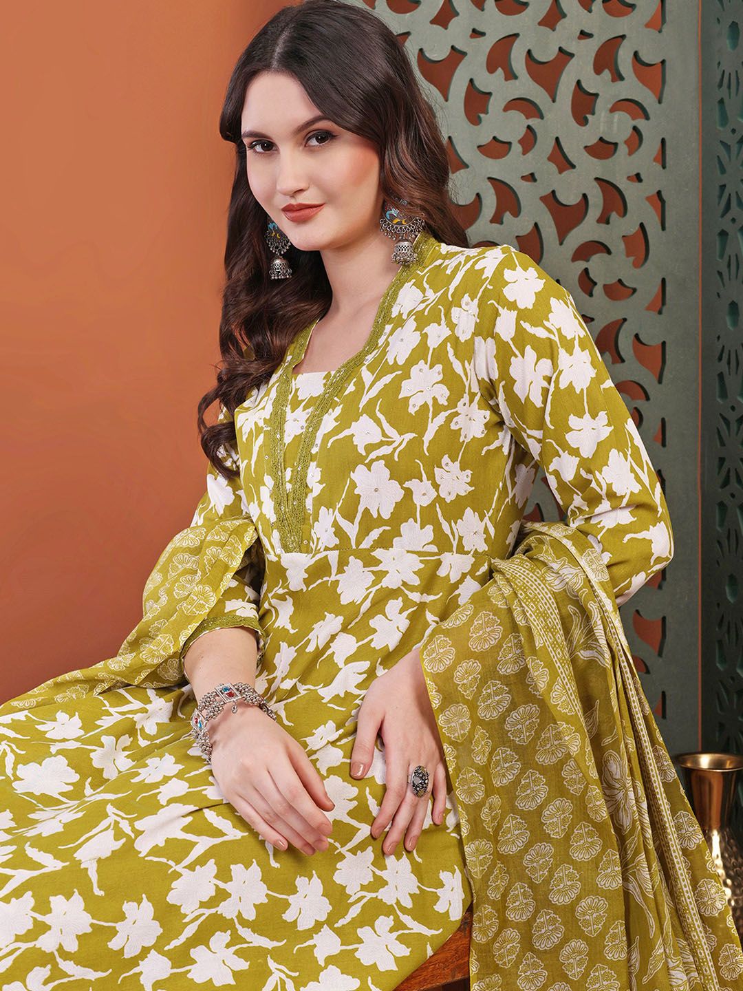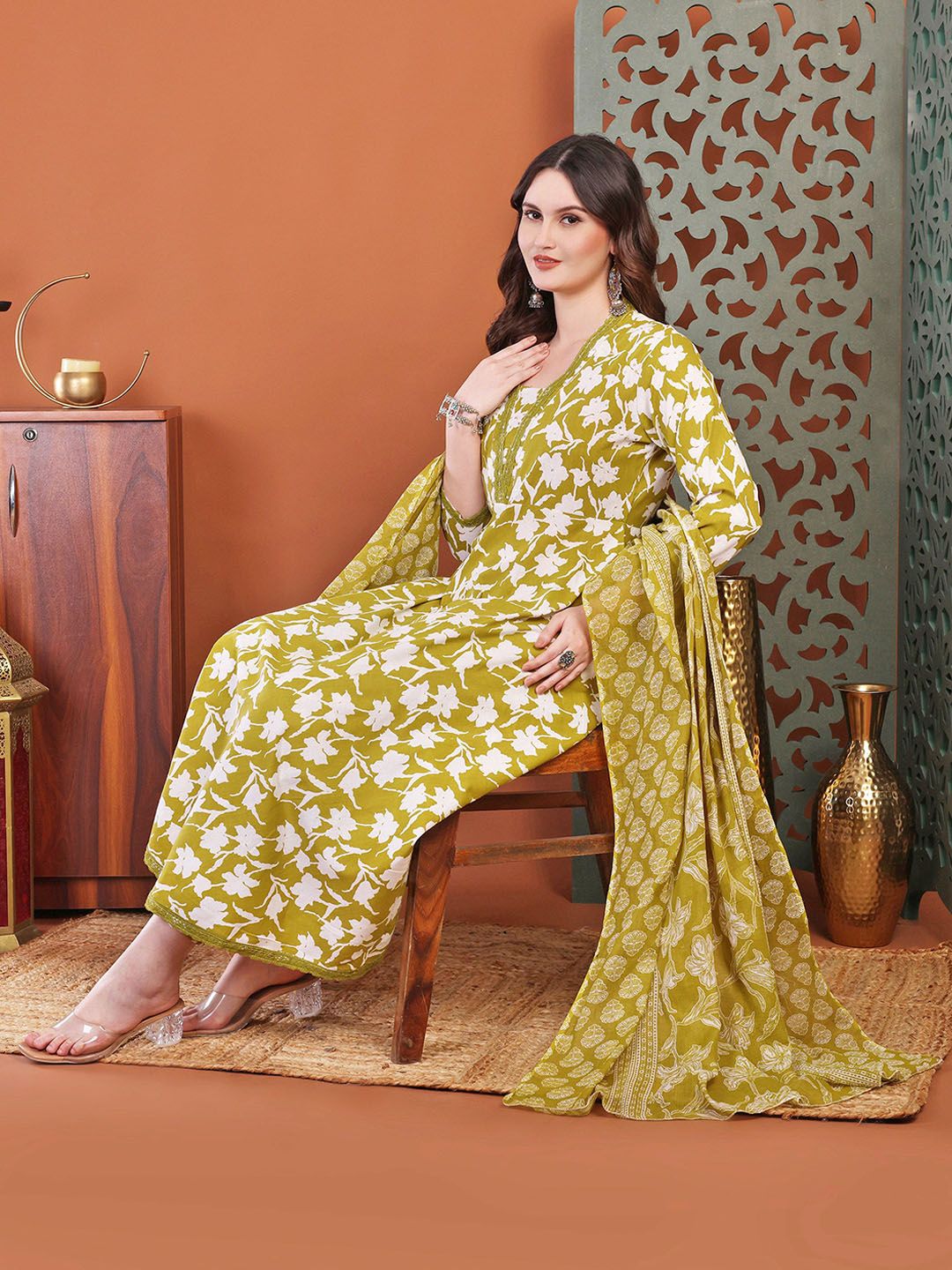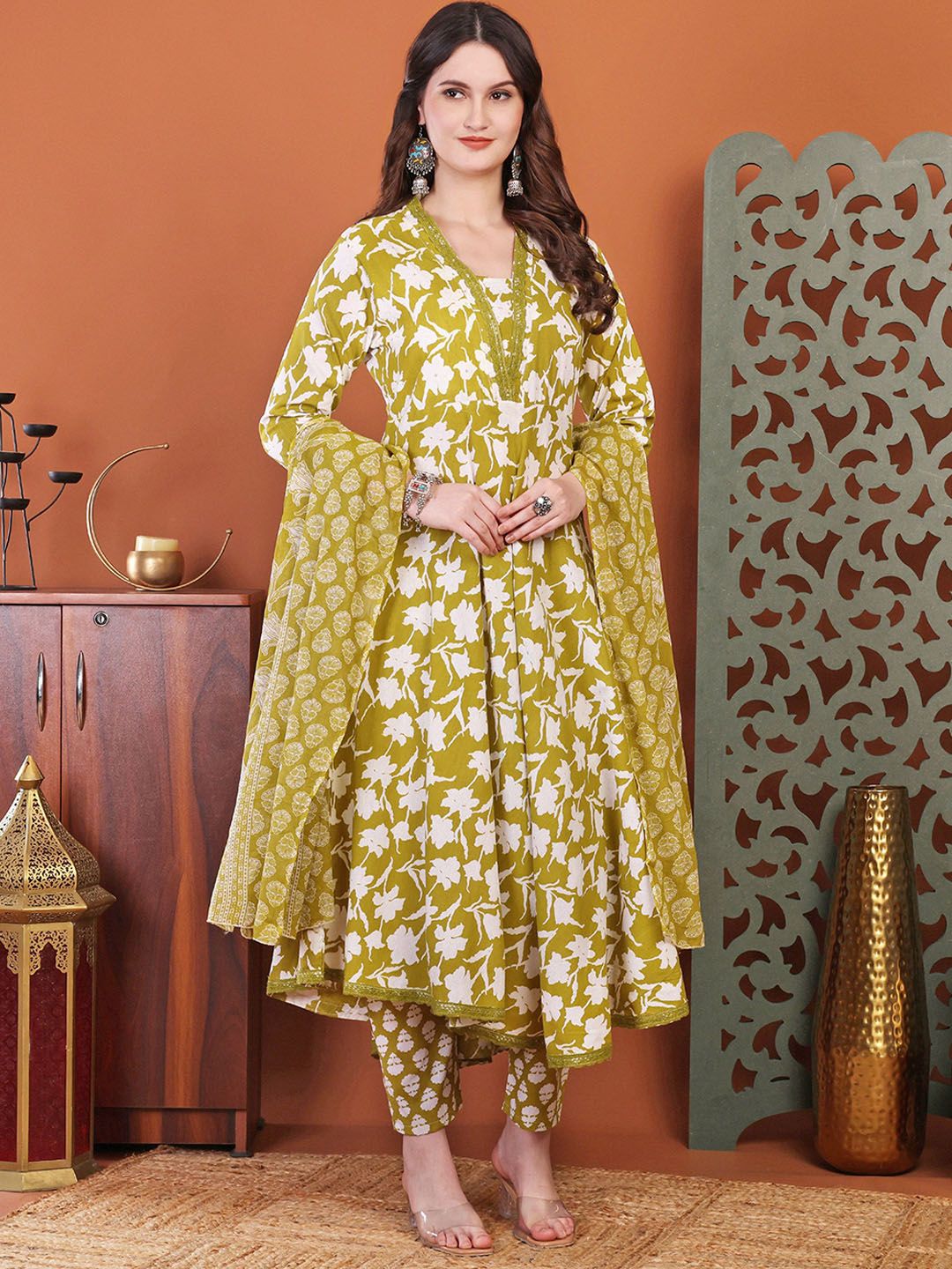 SINGNI Women Floral Printed Cotton Anarkali Kurta with Trousers & Dupatta