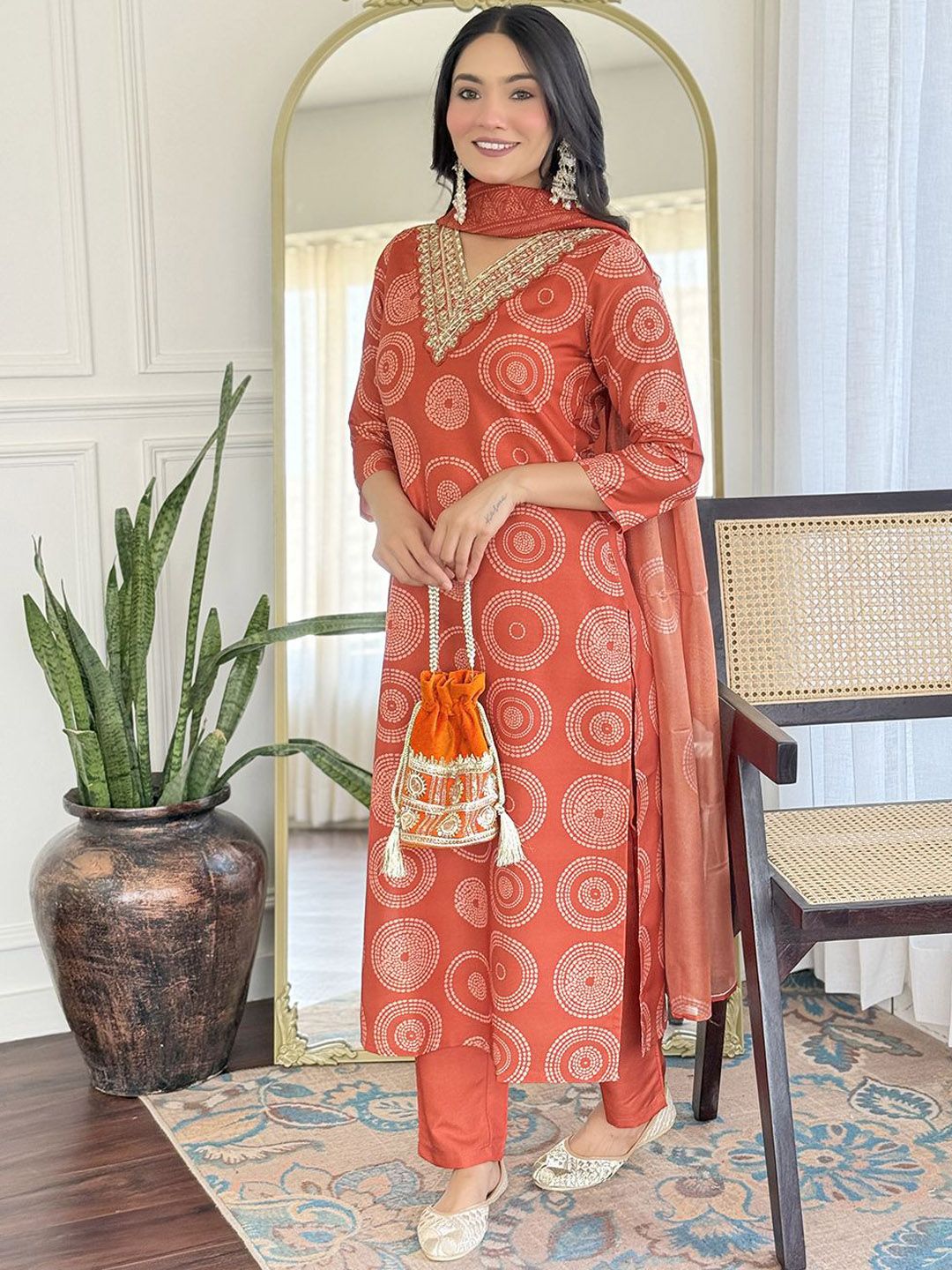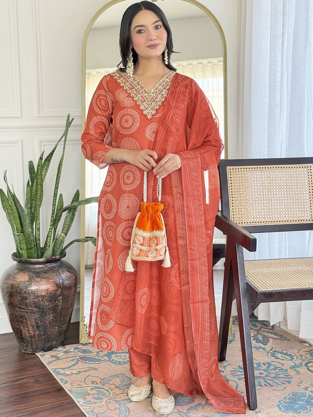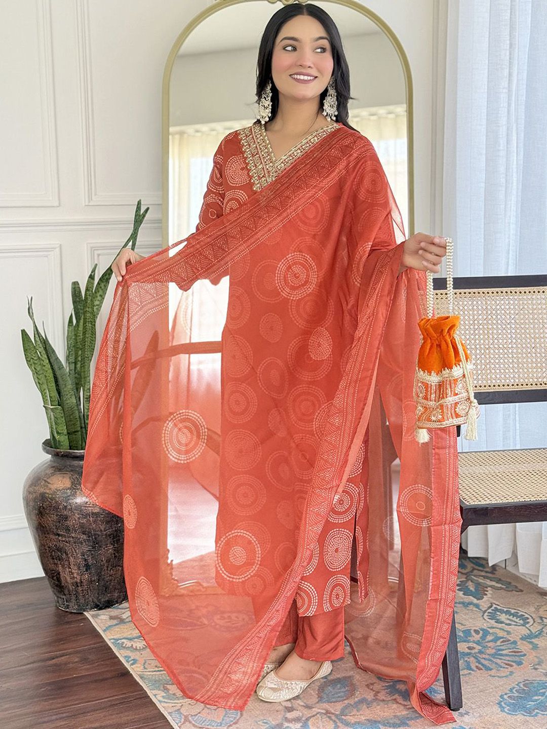 S.K.C Women Bandhani Yoke Design Kurta with Trousers & Dupatta