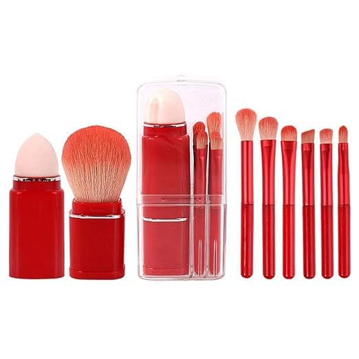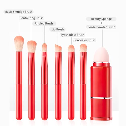 SKINPLUS 8 PCS Makeup Brush Set, 8 in 1 Portable Brush Set, Small Multifunctional Cosmetic Brushes with Portable Case (Red)