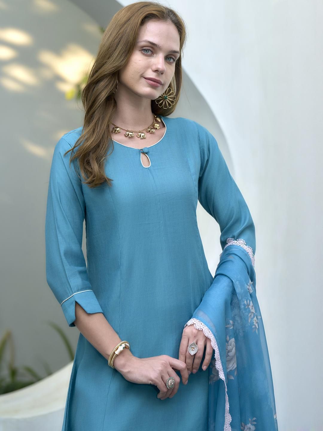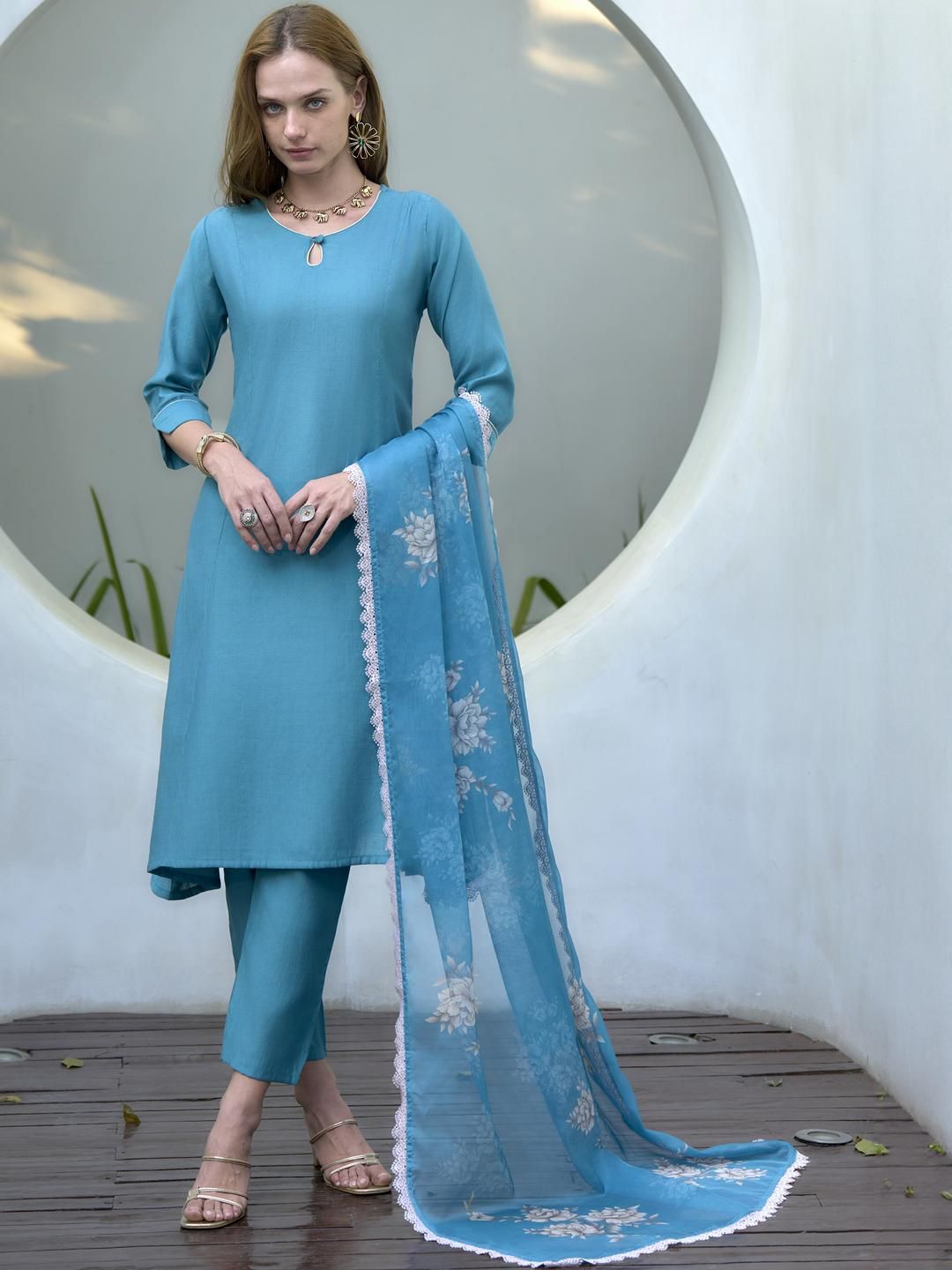 Sky Blue Solid Kurta Set with Floral Organza Dupatta | Elegant Daily & Festive Wear