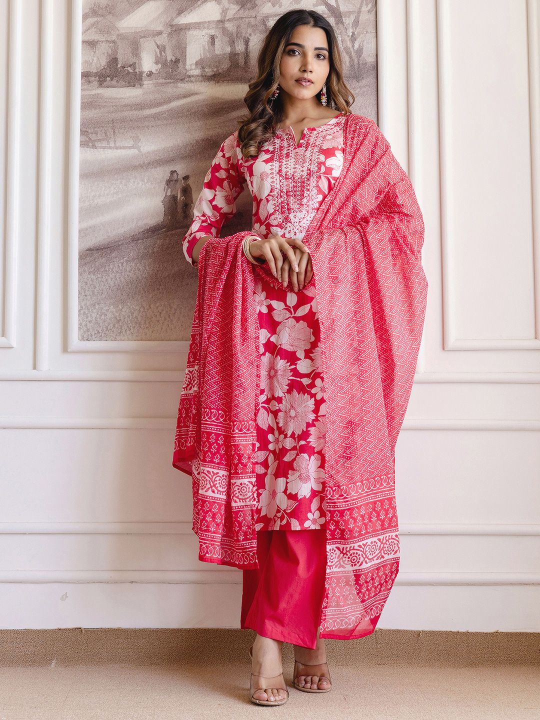 SKYLEE Floral Printed Mirror Work Straight Kurta With Trousers And Dupatta