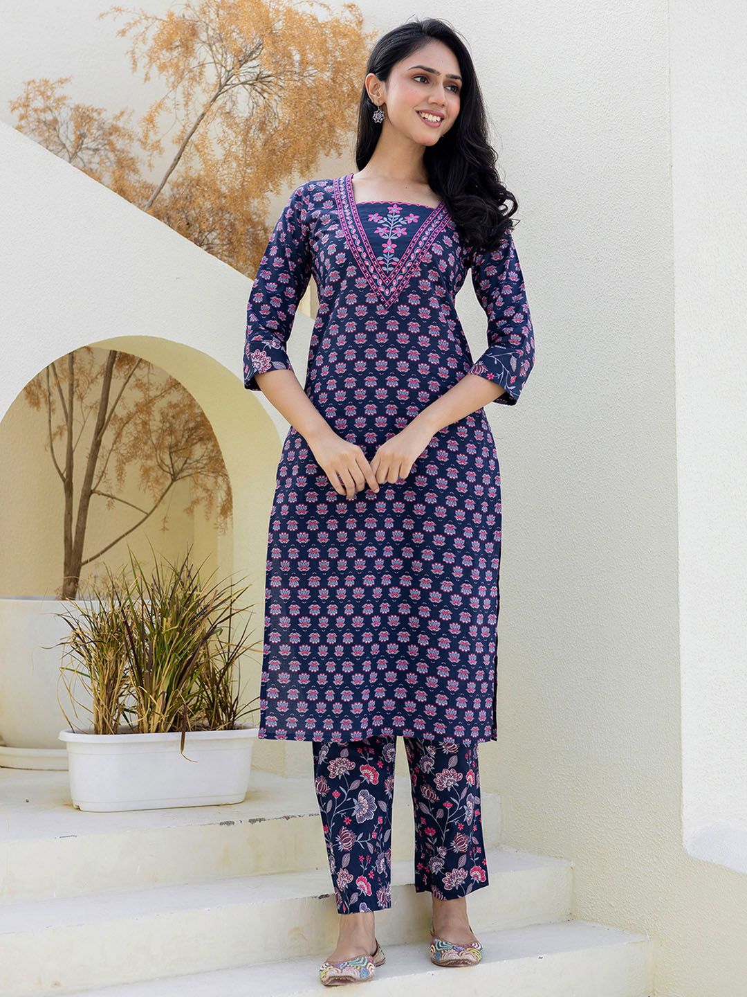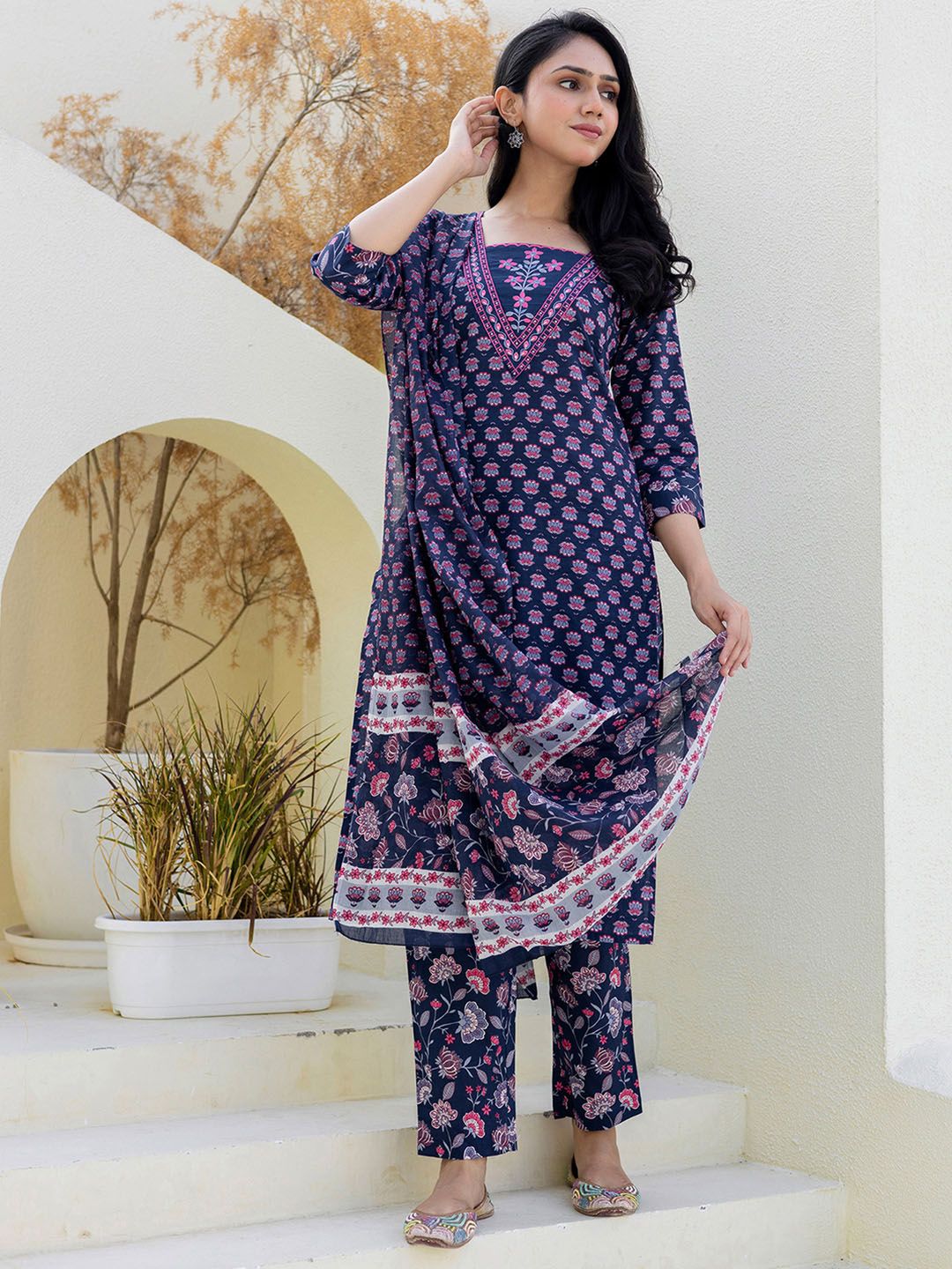 SKYLEE Floral Printed Notch Neck Sequinned Straight Kurta With Trouser & Dupatta