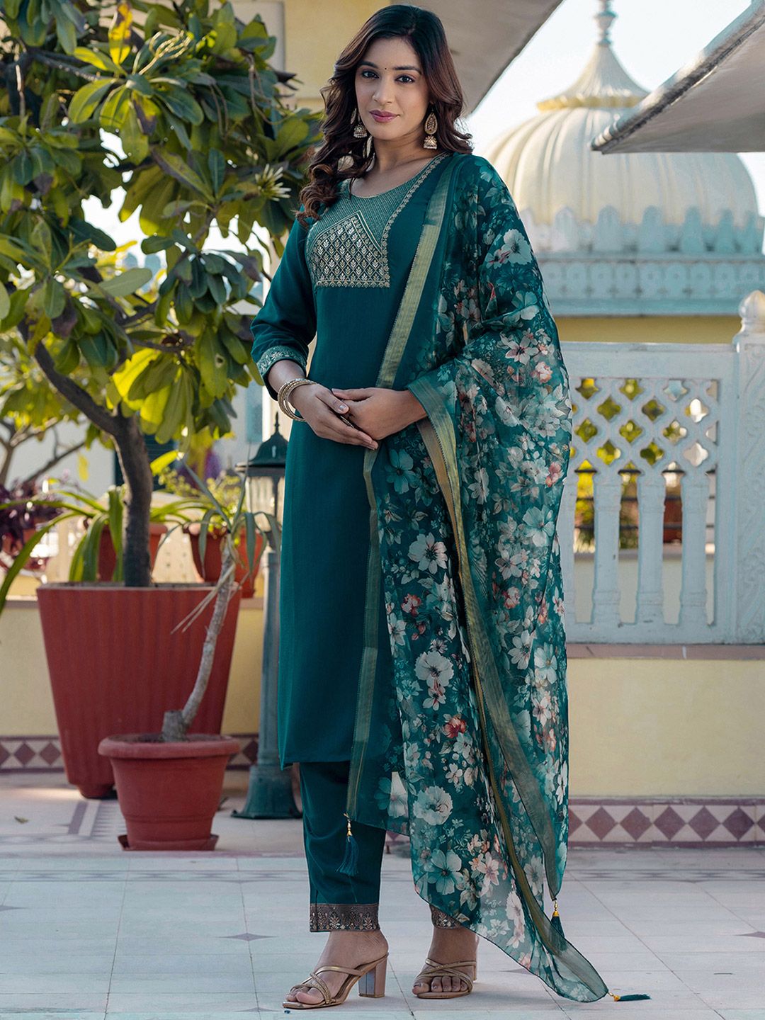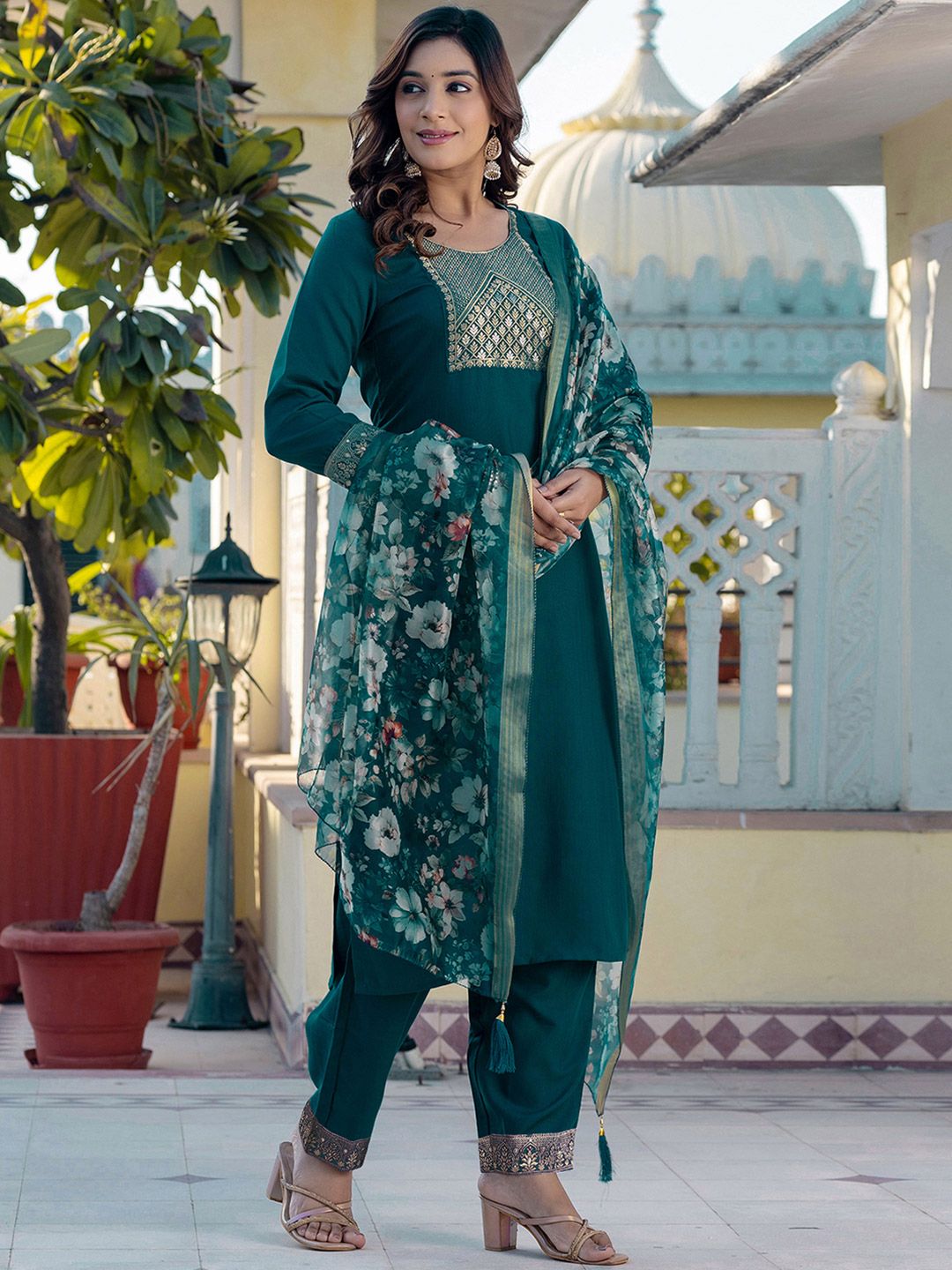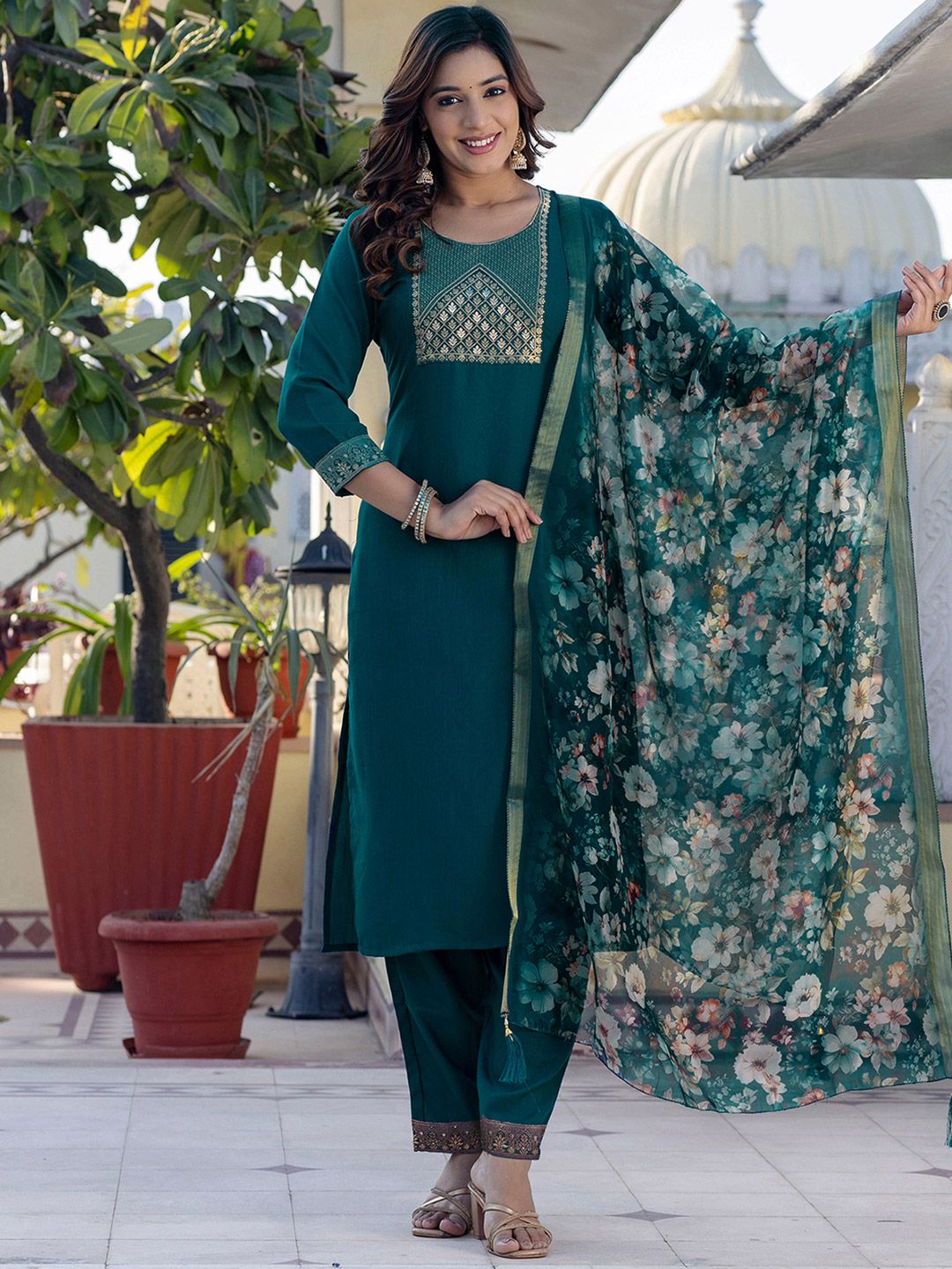 SKYLEE Floral Printed Regular Straight Kurta With Trousers And Dupatta