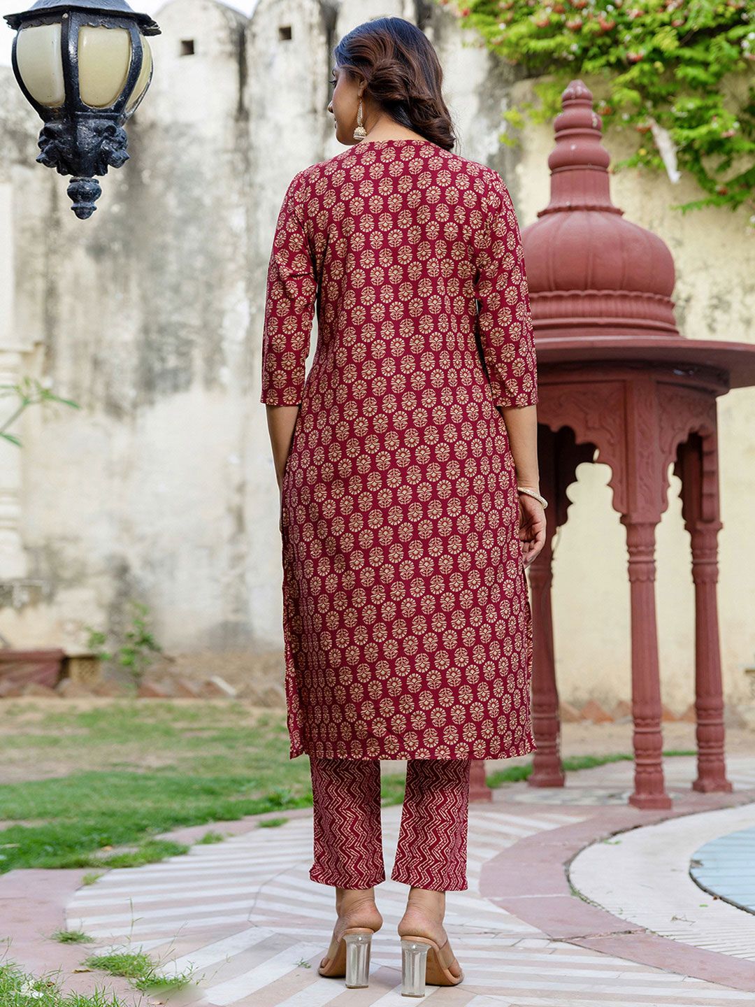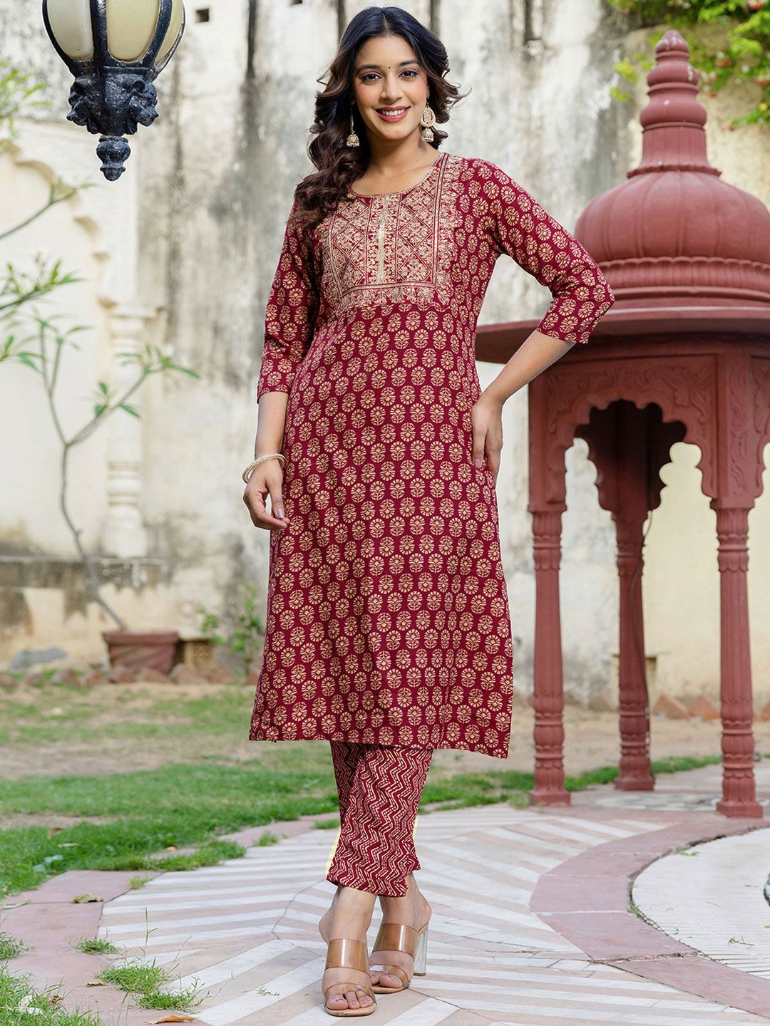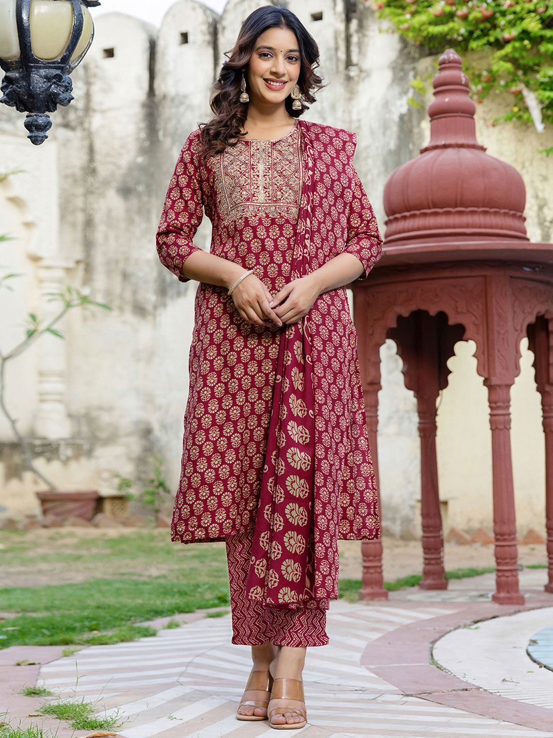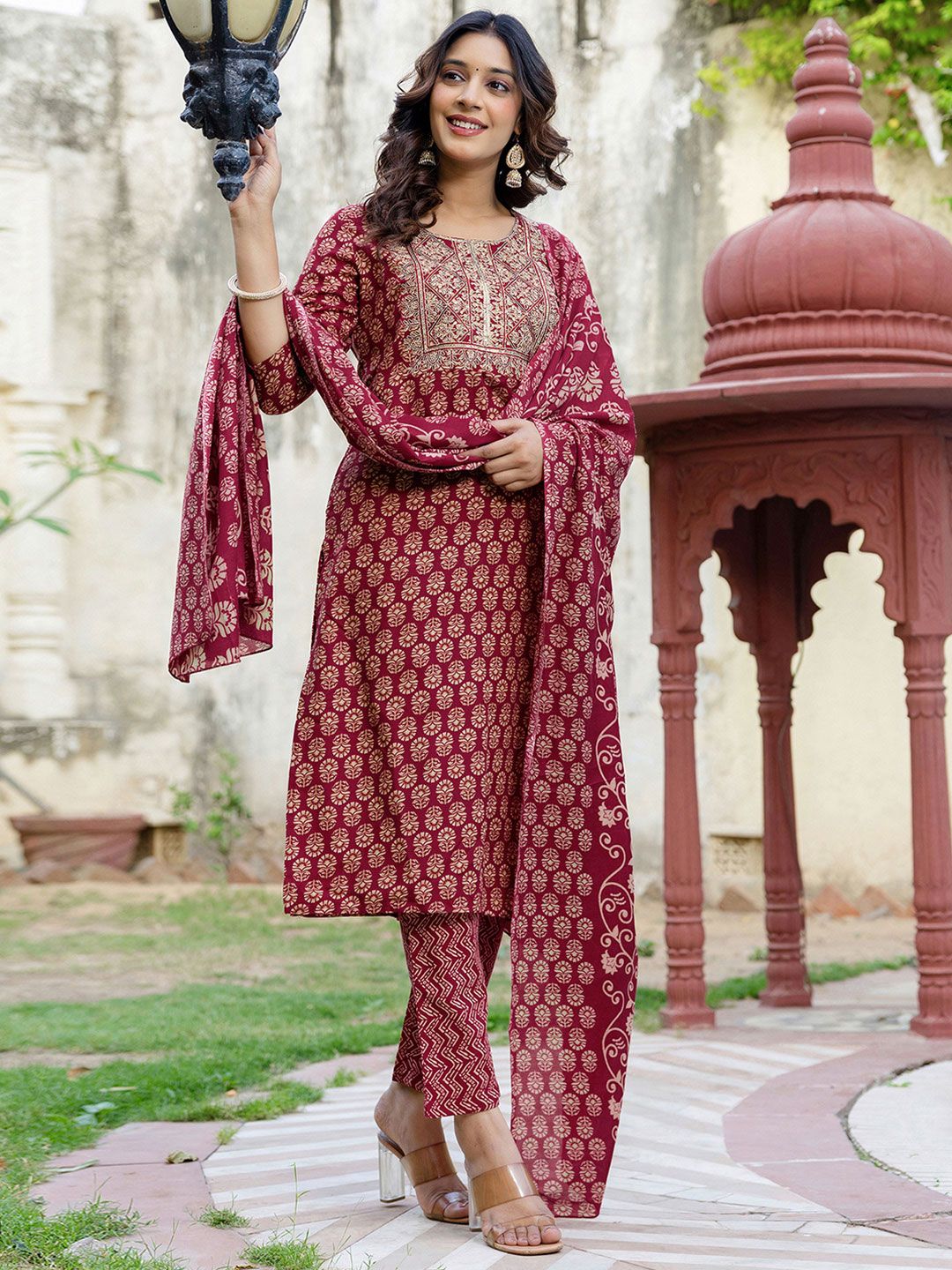 SKYLEE Floral Printed Round Neck Sequinned Kurta With Trousers & Dupatta