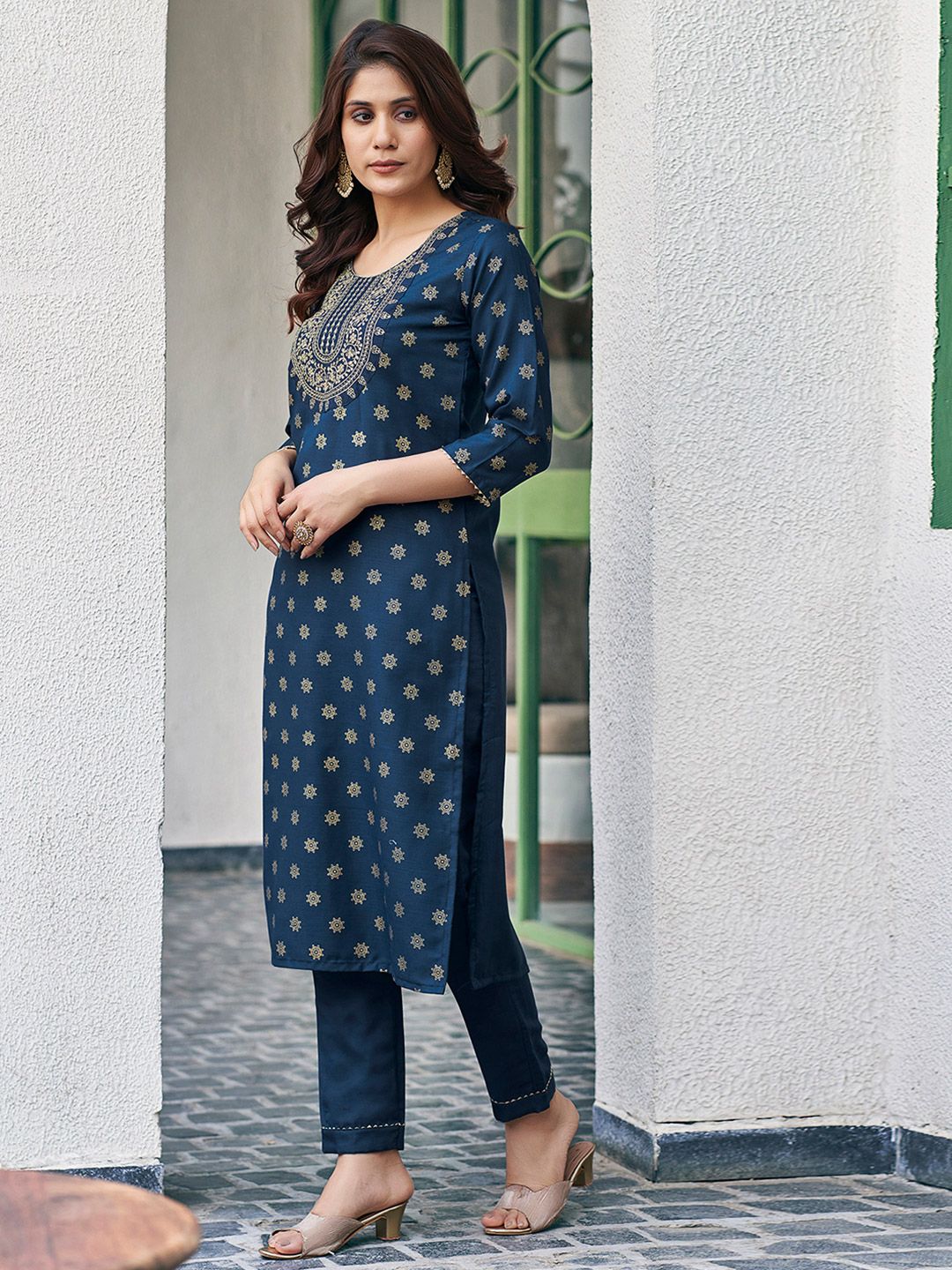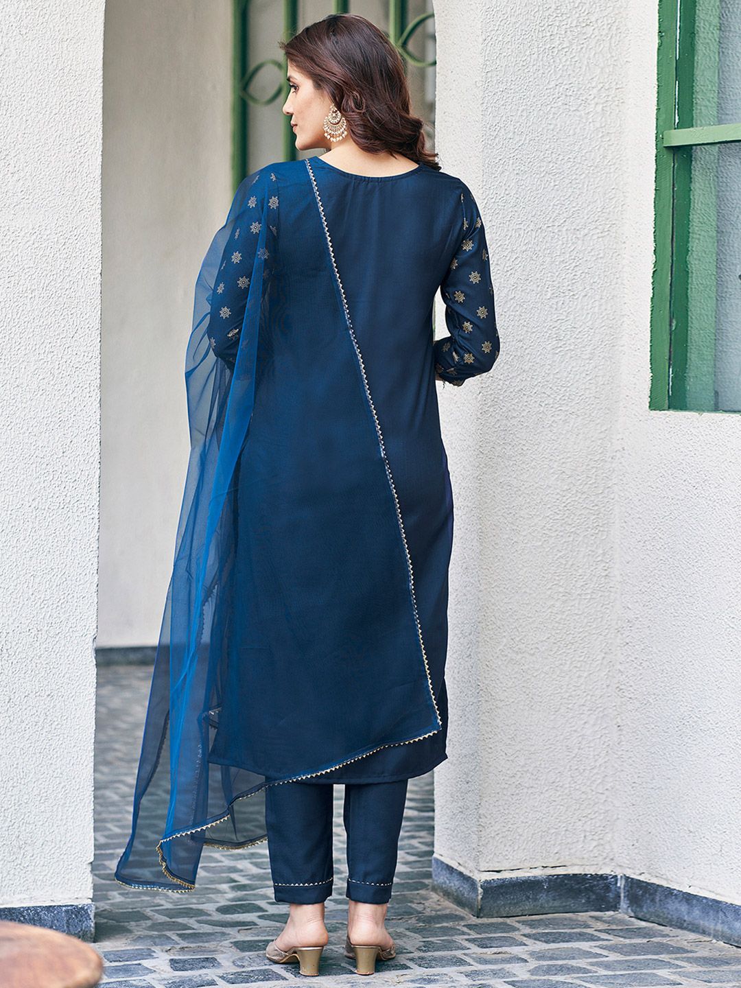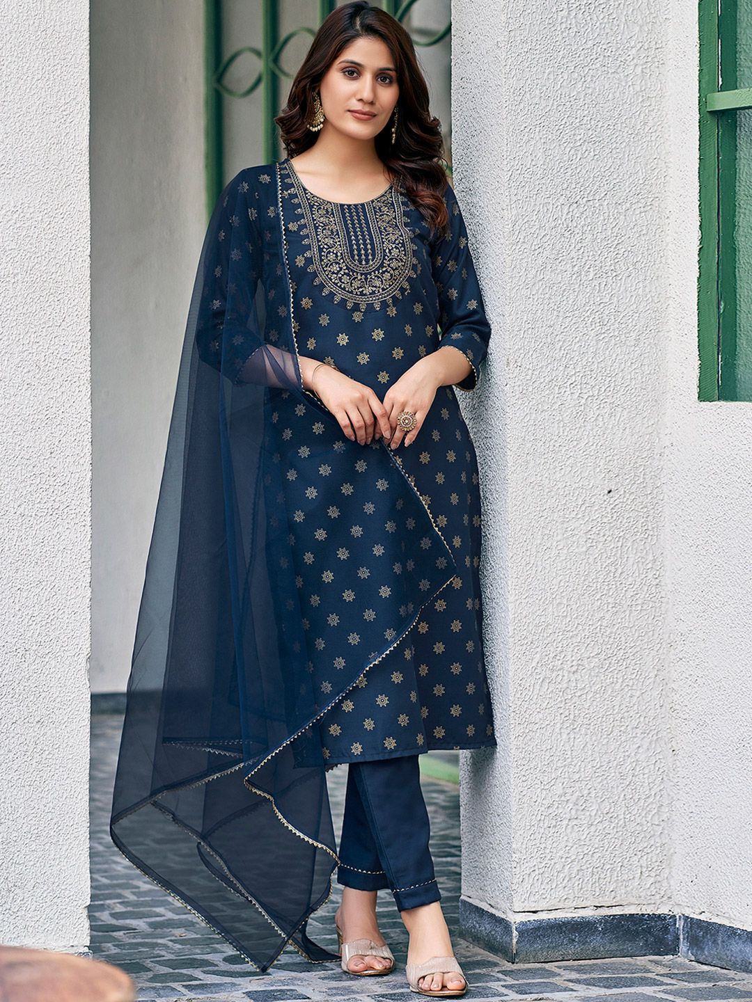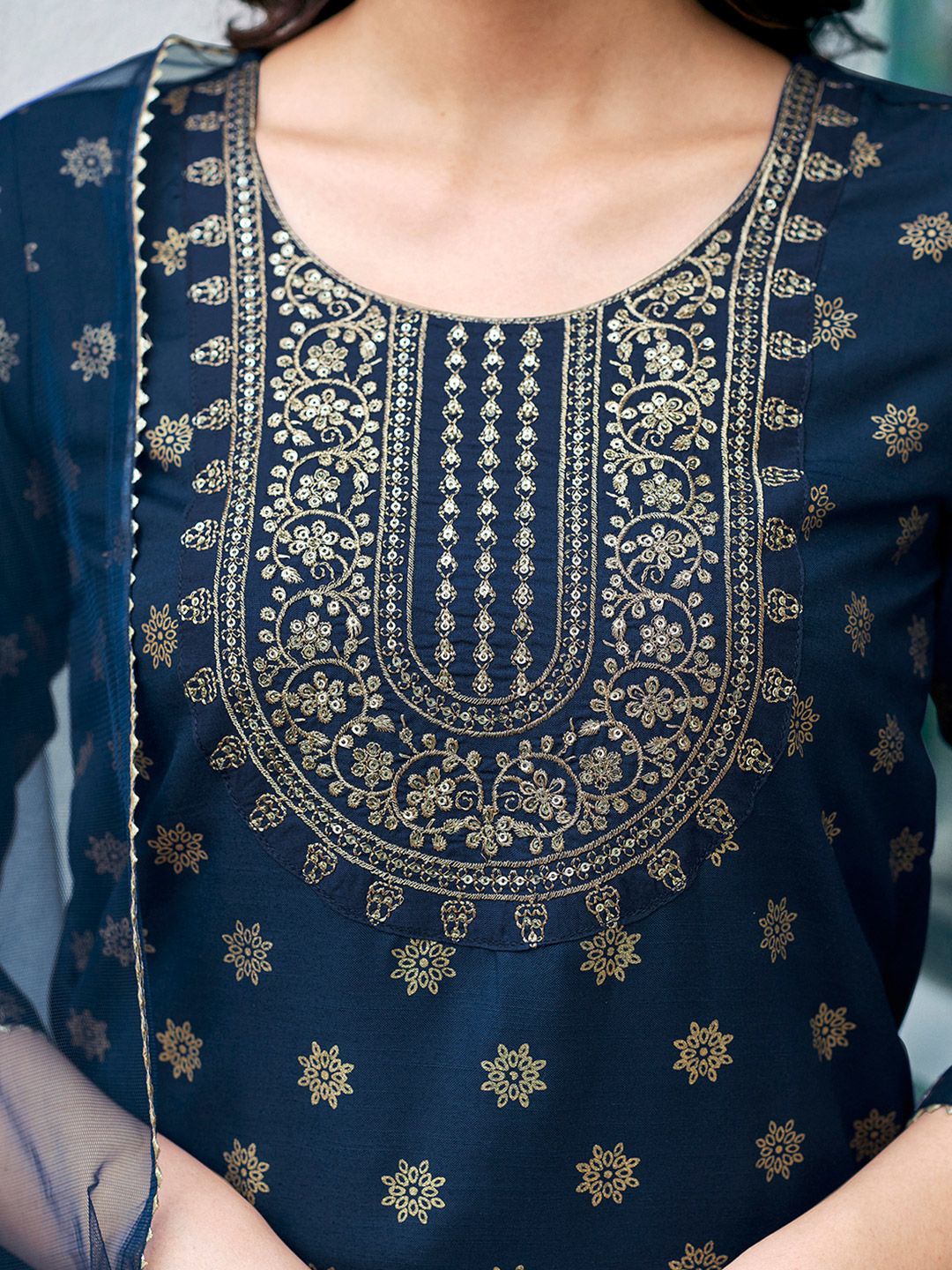 SKYLEE Floral Printed Round Neck Sequinned Straight Kurta With Trouser And Dupatta