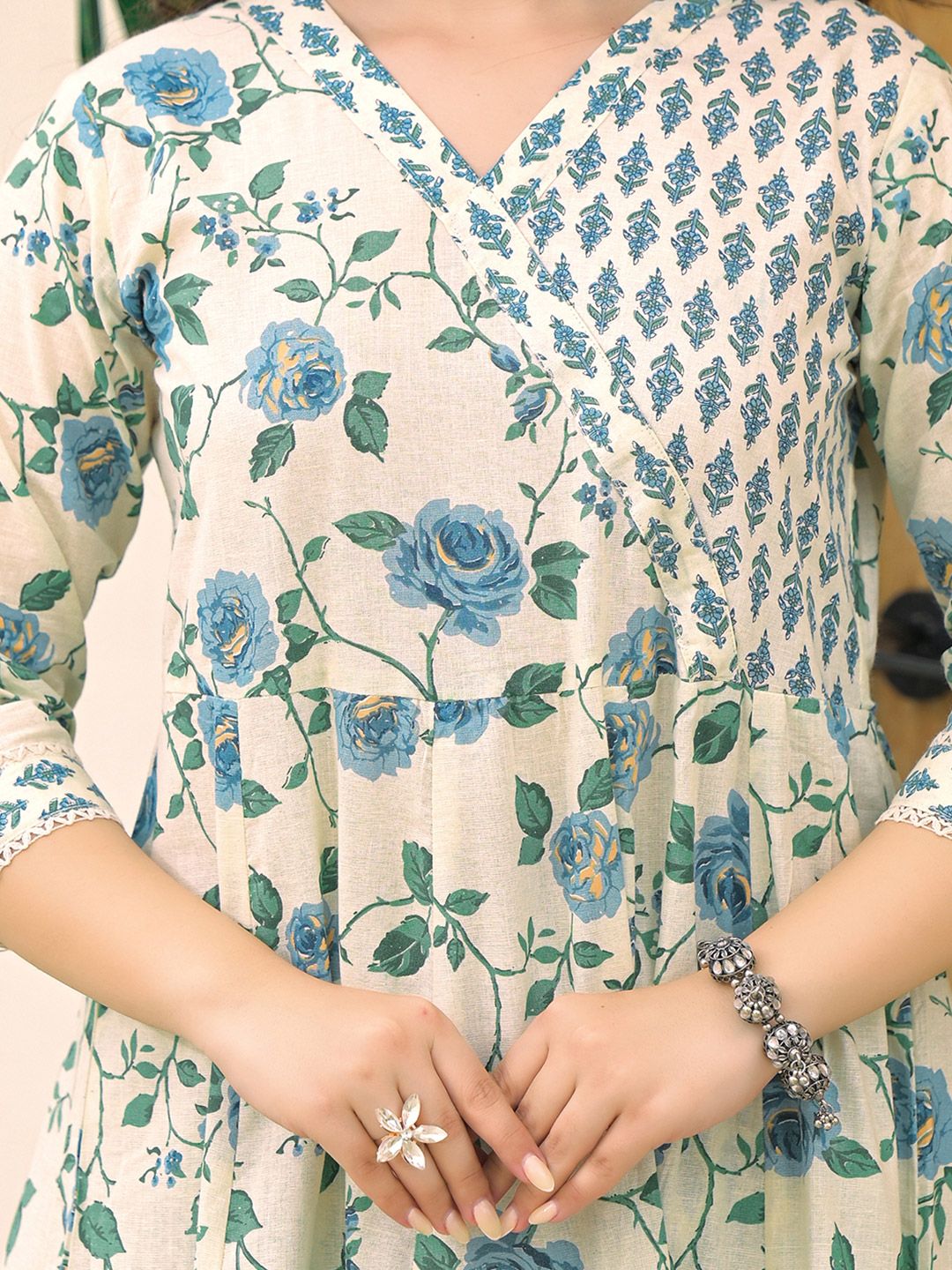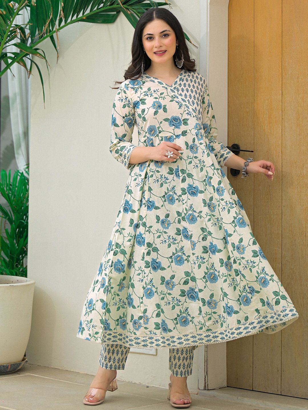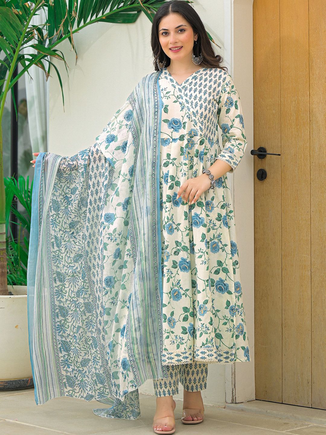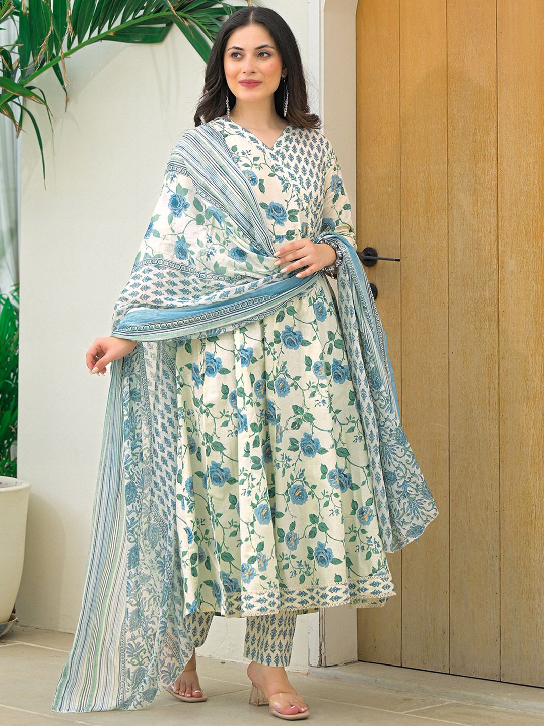 SKYLEE Floral Printed V-Neck Kurta With Trousers & Dupatta