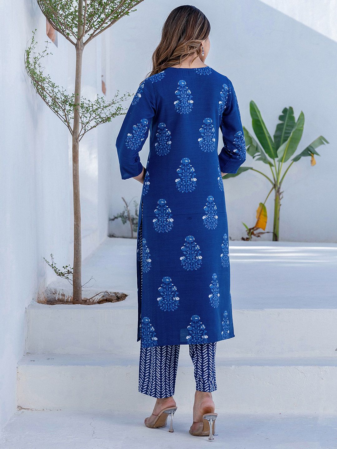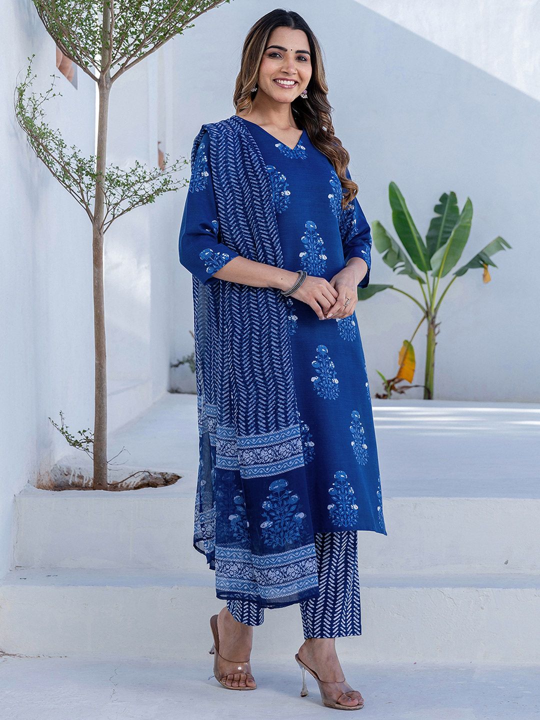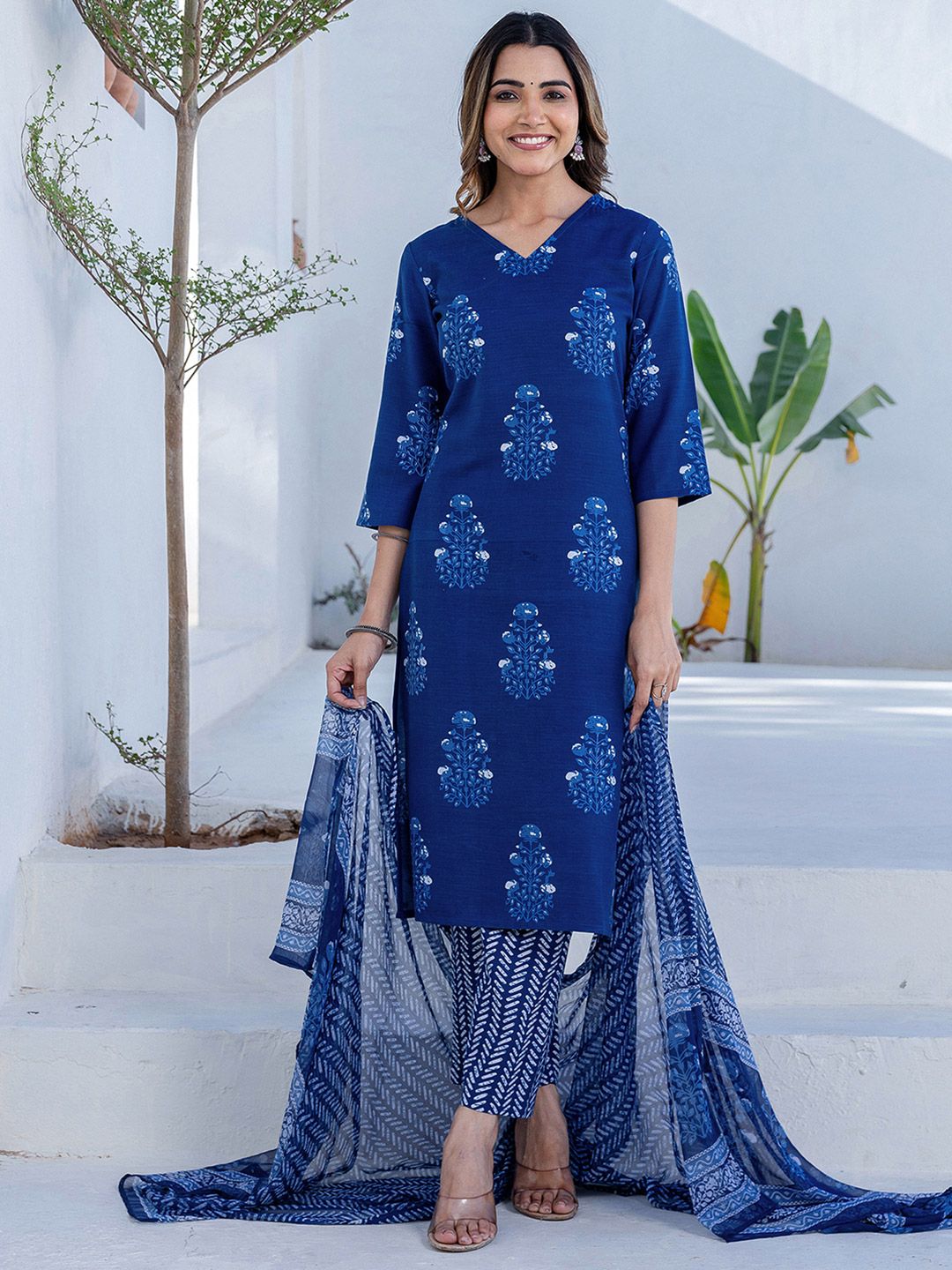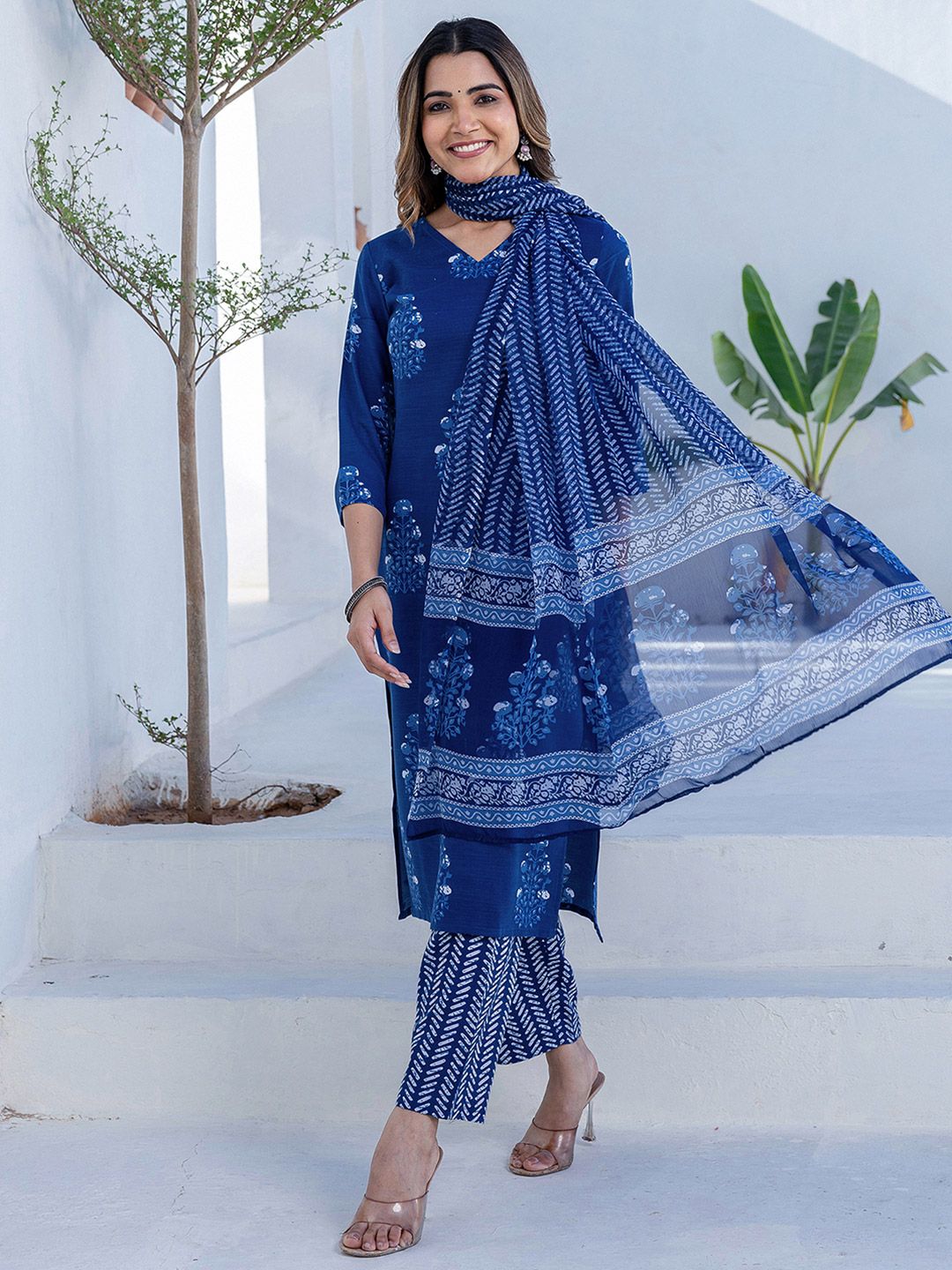 SKYLEE Floral Printed V-Neck Straight Kurta With Trousers & Dupatta