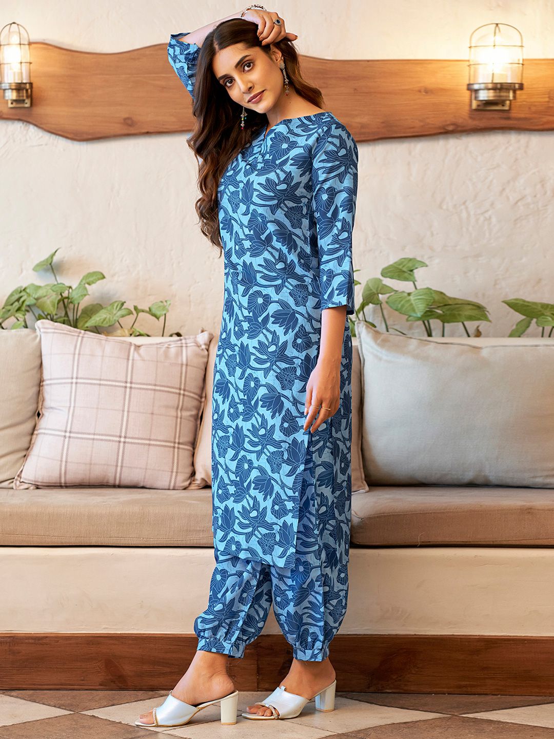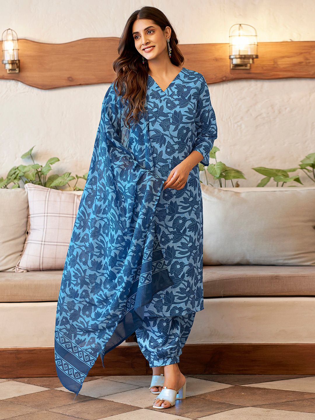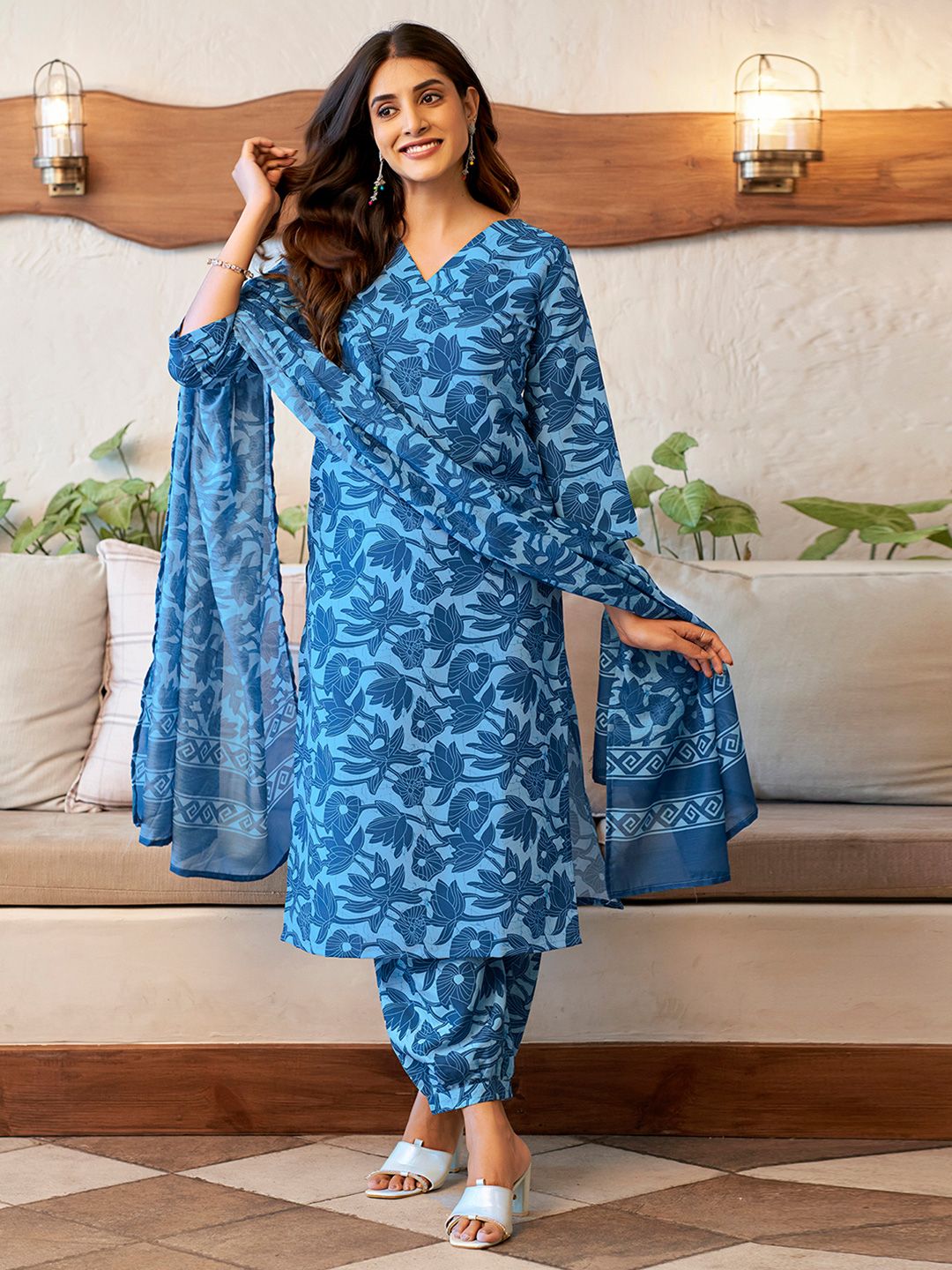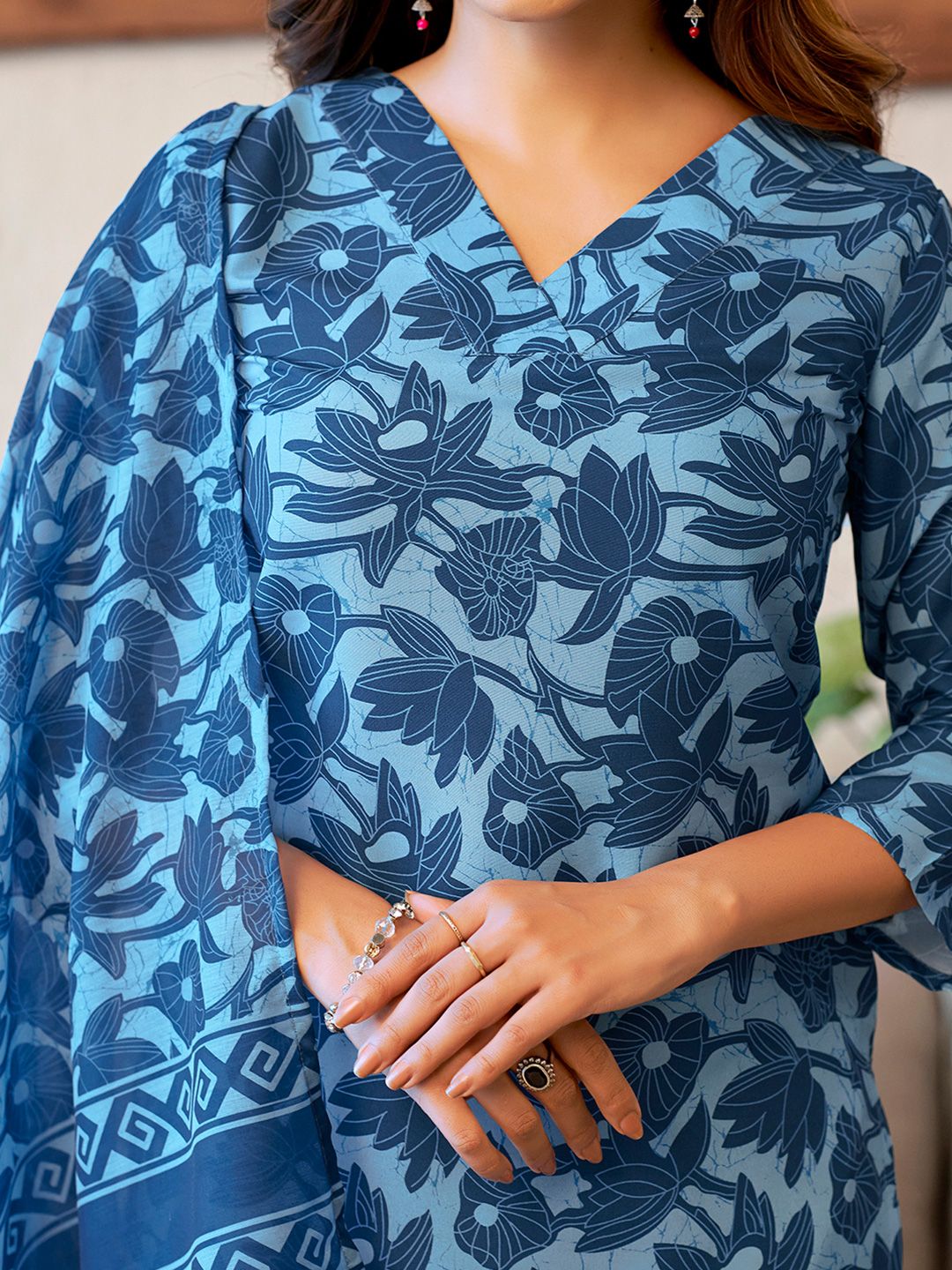 SKYLEE Floral Printed V-Neck Straight Kurta With Trousers & Dupatta
