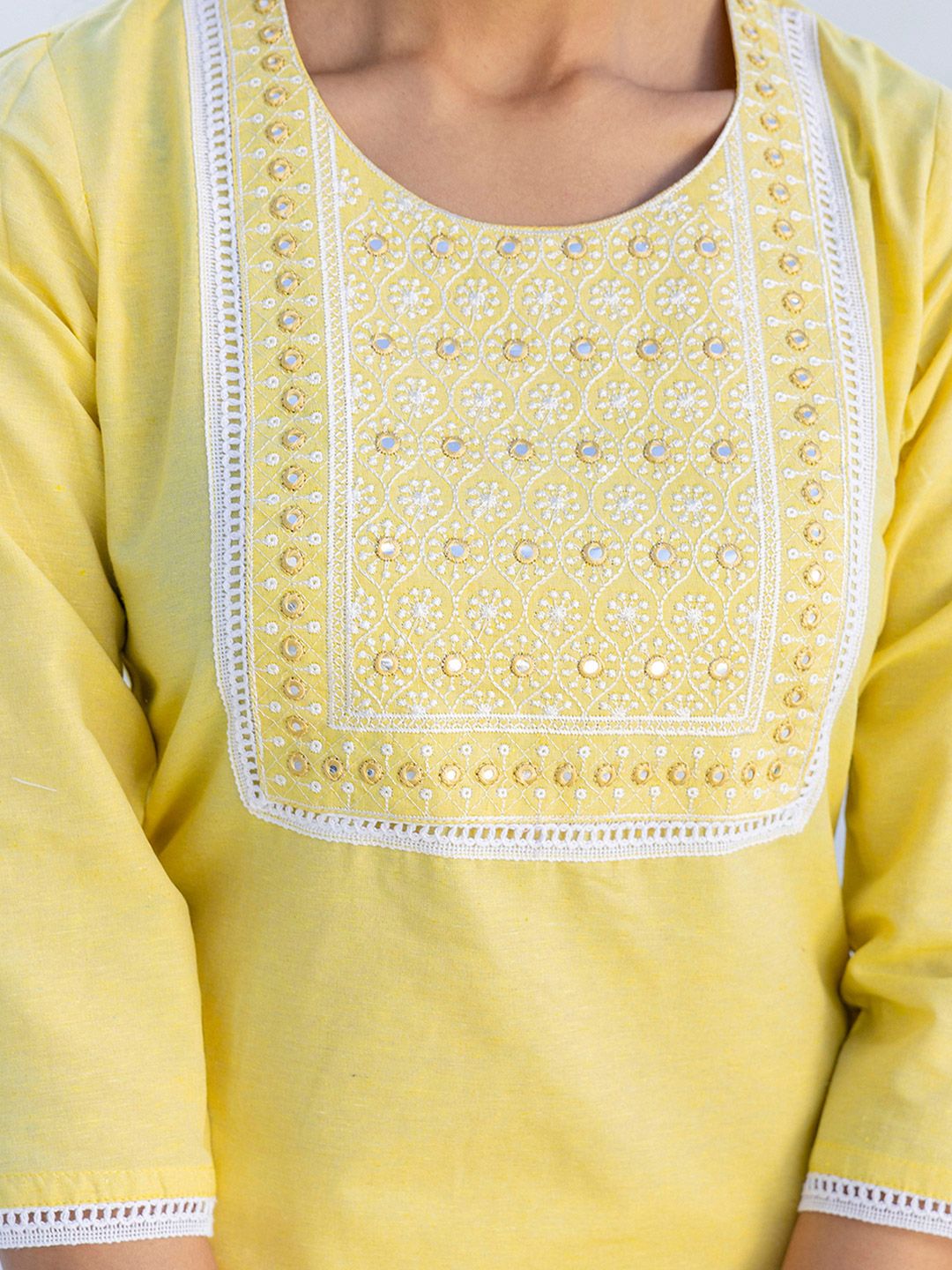 SKYLEE Floral Yoke Design Round Neck Mirror Work Straight Kurta With Trousers & Dupatta