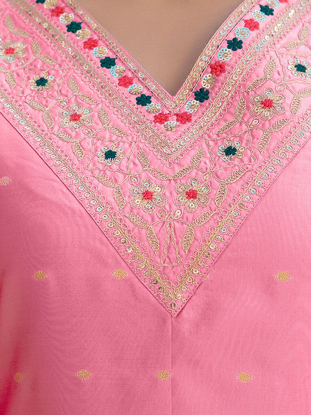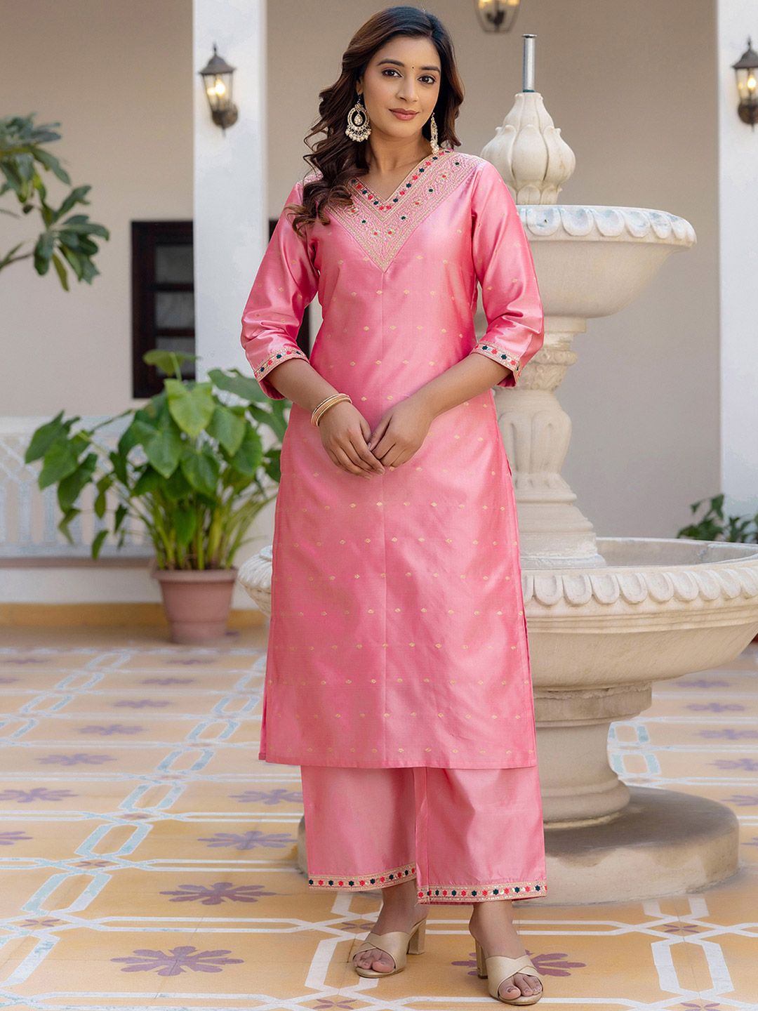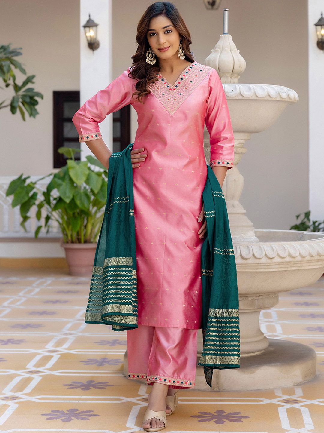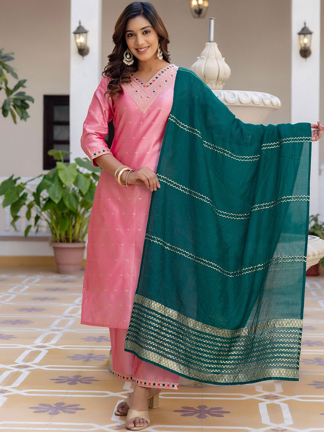 SKYLEE Geometric Woven Design V-Neck Thread Work Straight Kurta With Palazzo And Dupatta