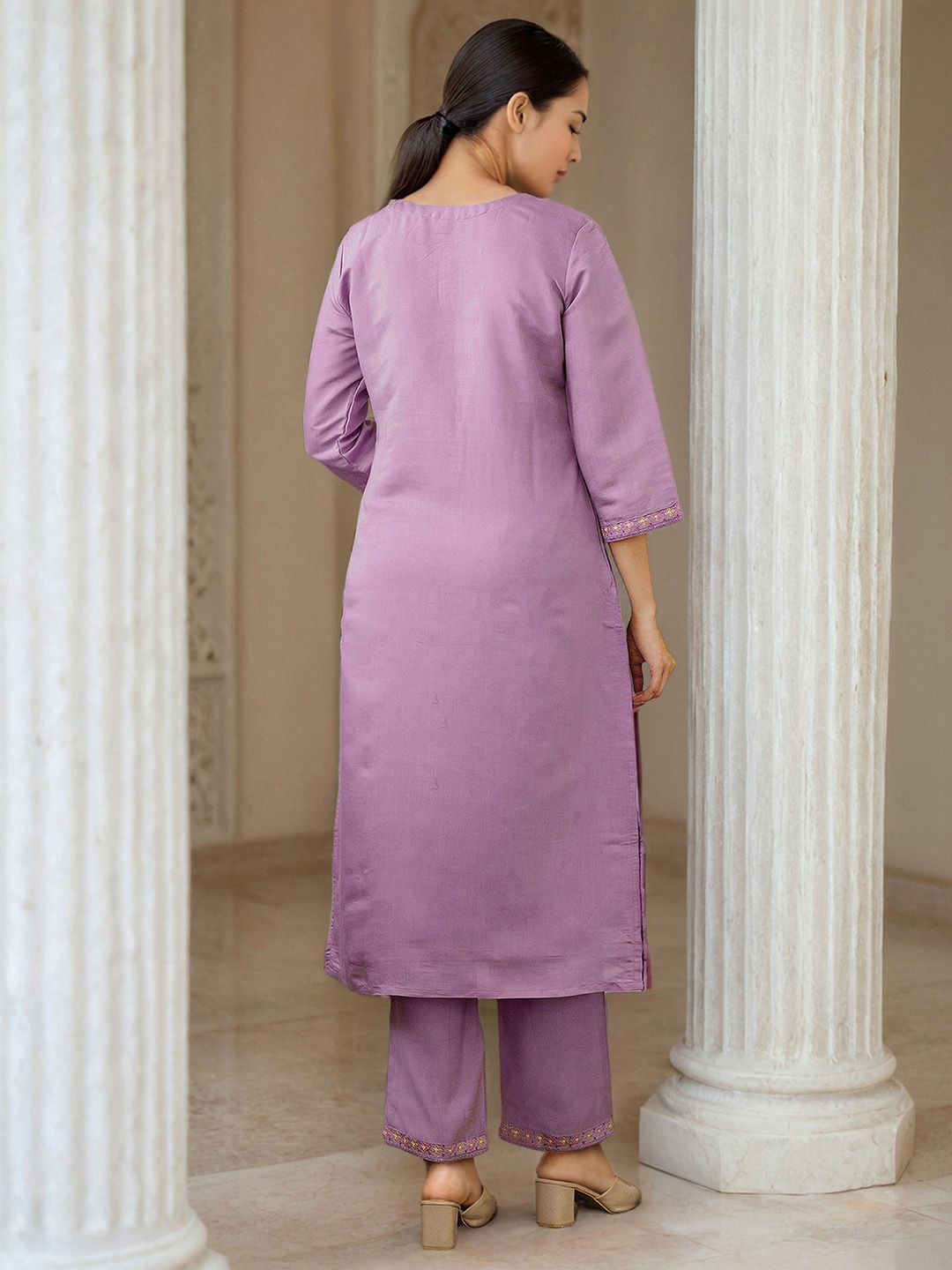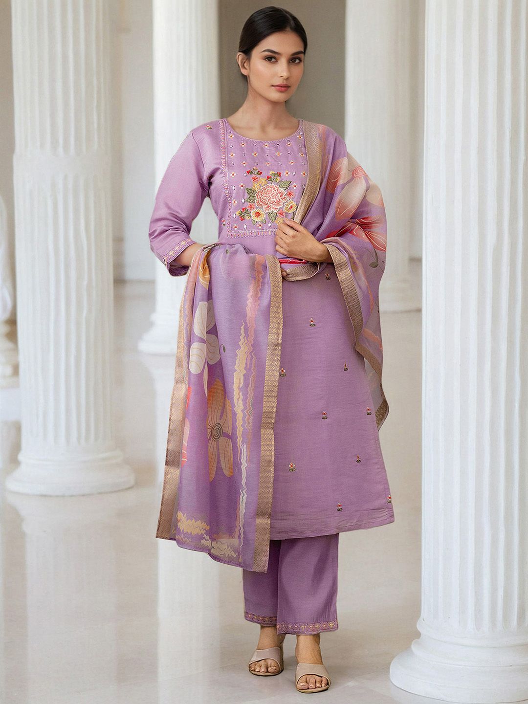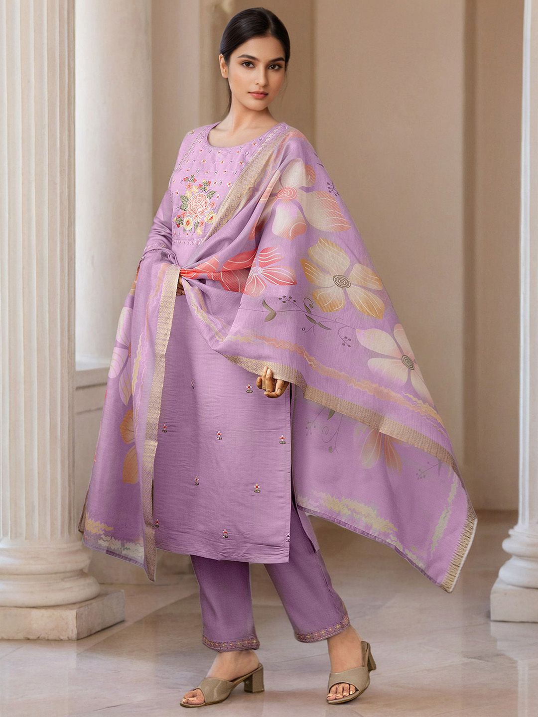 Skylee Pop Floral Embroidered Mirror Work Straight Kurta With Trousers & Dupatta