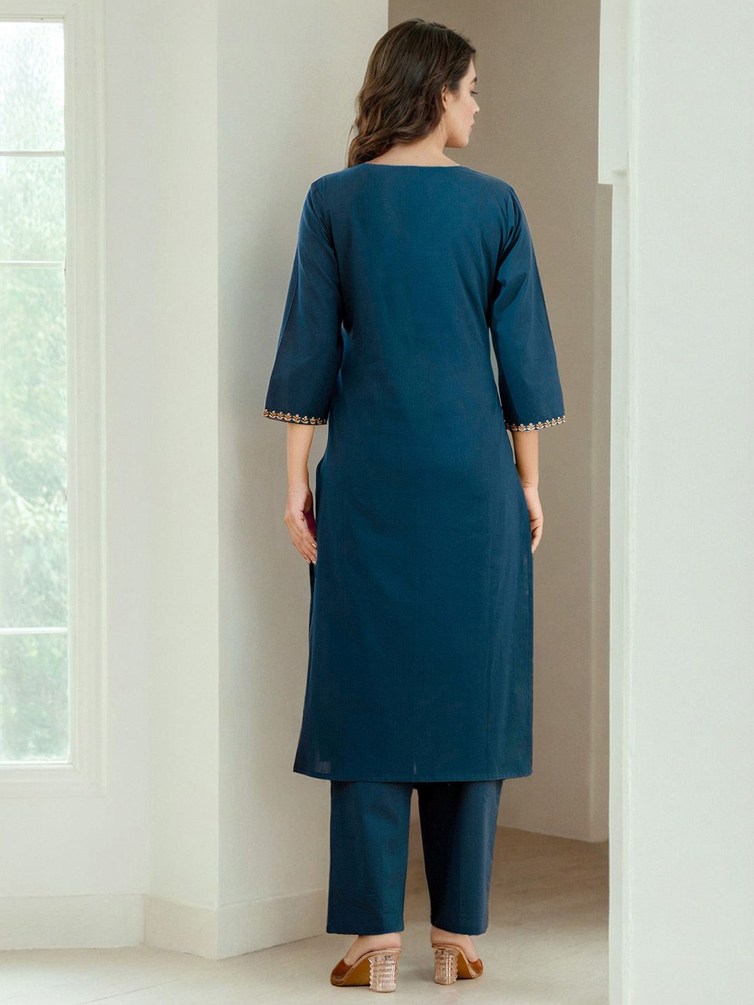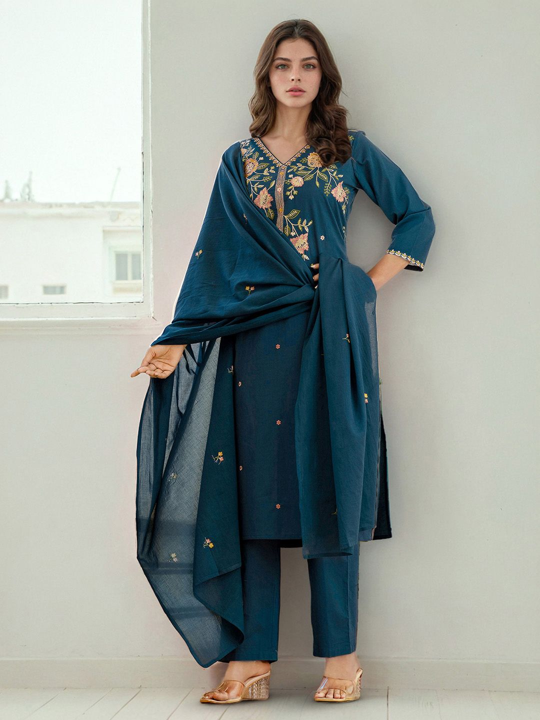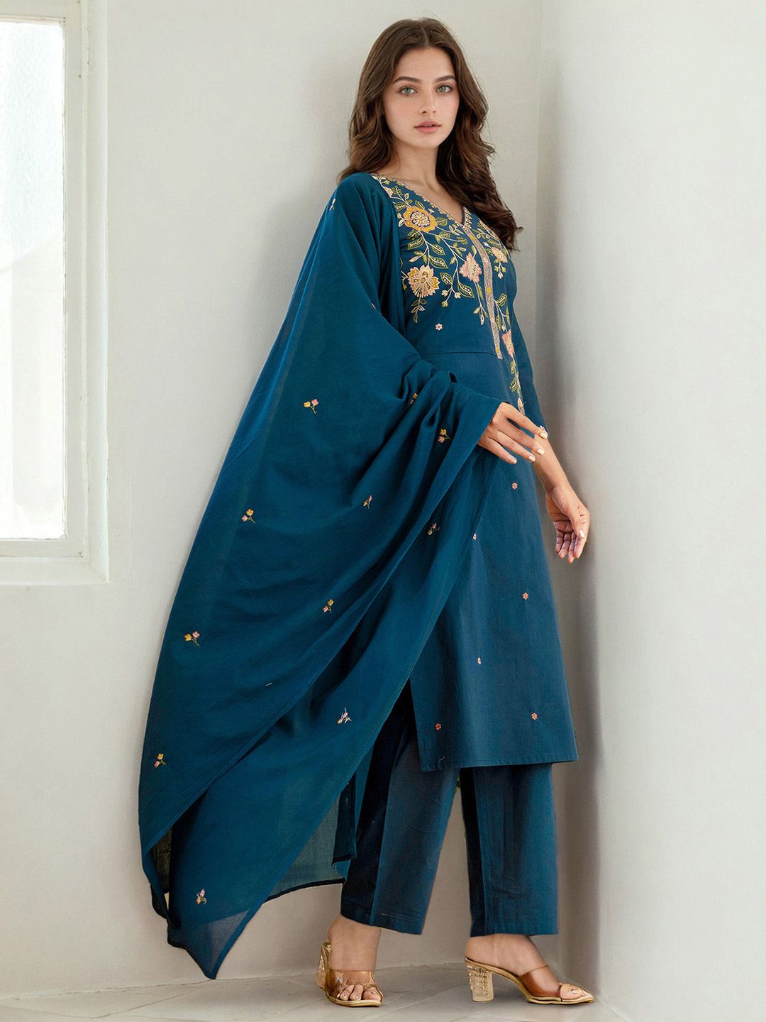 Skylee Pop Floral Embroidered Sequinned Straight Kurta With Trousers & Dupatta