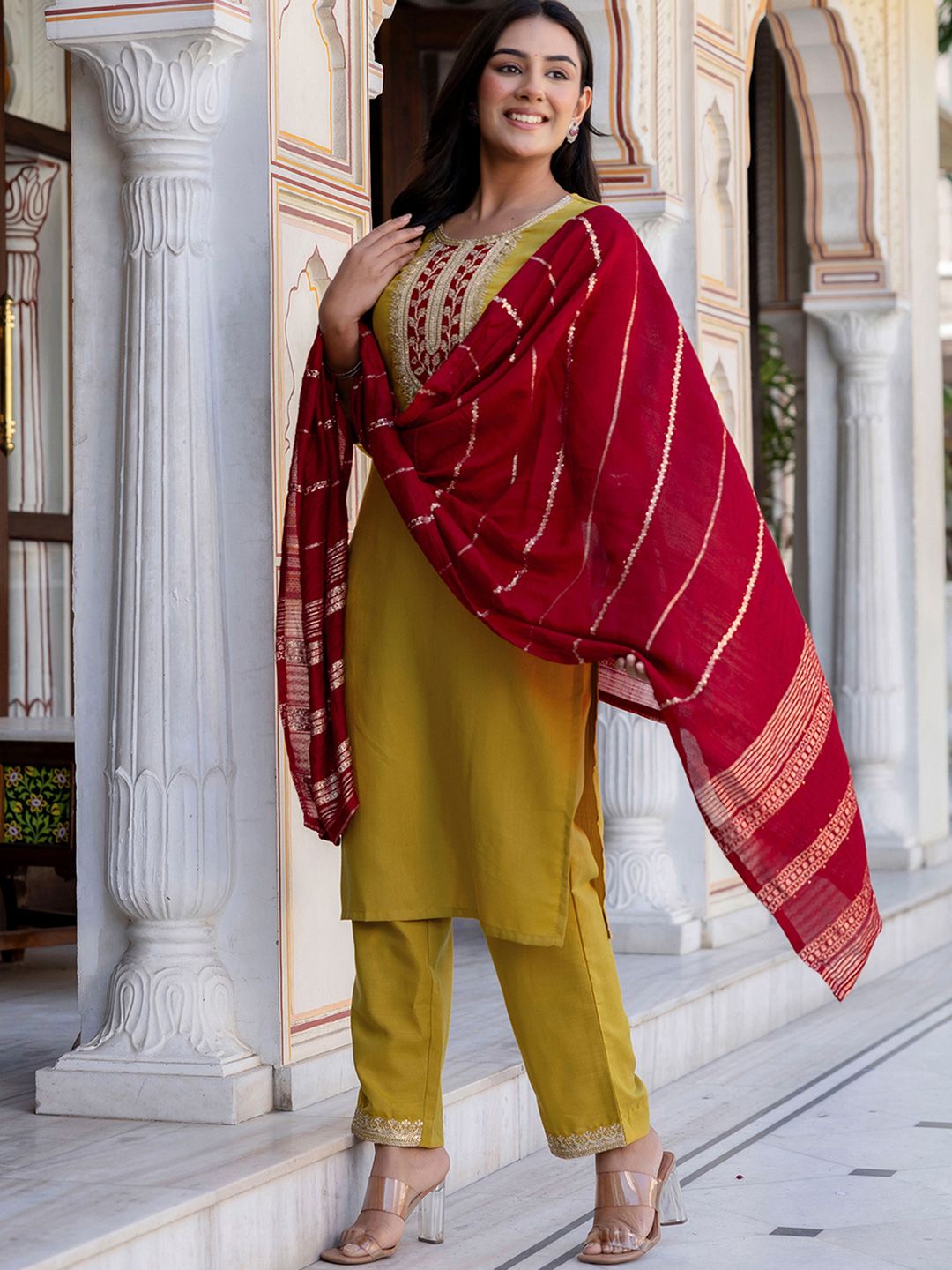 SKYLEE Women Ethnic Motifs Embroidered Sequinned Kurta with Trousers & With Dupatta