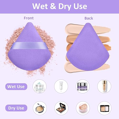 .???Triangle Shape?These powder puffs come with a triangle shape and arc bottom edge design, you can use the round side to the applicate foundation on your cheek and forehead, choose the triangle side when you put foundation on the eye and nose around. Special design makes the face sponge will not get too much powder, instead which will help you save more powder. ???Comfortable & Soft? Our powder puff is made of velour and cushiony sponge. Velvety-soft, give you comfortable skin touch. Can be used for any type of skin. This wet and dry dual-use makeup puff is soft to touch, natural and even makeup, won't make your skin feel uncomfortable, it acts like a barrier against the skin. ???Dual-Used? Our triangular makeup puffs are suitable for dry and wet cosmetics, such as foundation, blush, loose powder, powder, body powder, concealer, etc. easy to apply on the nose or eyes, but if you wear this makeup soft sponge, it could delicately apply your makeup. ???Package Content?A pack of 4PCS Triangle powder puffs comes with 1 strap for you to hold well and use easily. The strap design could allow you to steadily hold this makeup puff without sliding or falling off. ???Washable & Reusable? What’s more, the puff is washable, easy to keep the puff clean, and just needs to let air dry. The nice quality powder puffs are very suitable for sensitive skin. suitable for oily skin, neutral skin, dry skin, mixed skin, or sensitive skin.