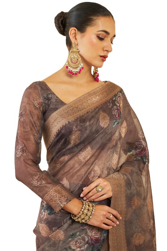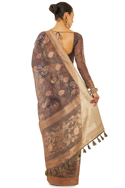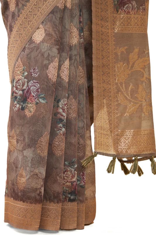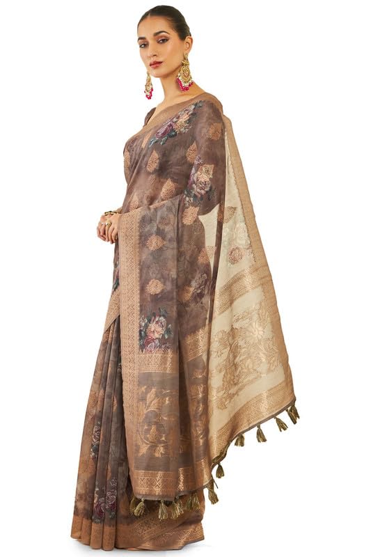 Soch Womens Earth Tussar Silk Saree With Floral Print And Zari Woven Designs