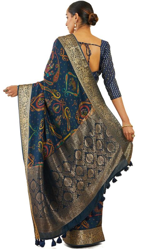 Soch Womens Navy Blue Crepe Saree With Ethnic Print And Zari Borders