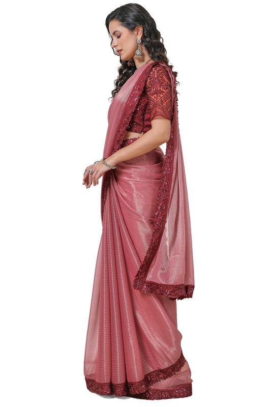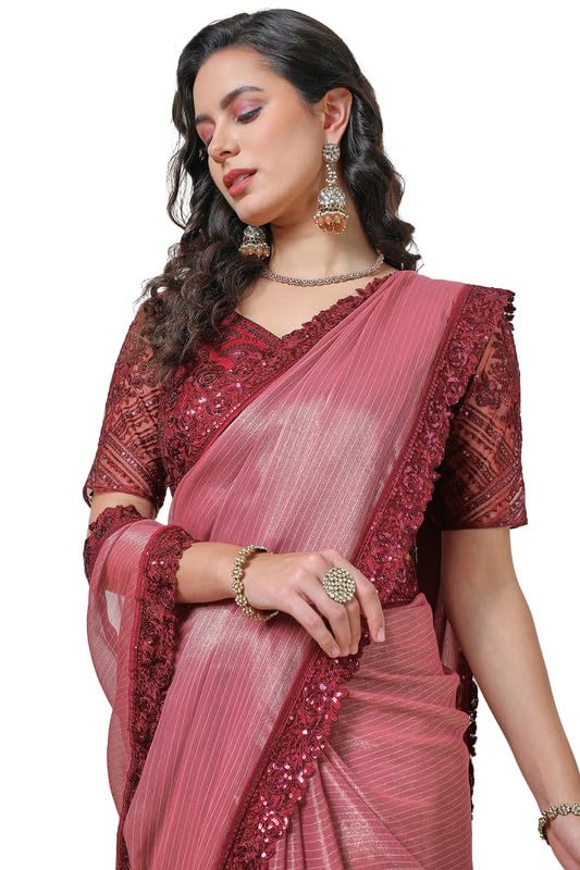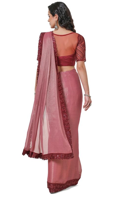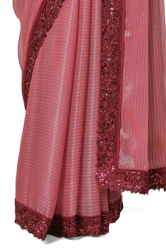 Soch Womens Onion Pink Chiffon Striped Saree with Sequin Lace Border