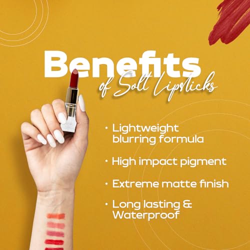 Introduction to SOLT Matte Lipstick: Introduce the SOLT Matte Lipstick as a game-changer in the beauty routine, with a focus on its matte finish. Highlight its standout features, such as being long-lasting, hydrating, lightweight, and the promise of a perfect lipstick for all-day wear. Long-Lasting Brilliance: Delve into the long-lasting aspect, explaining how the matte lipstick ensures a brilliant and enduring lip color that stands the test of time. Emphasize its resilience against fading, making it an ideal choice for those with a busy schedule who need a lipstick that lasts throughout the day. Hydrating & Lightweight Formula: Explore the hydrating and lightweight qualities of the lipstick, underscoring how it keeps your lips moisturized while offering a comfortable and weightless feel. Convey the idea that beauty doesn't have to compromise on comfort, and this matte lipstick strikes the perfect balance. Softening, Smoothening, and Moisturizing Properties: Highlight the triple benefits of softening, smoothening, and moisturizing. Describe how the lipstick contributes to soft, smooth, and well-hydrated lips, enhancing not just the color but the overall texture and health of the lips. Creamy Lipstick for Perfect Application: Conclude by accentuating the creamy texture of the lipstick, making it perfect for easy and precise application. Describe how the creamy formula glides smoothly onto the lips, making it an ideal choice for those who seek a perfect lipstick that combines style and ease.