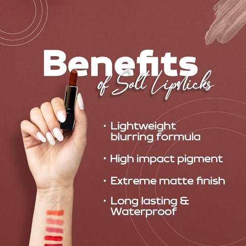 Introduction to SOLT Matte Lipstick: Begin by introducing the SOLT Matte Lipstick, highlighting its key features such as its matte finish, long-lasting quality, and unique formulation that includes hydrating, lightweight, softening, smoothening, and moisturizing properties. Emphasize its suitability for regular wear and its potential to elevate the quality and style of a woman's makeup routine. Long-Lasting Brilliance: Delve into the long-lasting aspect of the SOLT Matte Lipstick, elaborating on its ability to provide brilliant lip color that endures throughout the day. Describe scenarios where the lipstick remains vibrant, making it a reliable choice for individuals with a busy schedule. Hydrating & Lightweight Formula: Explore the hydrating and lightweight qualities of the lipstick, explaining how it keeps the lips moisturized while offering a comfortable and weightless feel. Convey the message that this lipstick strikes a perfect balance between beauty and comfort, making it an ideal choice for daily wear. Softening, Smoothening, and Moisturizing Properties: Highlight the triple benefits of softening, smoothening, and moisturizing that the SOLT Matte Lipstick provides. Discuss how the formula contributes to soft, smooth, and well-hydrated lips, enhancing not just the color but the overall texture and health of the lips. Creamy Lipstick for Perfect Application: Conclude by accentuating the creamy texture of the lipstick, making it perfect for easy and precise application. Discuss how the creamy formula glides smoothly onto the lips, making it an ideal choice for those who seek a perfect lipstick that combines style and ease. Encourage users to experience the luxurious and lasting impact of SOLT Matte Lipstick for a flawless and elevated beauty routine.