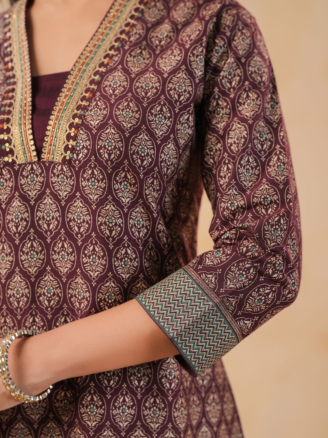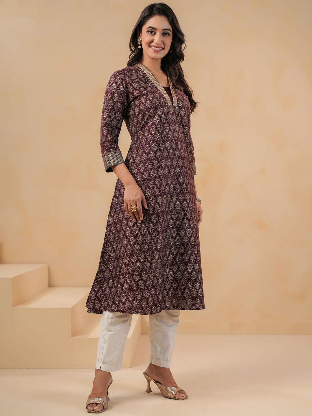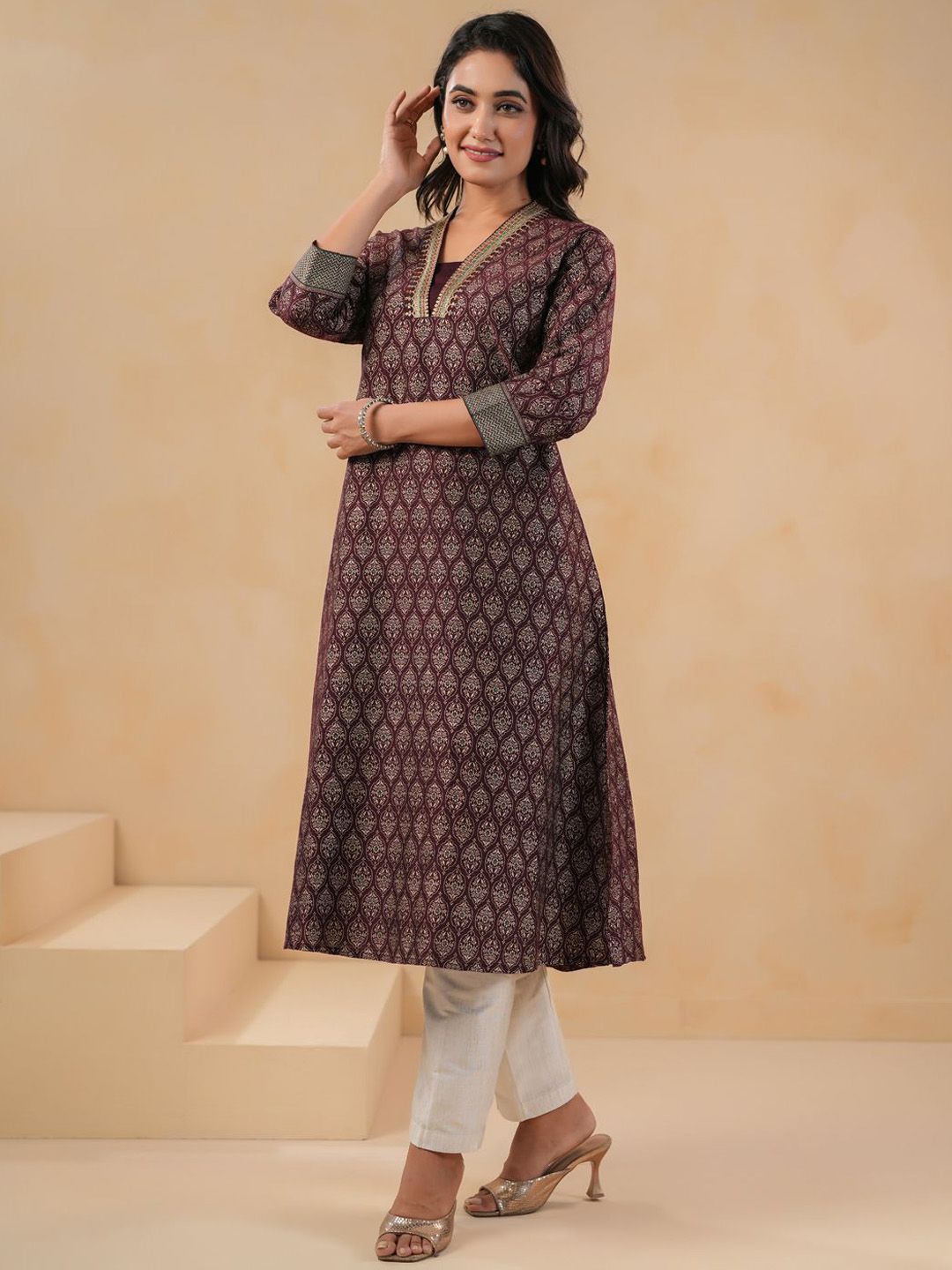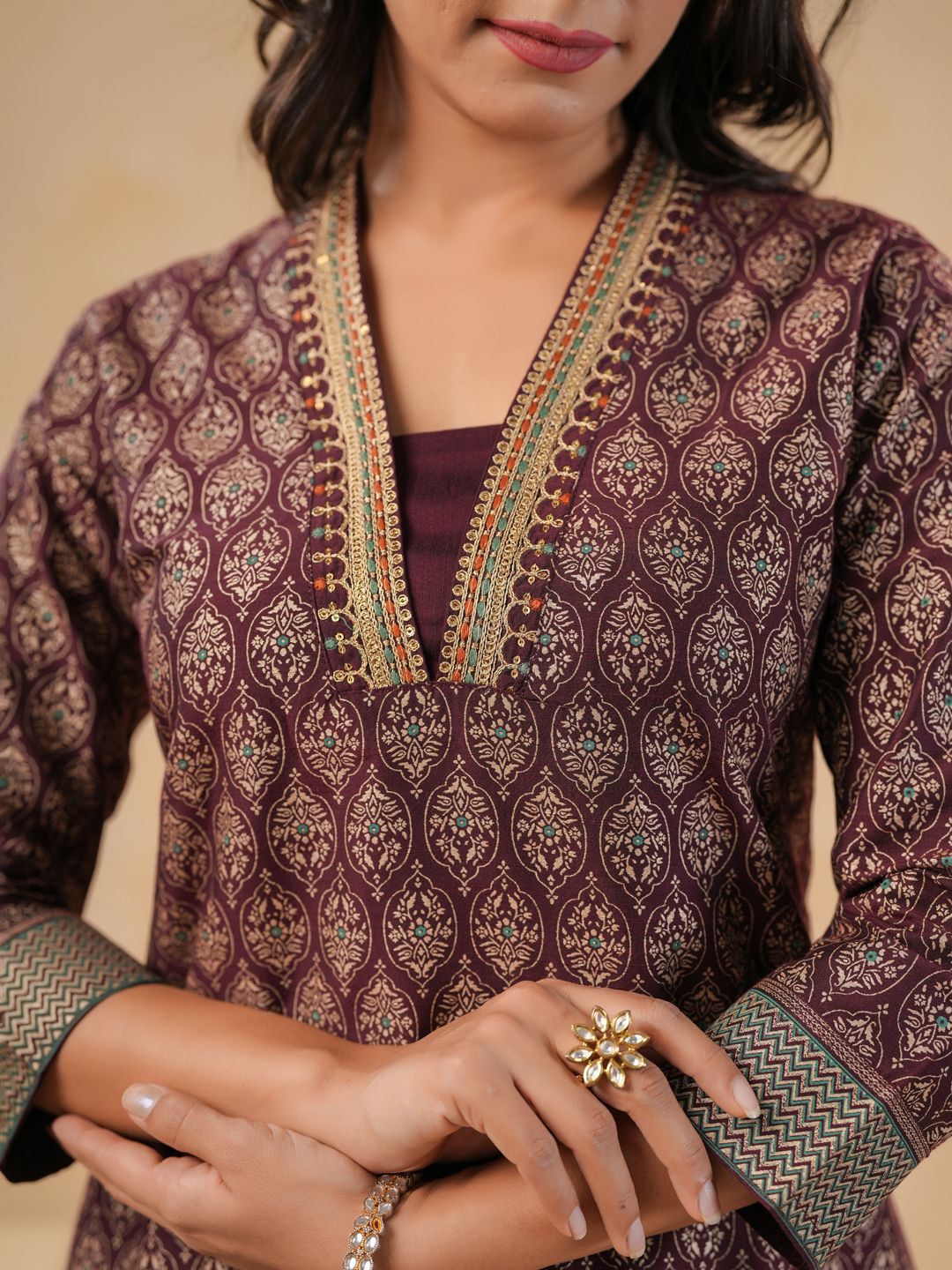 Span Floral Printed V-Neck A-Line Pure Silk Kurta With Trousers