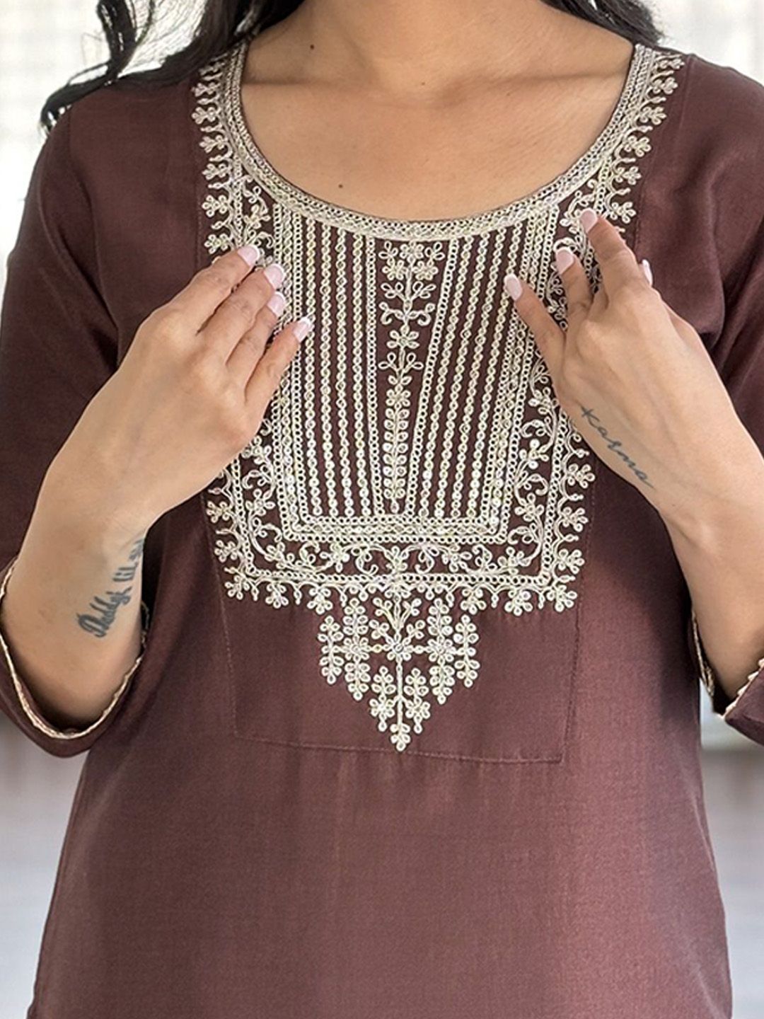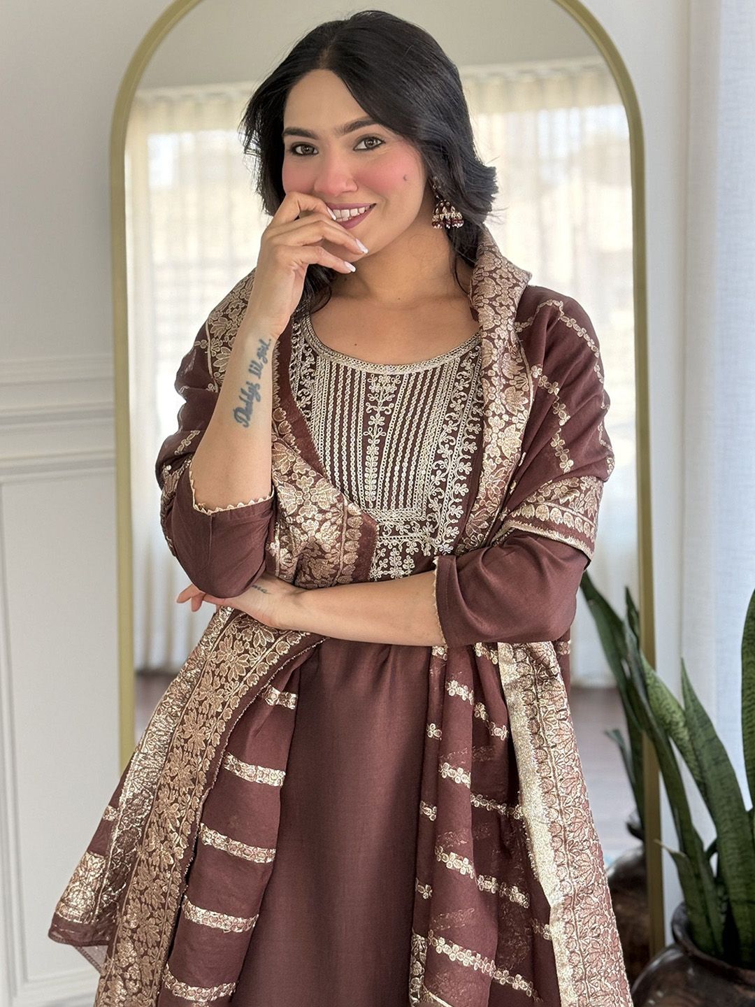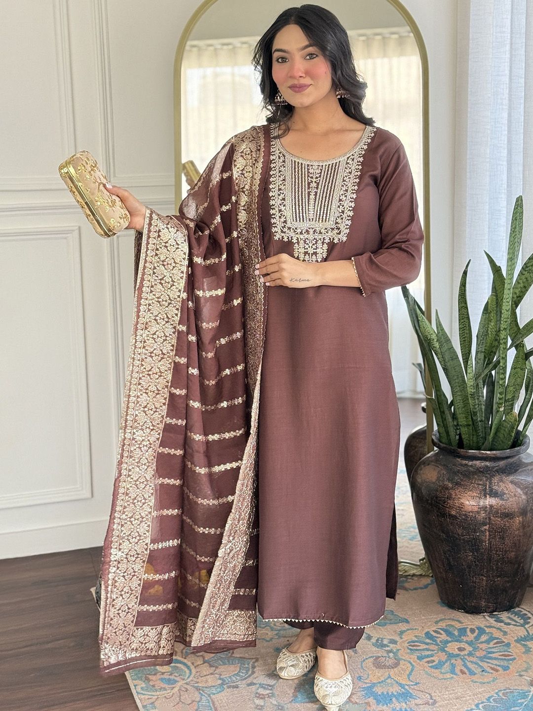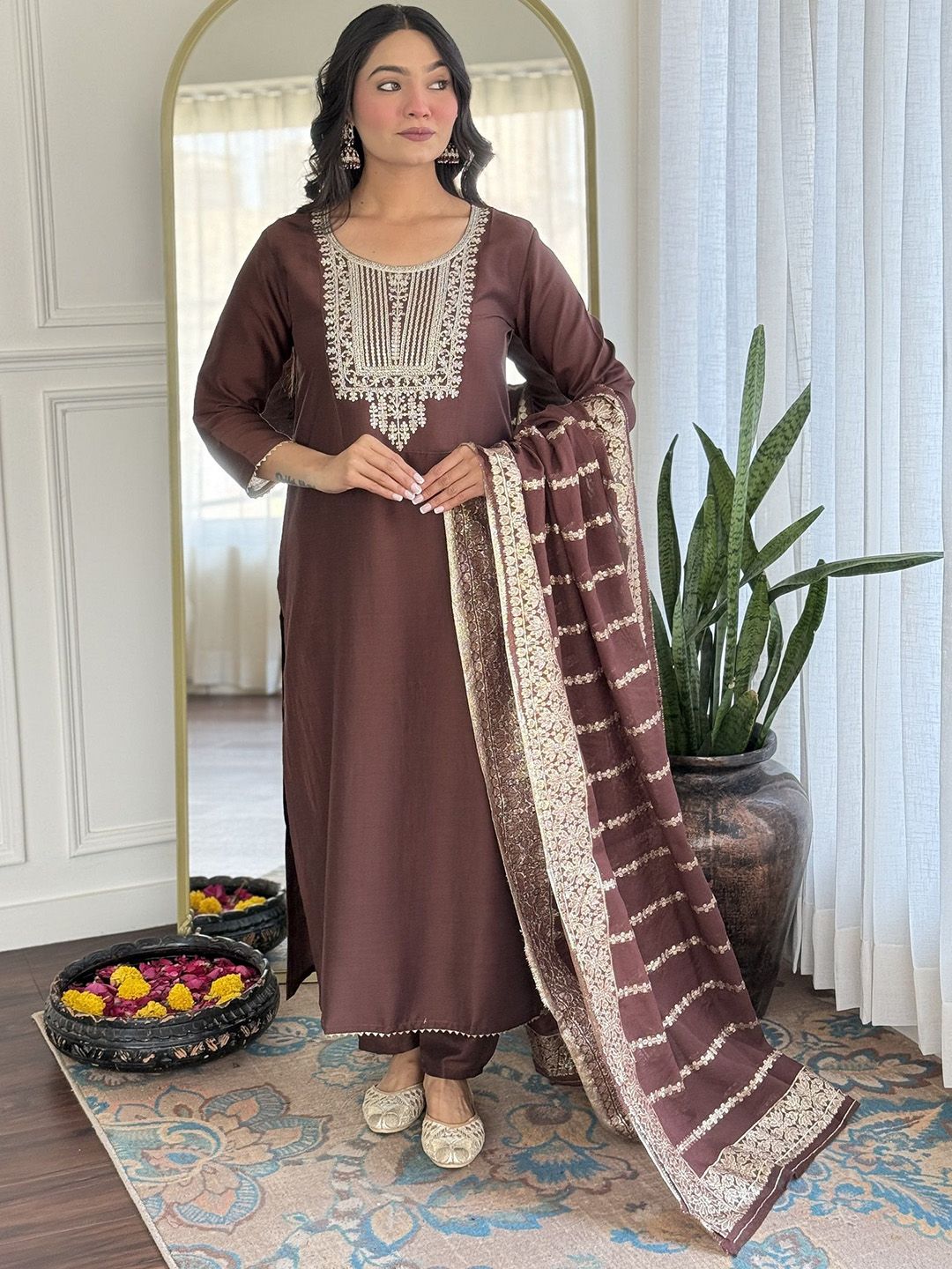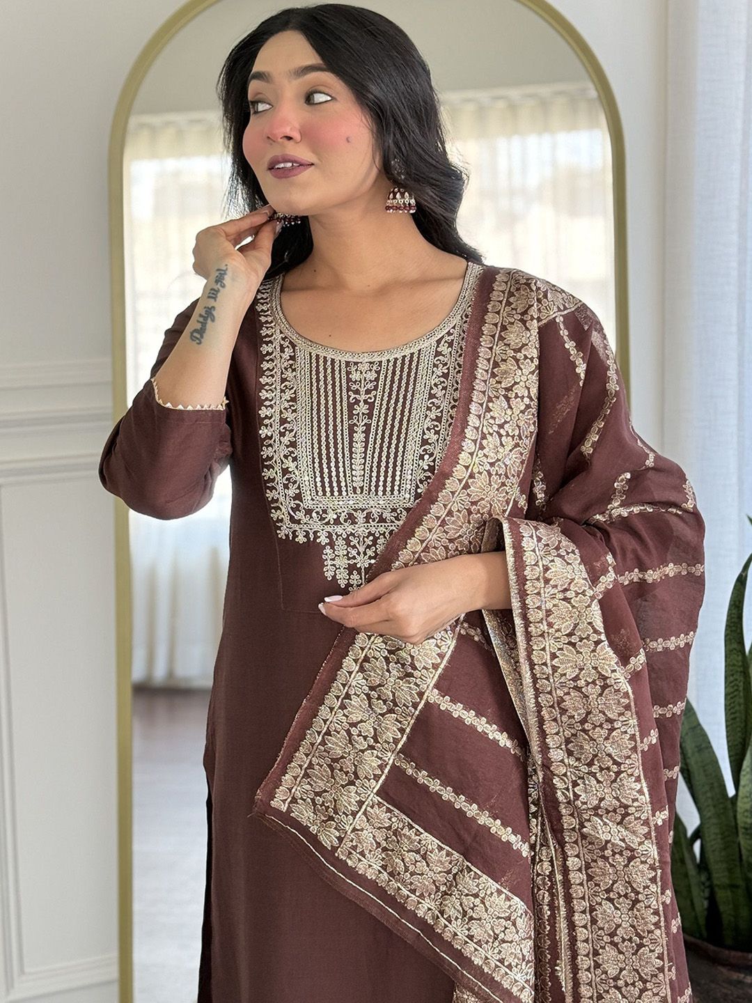 SRILICA Floral Yoke Design Thread Work Straight Kurta With Trousers & Dupatta